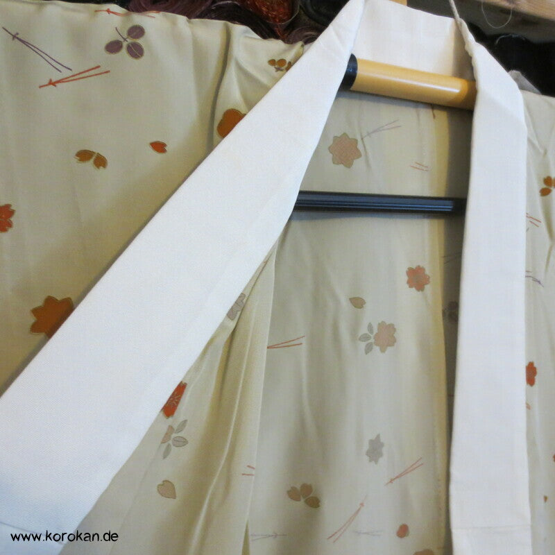 Vintage ungefütterter Juban Unter Kimono Seidencrepe fallende Herbstblätter auf graubeige, hellem Kragen, teilgefüttert mit Obermaterial