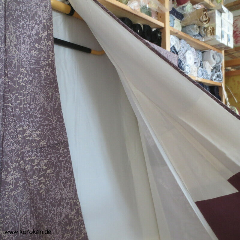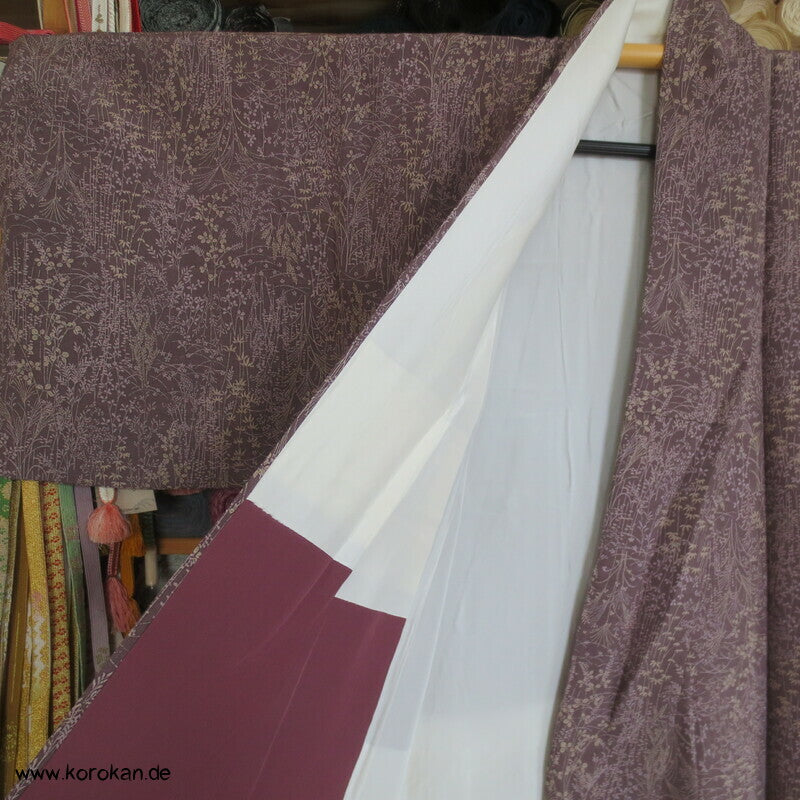 Vintage Komon Kimono grauer Chirimen Crepe zarten Gräsern auf mauve, unteres Teilfutter Seidencrepe rosamauve, helles Seidenfutter oben