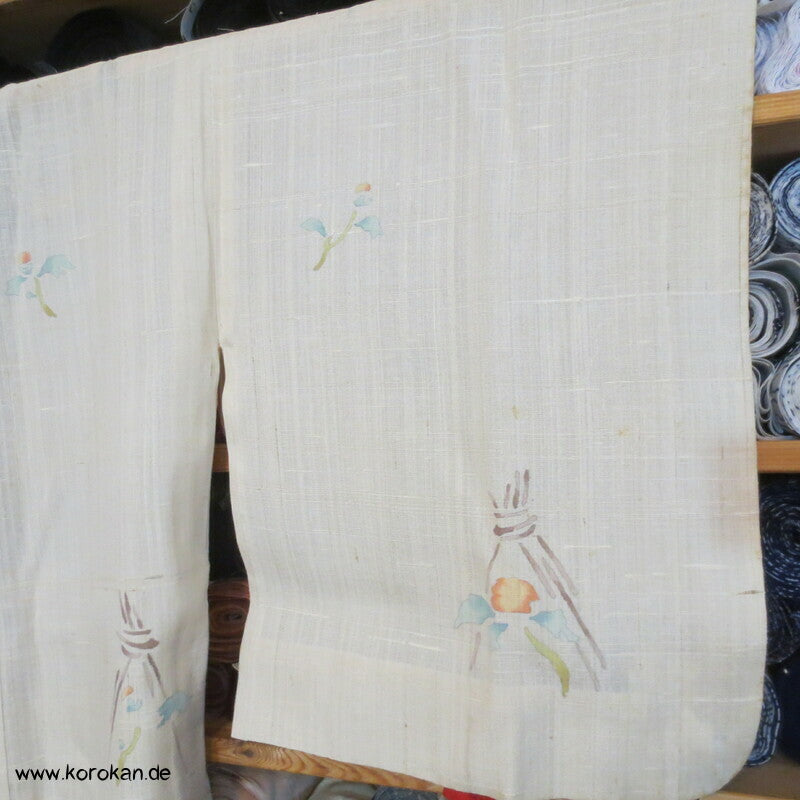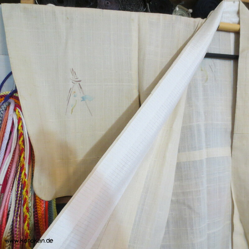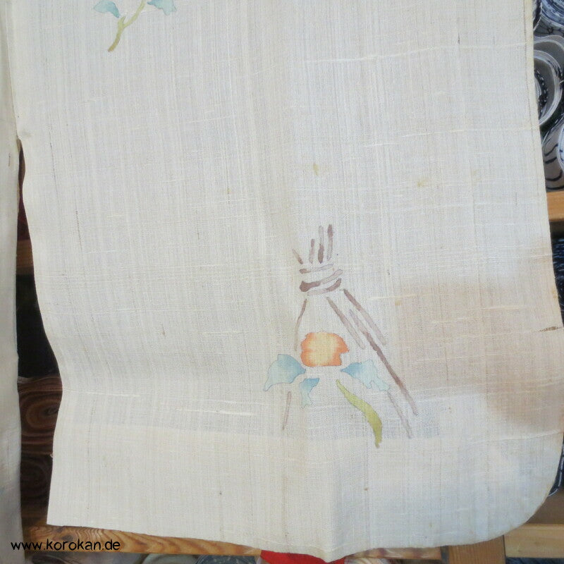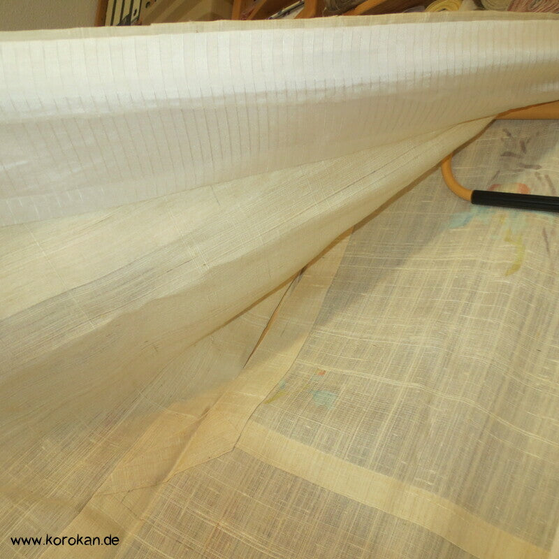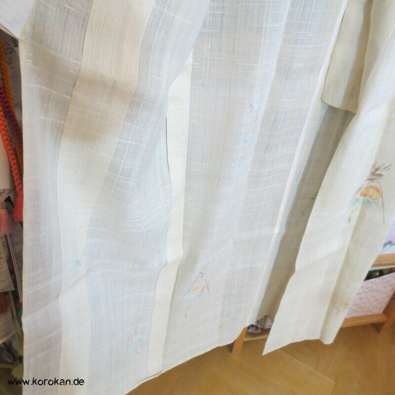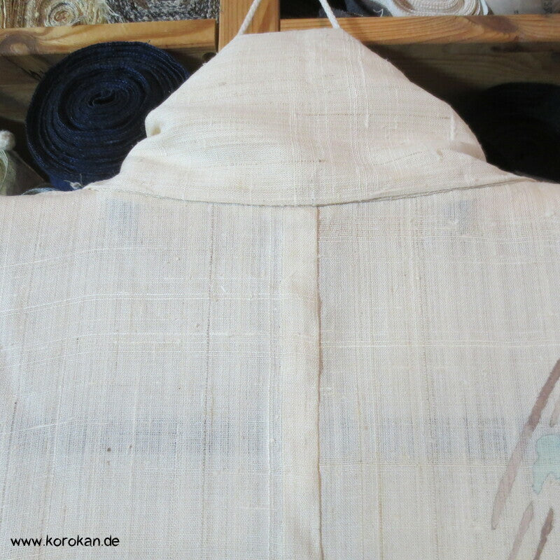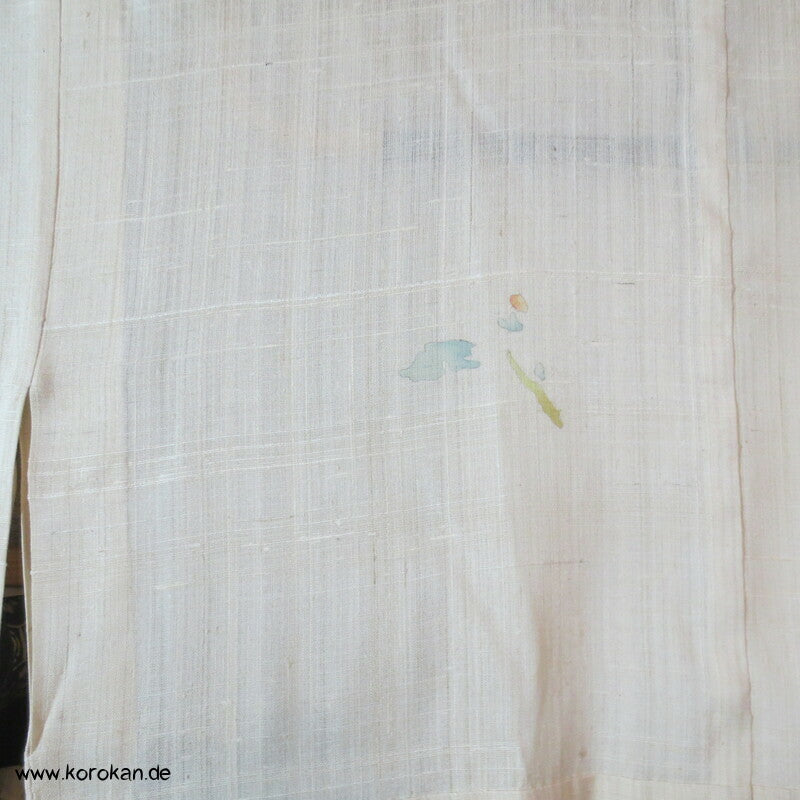 Vintage Hitoe ungefütterter Kimono aus ganz besonderem Material - handgefertigt, wohl auch handgesponnen, am ehesten Bananenfasern, oder andere Baumbastfasern, etwas steif und glänzend glatt. Seltenes pflanzliches Material - Bemalt mit einzelnen Motiven
