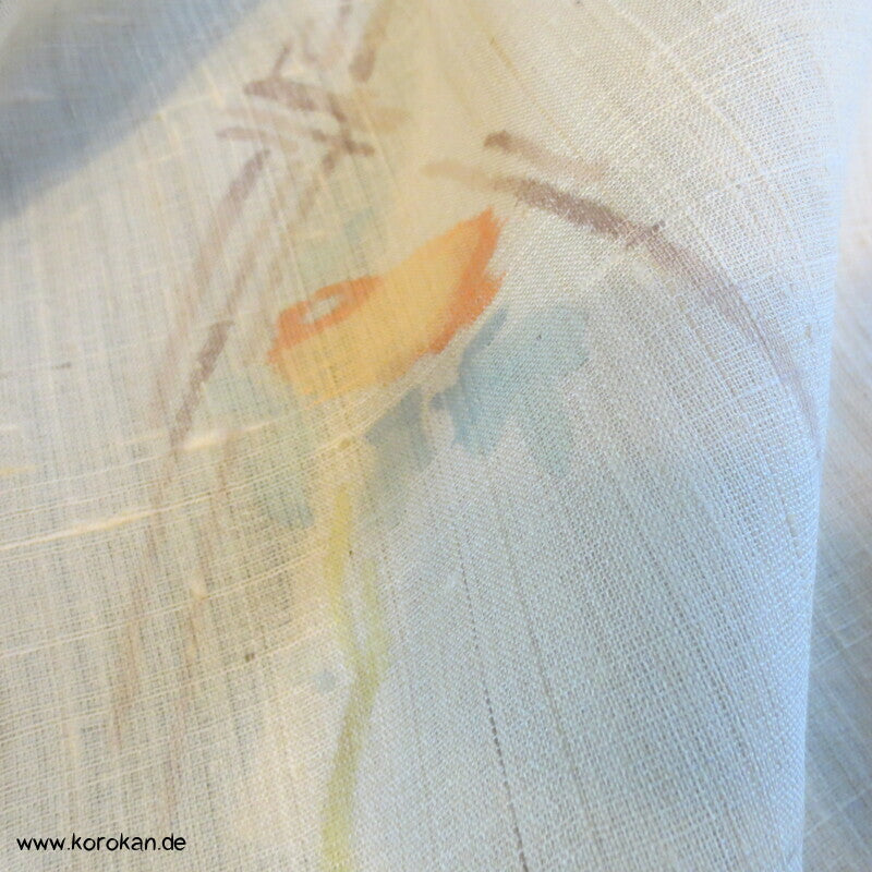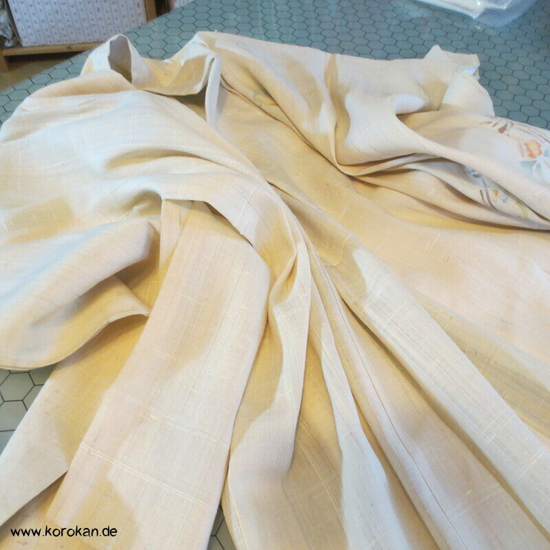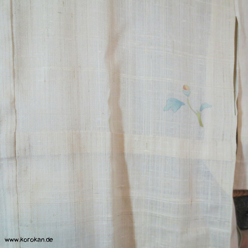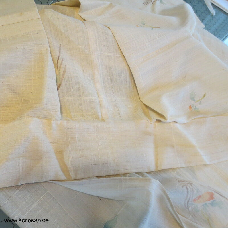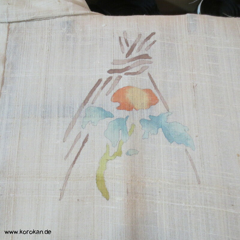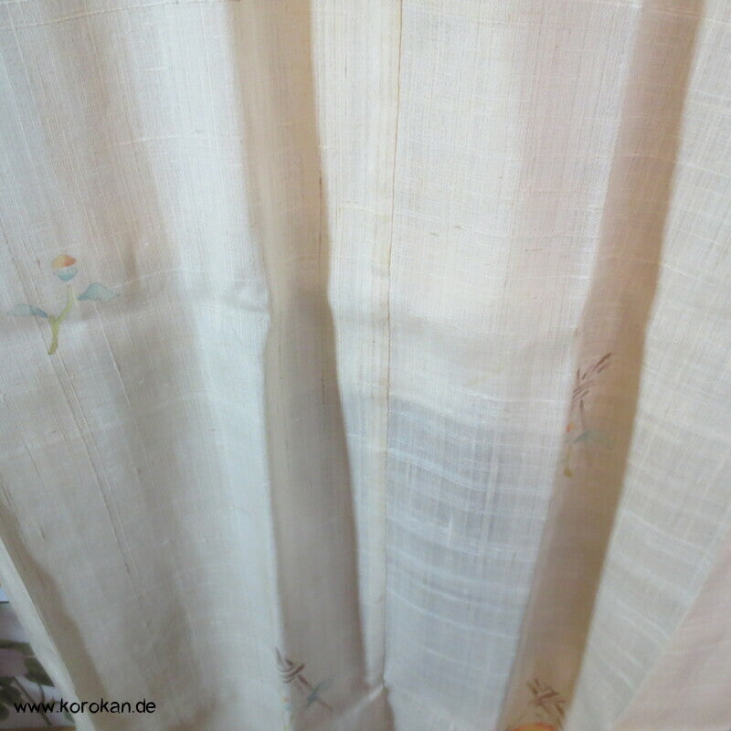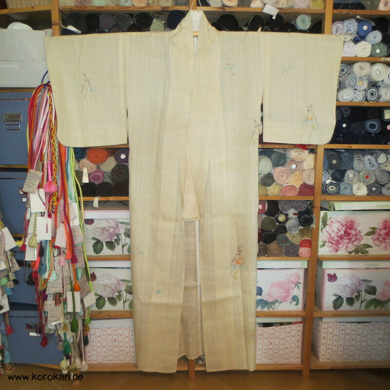 Vintage Hitoe ungefütterter Kimono aus ganz besonderem Material - handgefertigt, wohl auch handgesponnen, am ehesten Bananenfasern, oder andere Baumbastfasern, etwas steif und glänzend glatt. Seltenes pflanzliches Material - Bemalt mit einzelnen Motiven