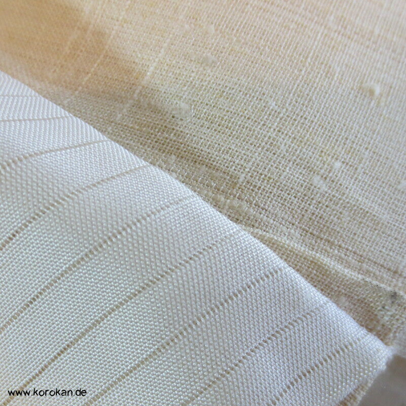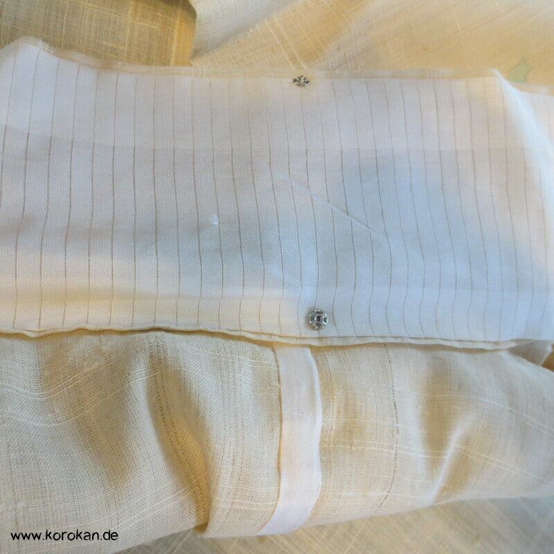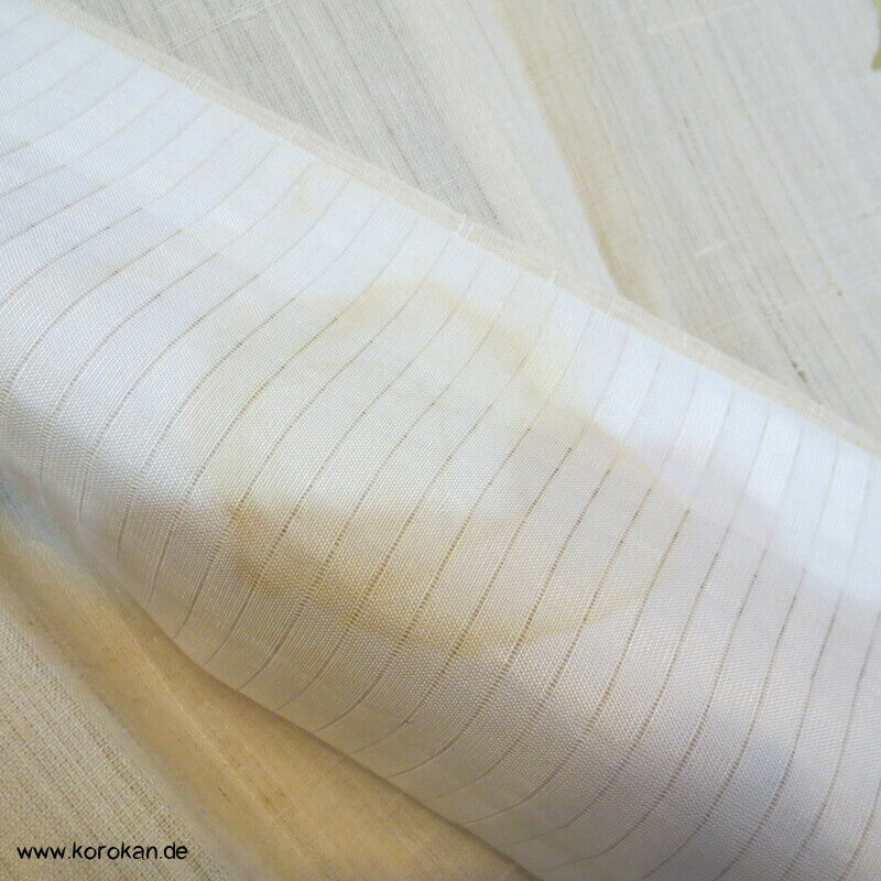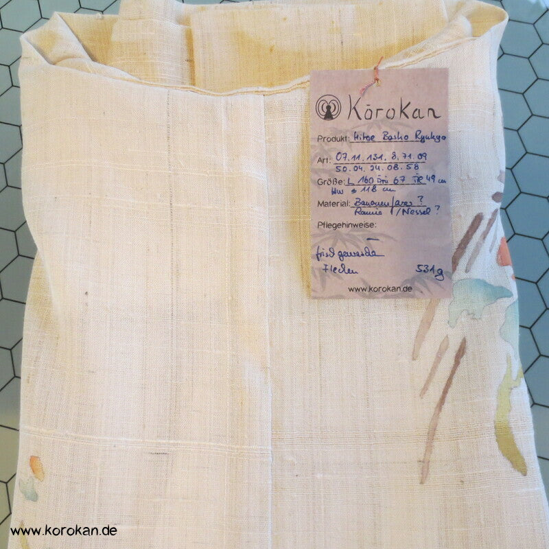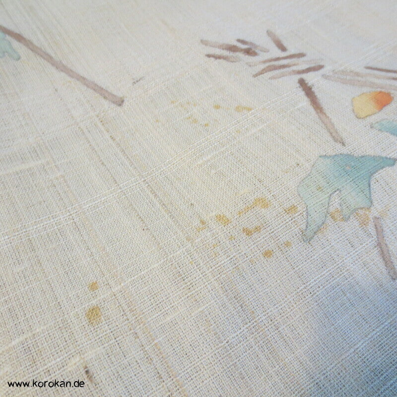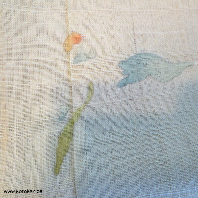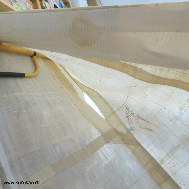 Vintage Hitoe ungefütterter Kimono aus ganz besonderem Material - handgefertigt, wohl auch handgesponnen, am ehesten Bananenfasern, oder andere Baumbastfasern, etwas steif und glänzend glatt. Seltenes pflanzliches Material - Bemalt mit einzelnen Motiven