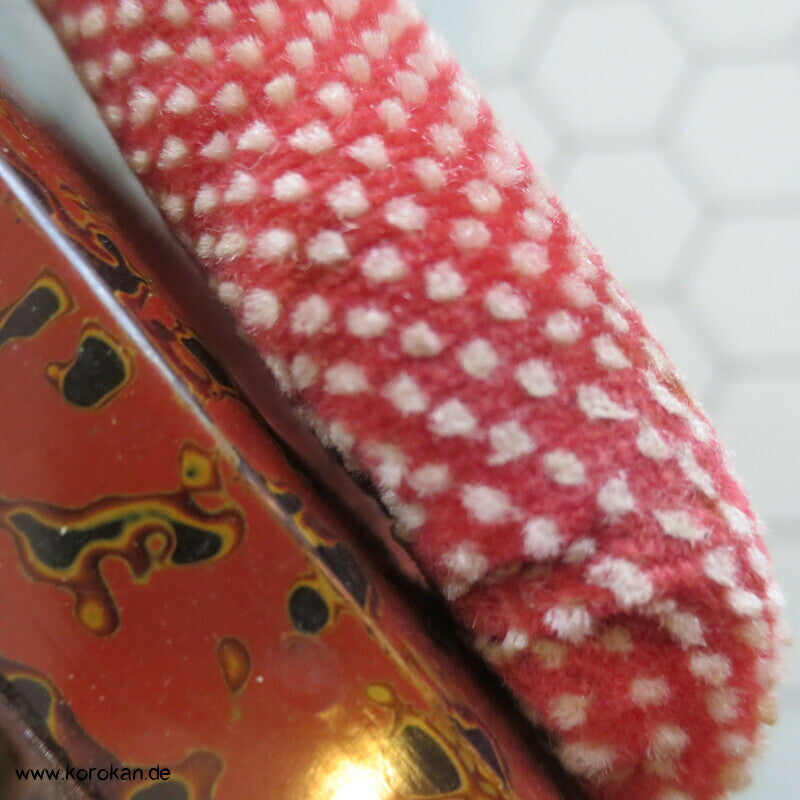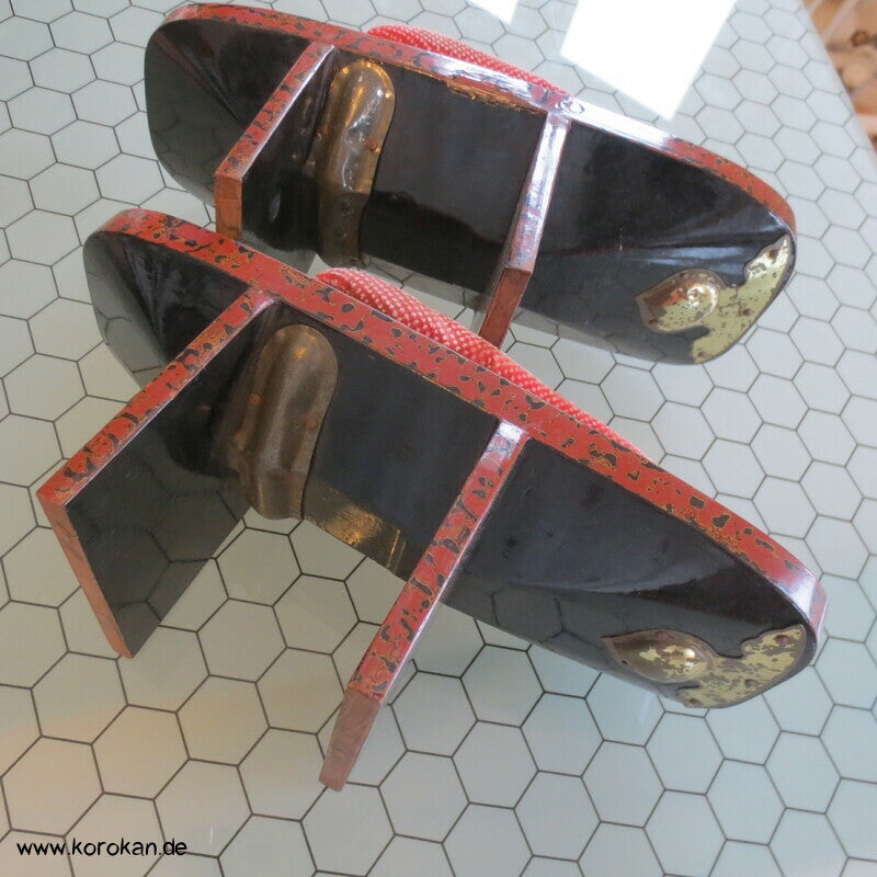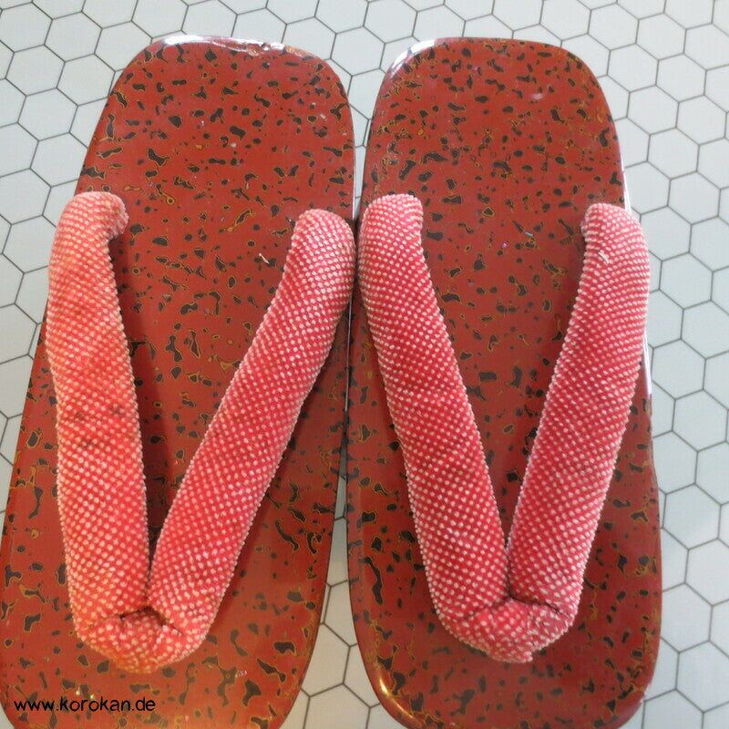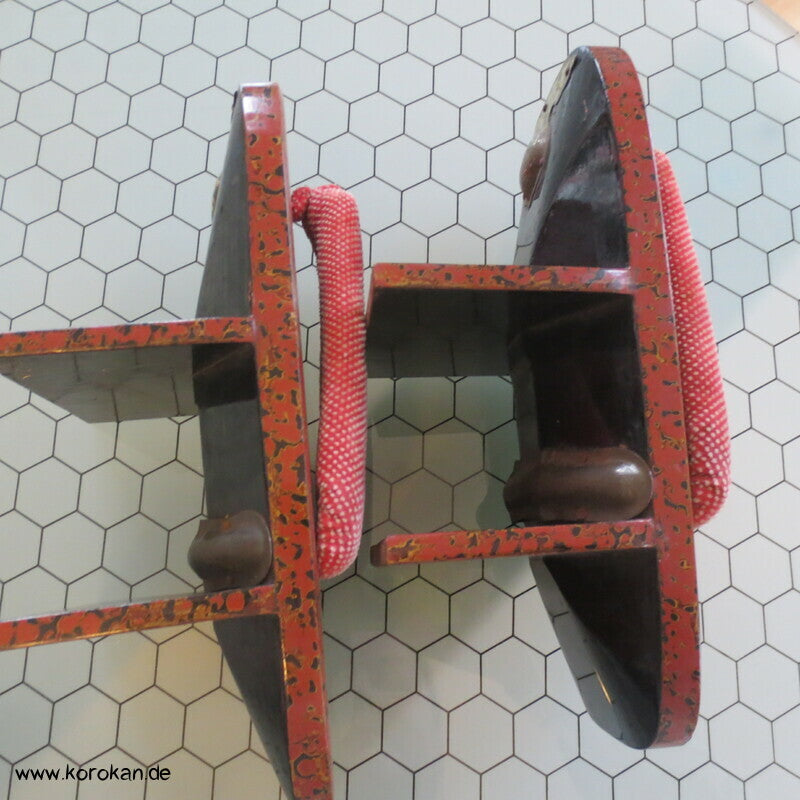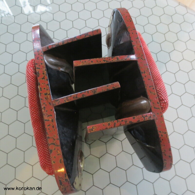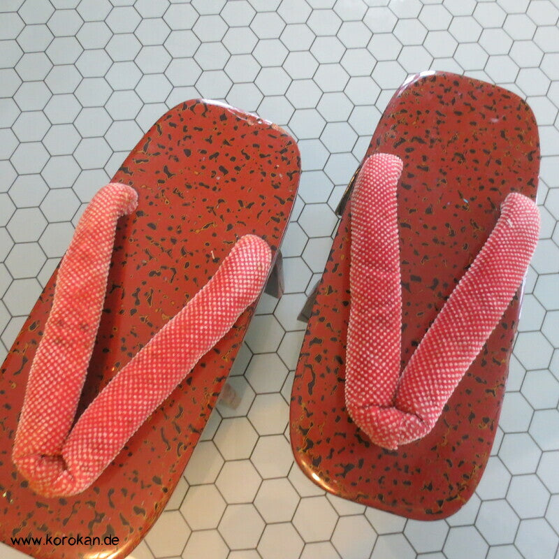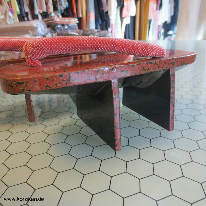 Vintage, eher antike hohe Stelzen Geta holz lackiert mit rot schwarzem meliertem Muster mit Riemen aus gepunktetem Samtstoff