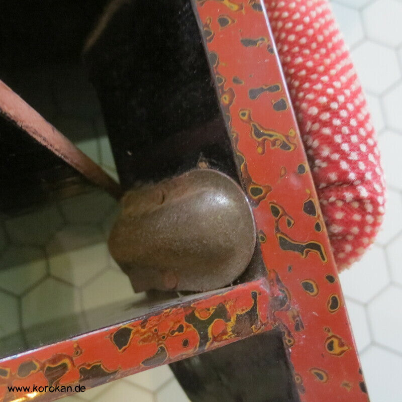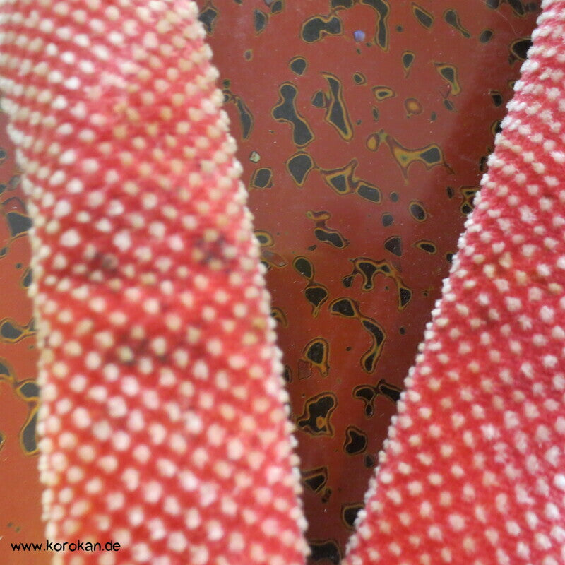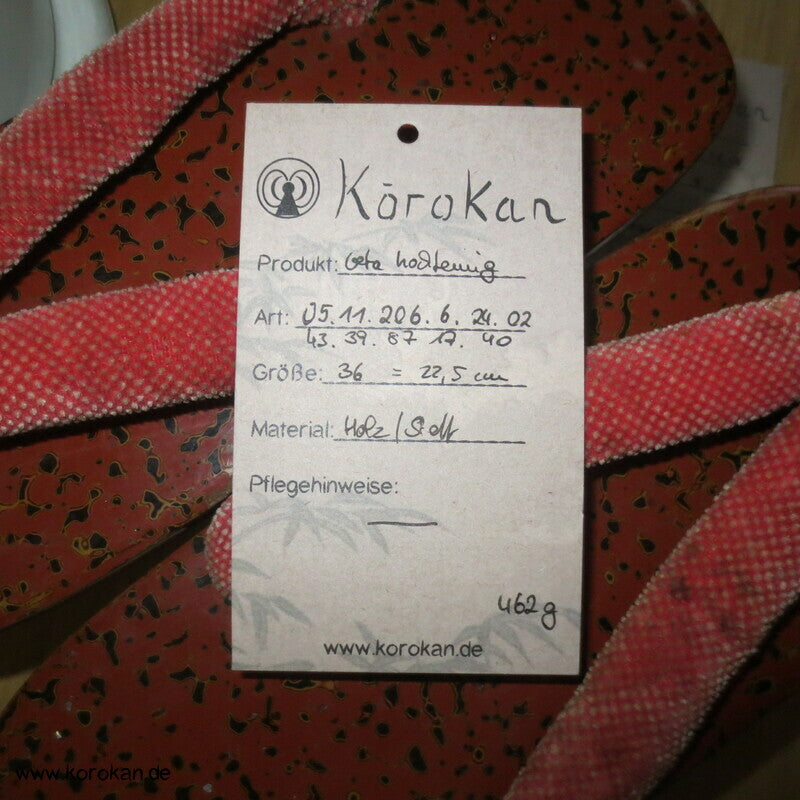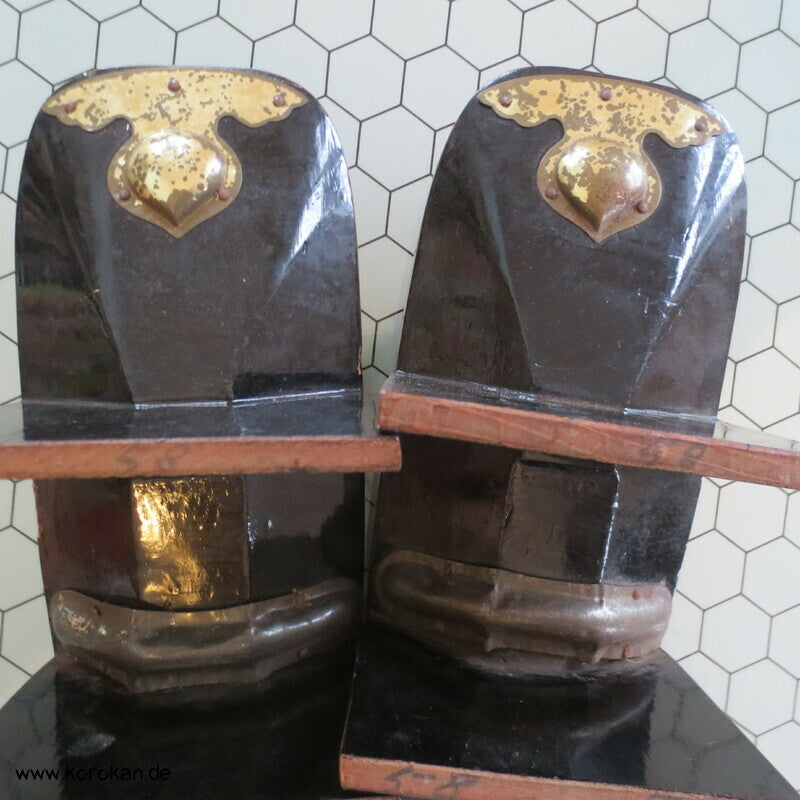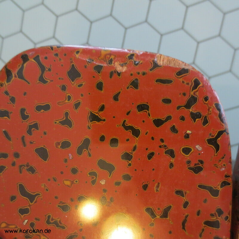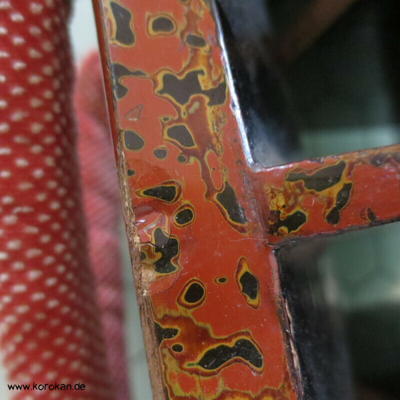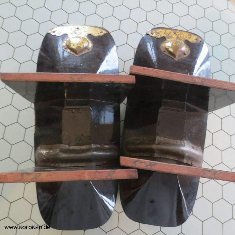 Vintage, eher antike hohe Stelzen Geta holz lackiert mit rot schwarzem meliertem Muster mit Riemen aus gepunktetem Samtstoff