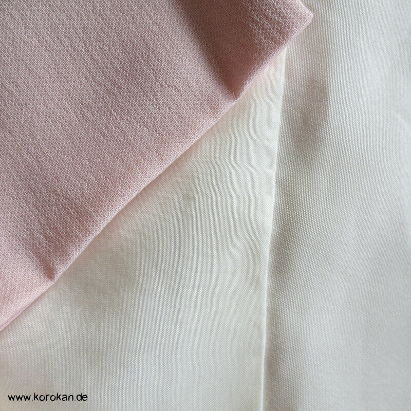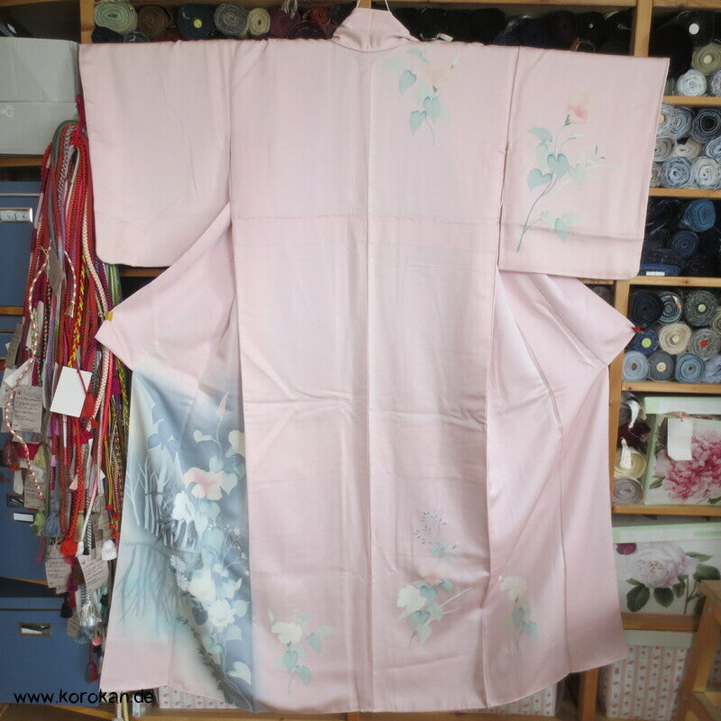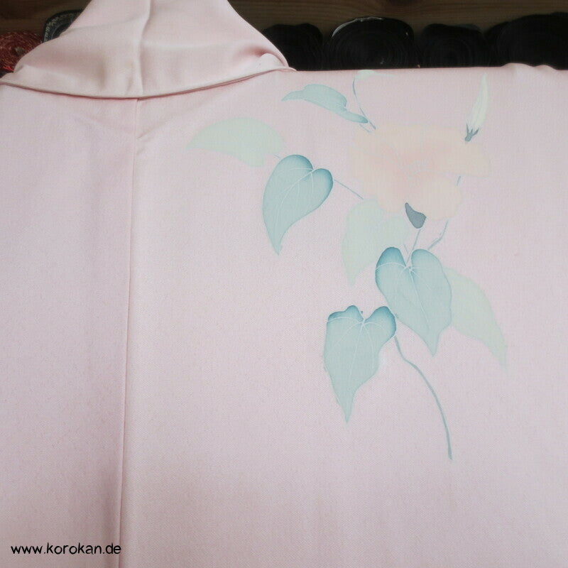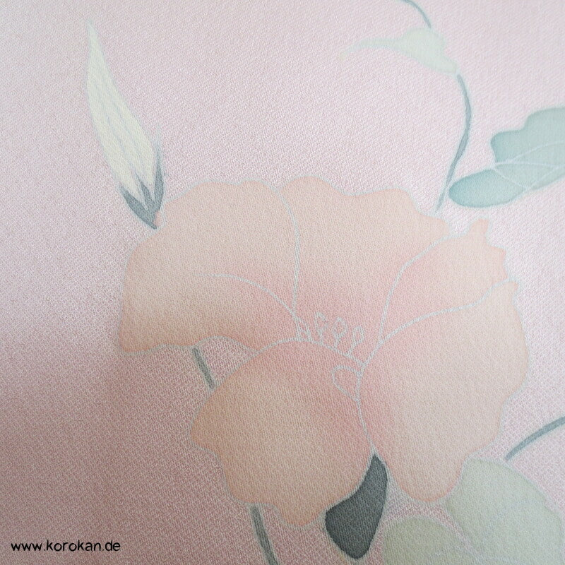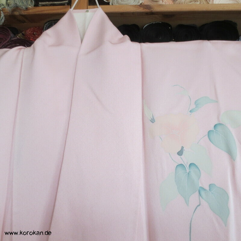 Vintage Homongi Kimono handgemalte Ackerwinden und andere Blüten auf blassrosa Seidendamast, feinem oberen hellen Seidenfutter und unterem Hakkake Seidencrepe mit rosa Bokashi Verlaufsrand