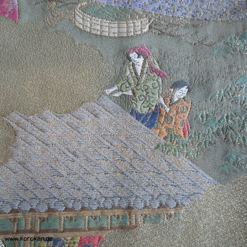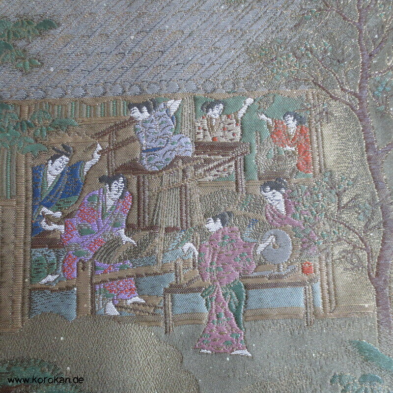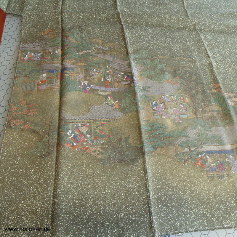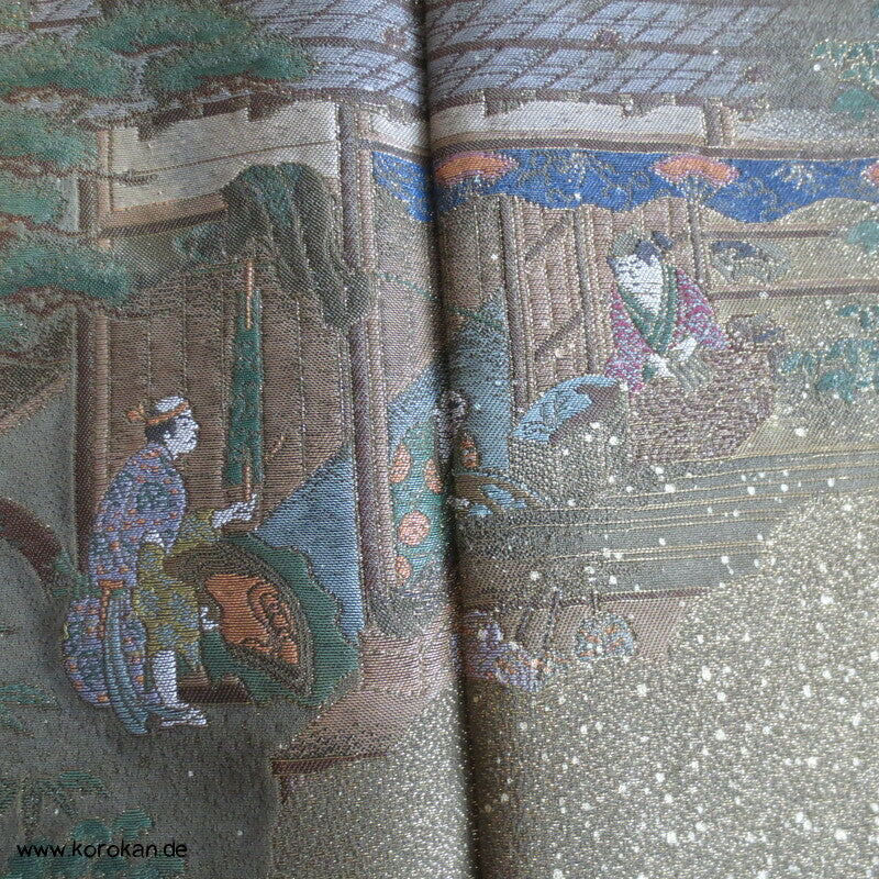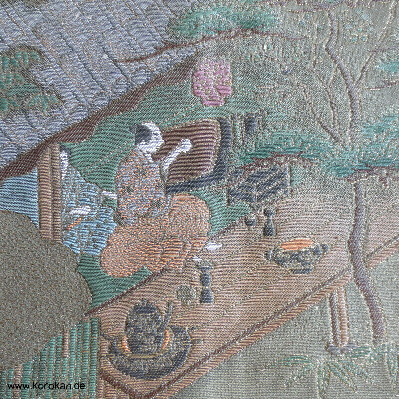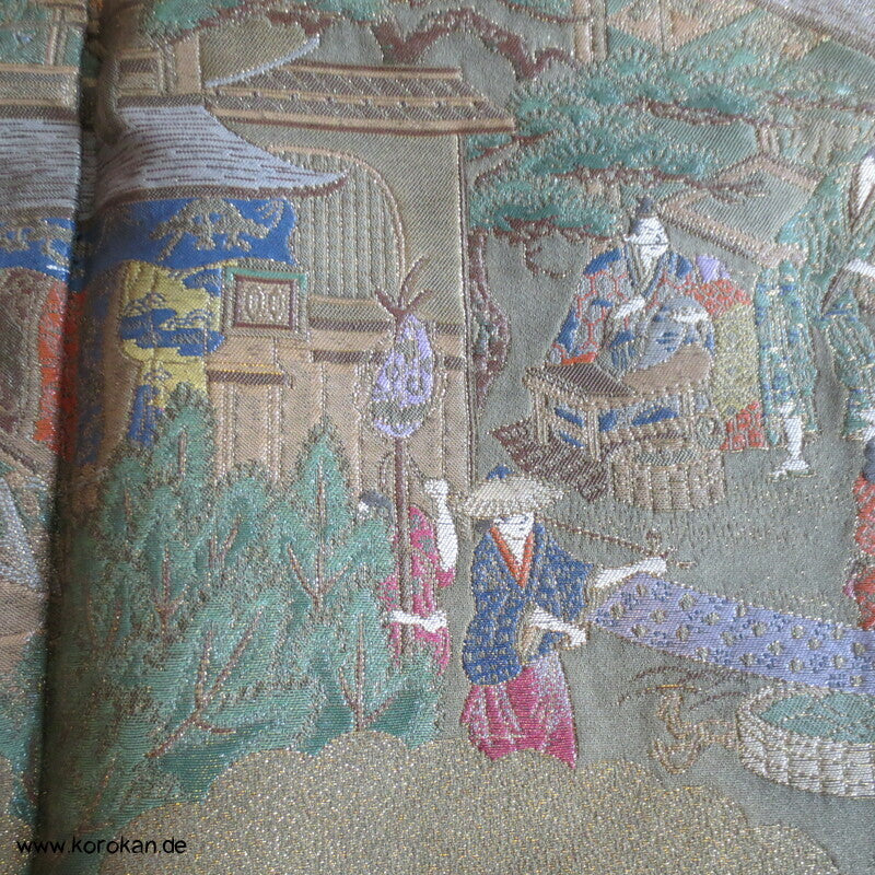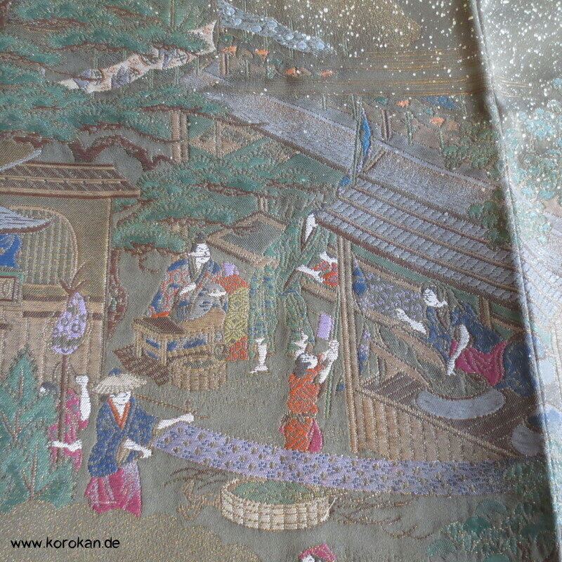 Vintage Homongi Kimono auf dem eine komplette Kimono Manufaktur in Brokat Jacquardwebung dargestellt ist. Extrem feinteilig und selten