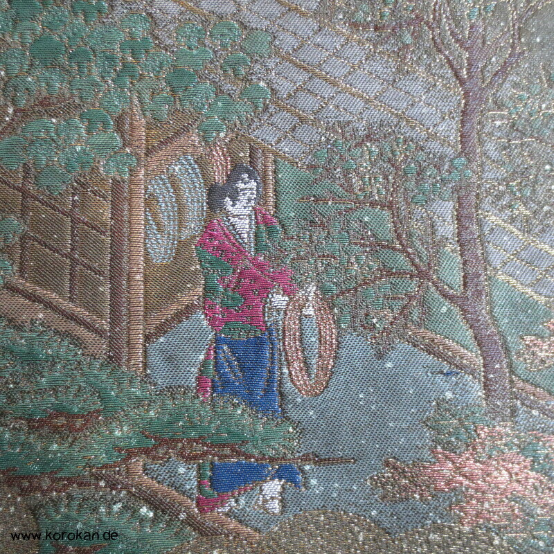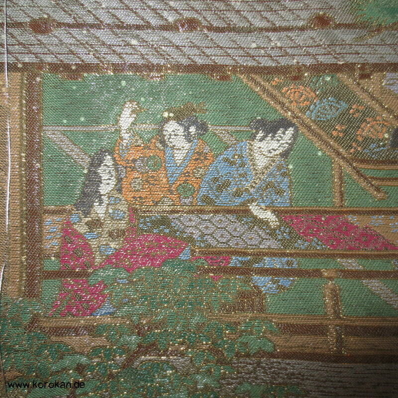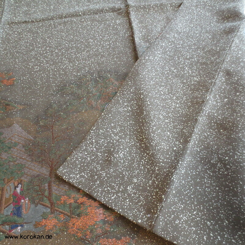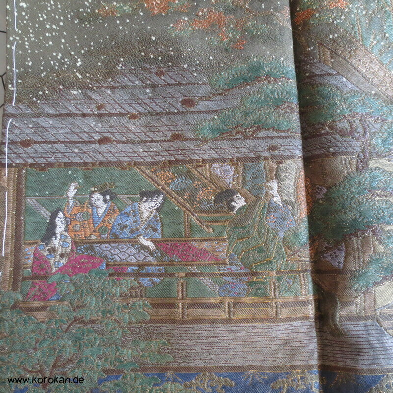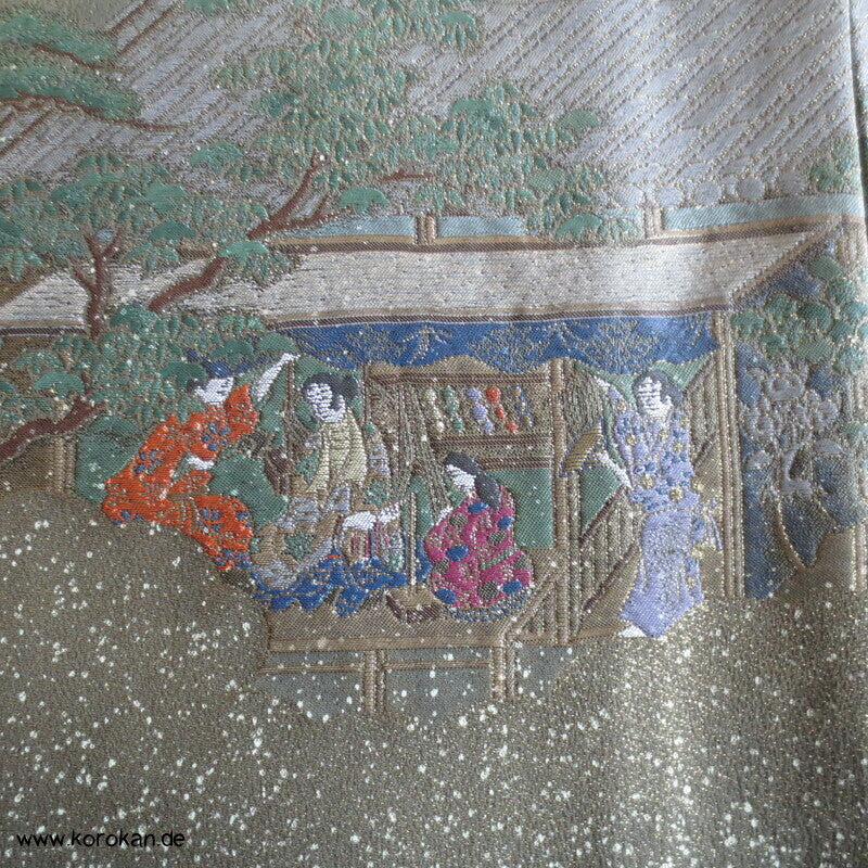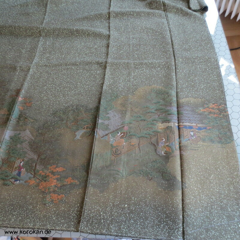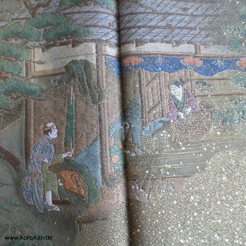 Vintage Homongi Kimono auf dem eine komplette Kimono Manufaktur in Brokat Jacquardwebung dargestellt ist. Extrem feinteilig und selten