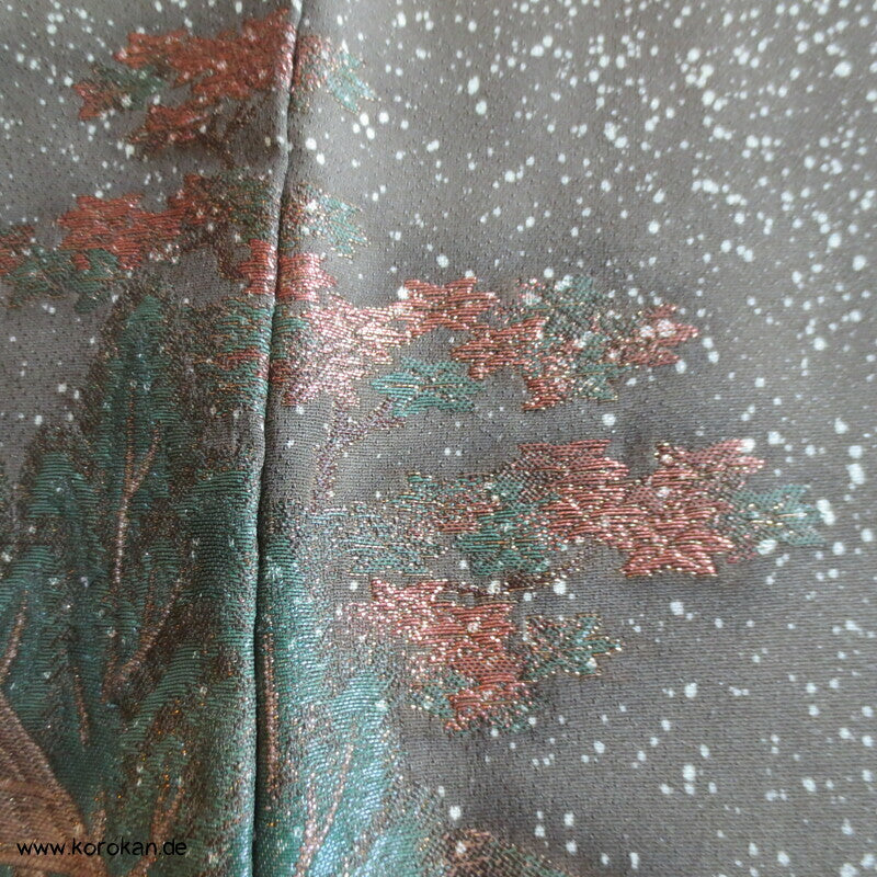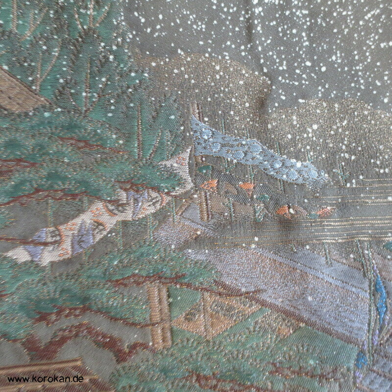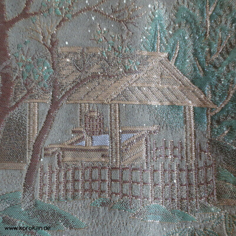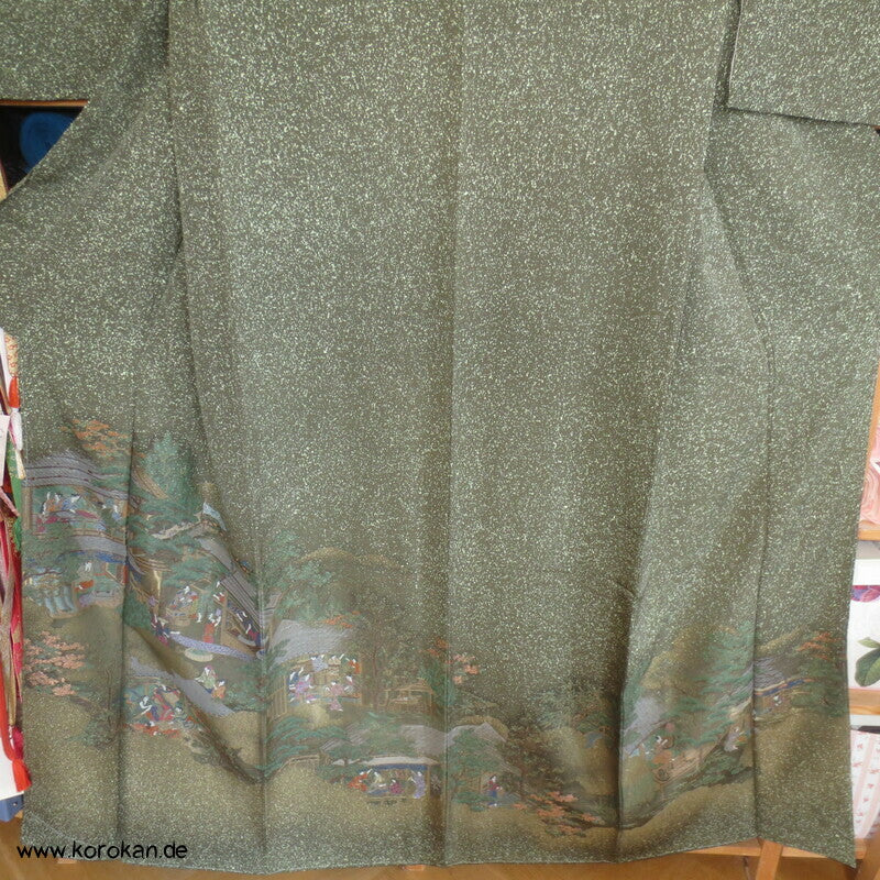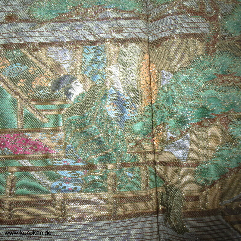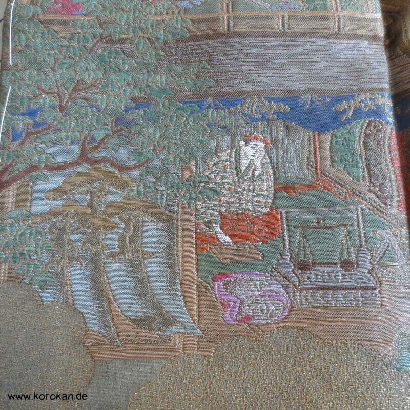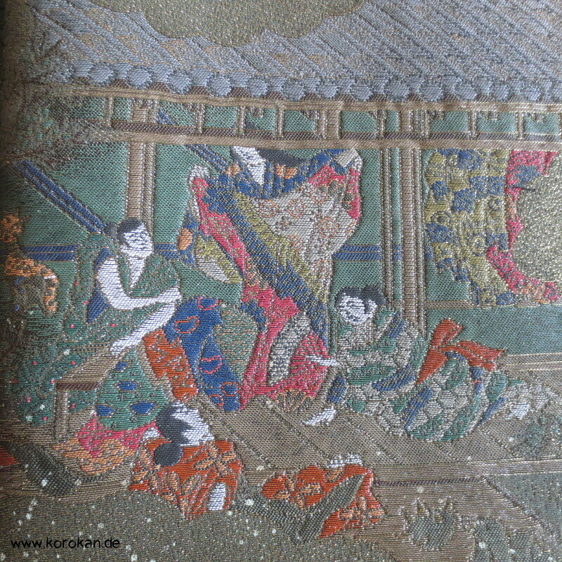 Vintage Homongi Kimono auf dem eine komplette Kimono Manufaktur in Brokat Jacquardwebung dargestellt ist. Extrem feinteilig und selten
