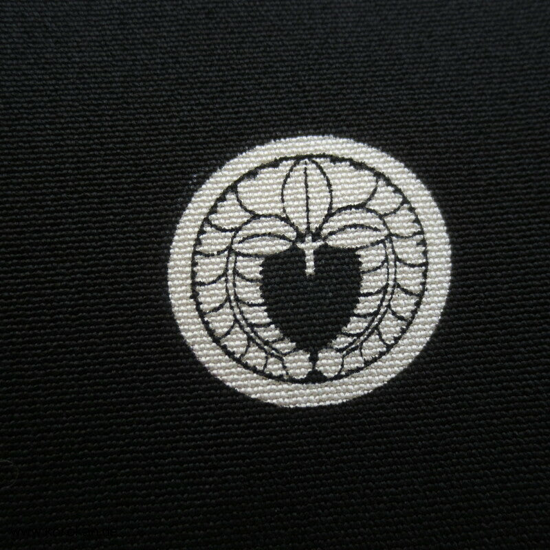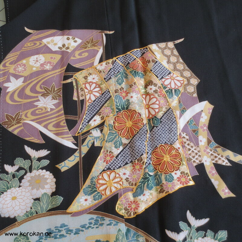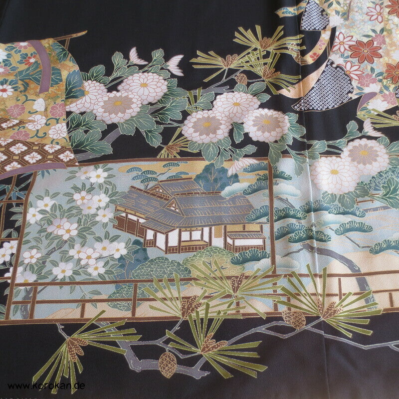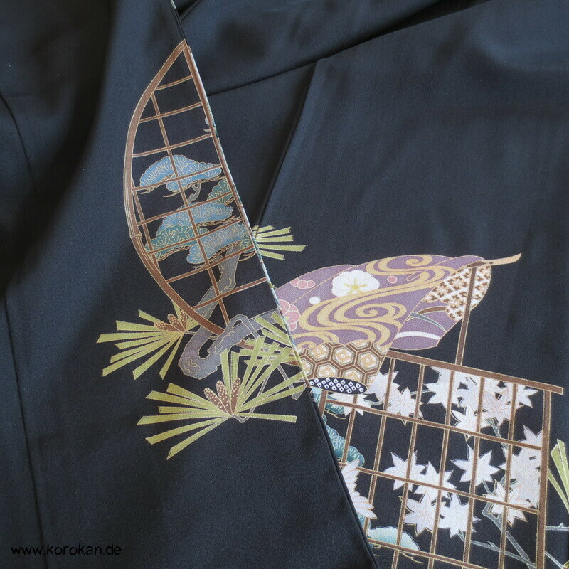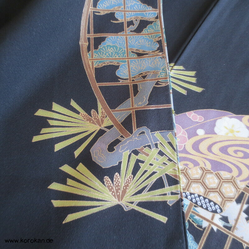 japanischer Vintage Tomesode formeller Kimono aus schwarzem Seiden Crepe, bemalt mit Kicho Kimonovorhängen und lauter unterschiedlichen typisch japanischen Symbolen, Teilstickerei, 5 Mon, oberes Futter helle Seide, Hakkake mit Motiven