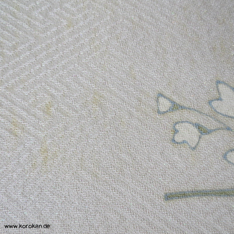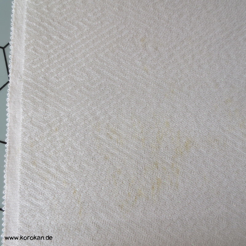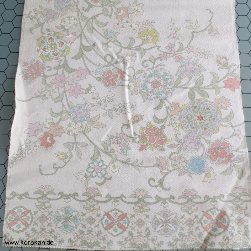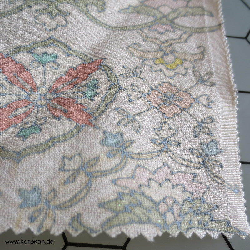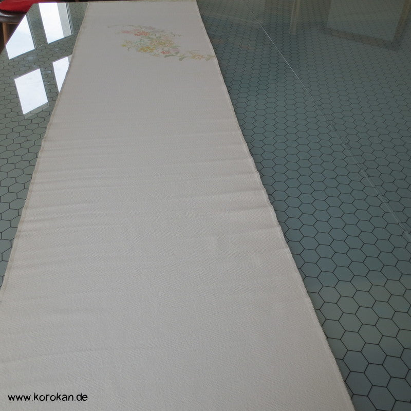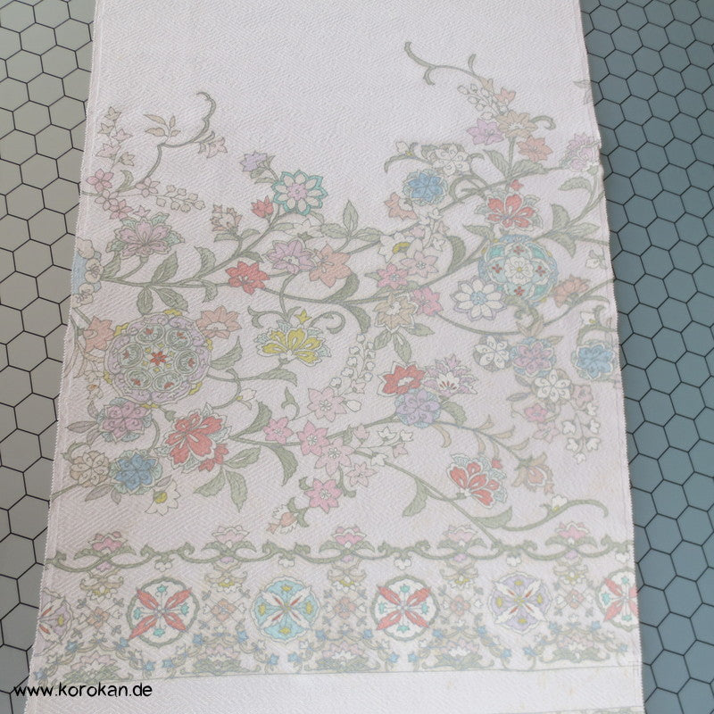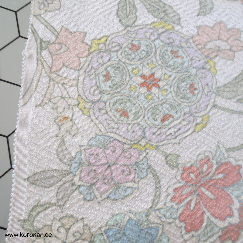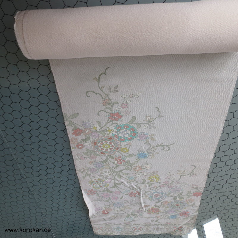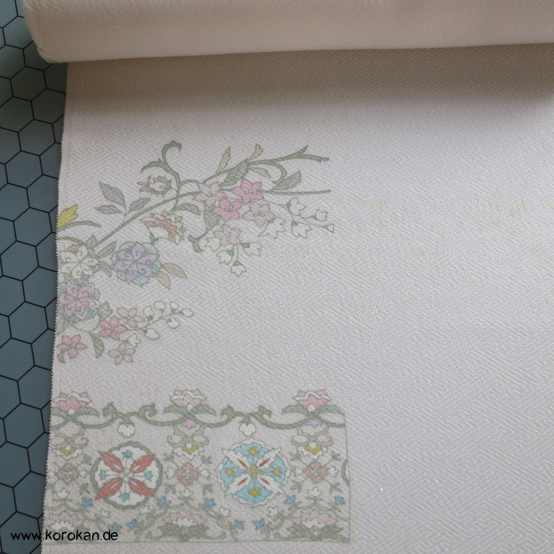 Vintage unbenutzter japanischer Stoffballen Sayagata Damast Seide mit ganz zart eingewebten Goldfäden bemalt mit Bingata Blumen für einen ganzen Homongi Kimono. Das Muster ist unregelmäßig im Stoff verteilt und wird erst durch das genaue Zusammensetzen der Bahnen ein ganzes Bild.