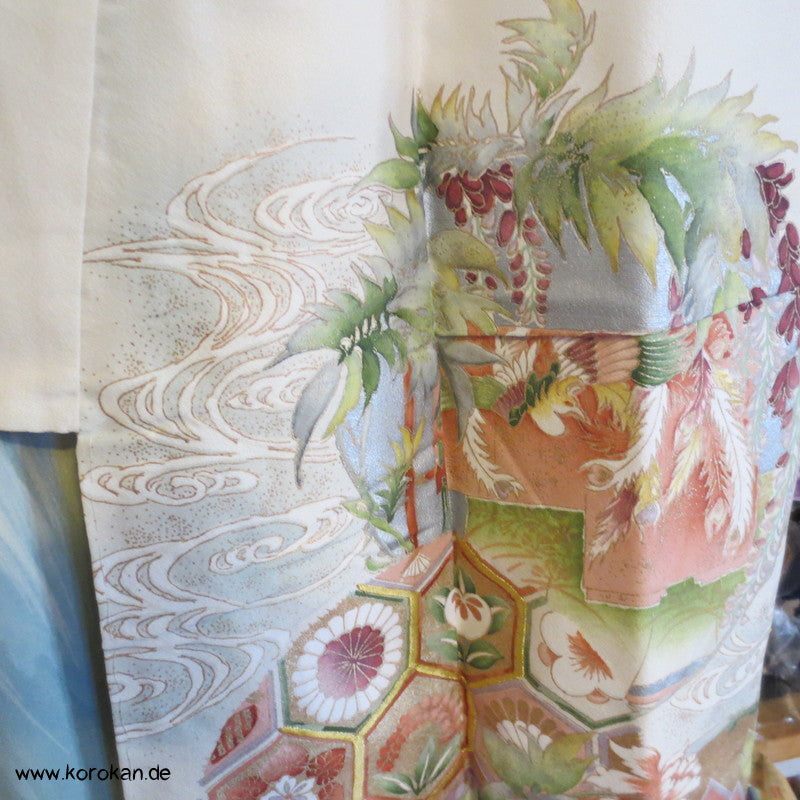 Vintage, eher antiker Homongi Kimono Seidencrepe mit riesigen bunten allover Motiven, goldgestickten Elementen, Irisrondelle, Fächer, Blüten, feinem oberen hellen Seidenfutter und unterem Hakkake Seidenfutter mit hellblauem Bokashi Verlaufsrand.