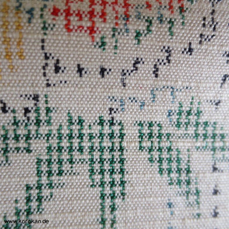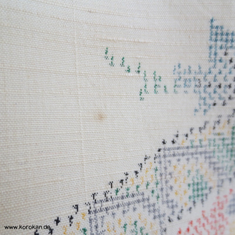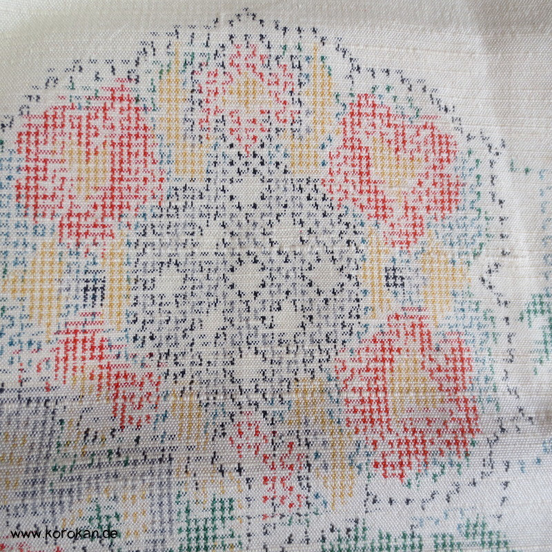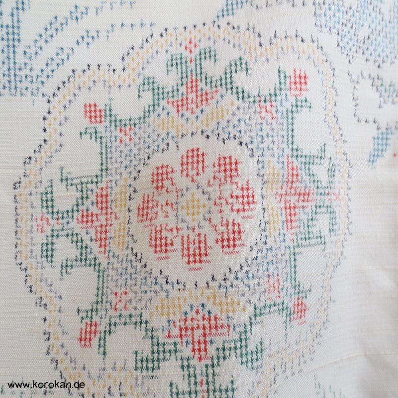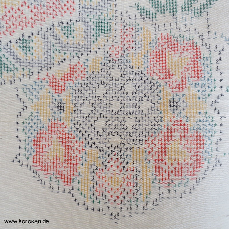 Vintage Tsumugi Seiden Komon Kimono mit Kasuri garngefärbtem bunten Spiegel, Iris Bambusmuster in hell, oberes Futter helle Seide, unteres Hakkake Futter in roter Honan Seide.