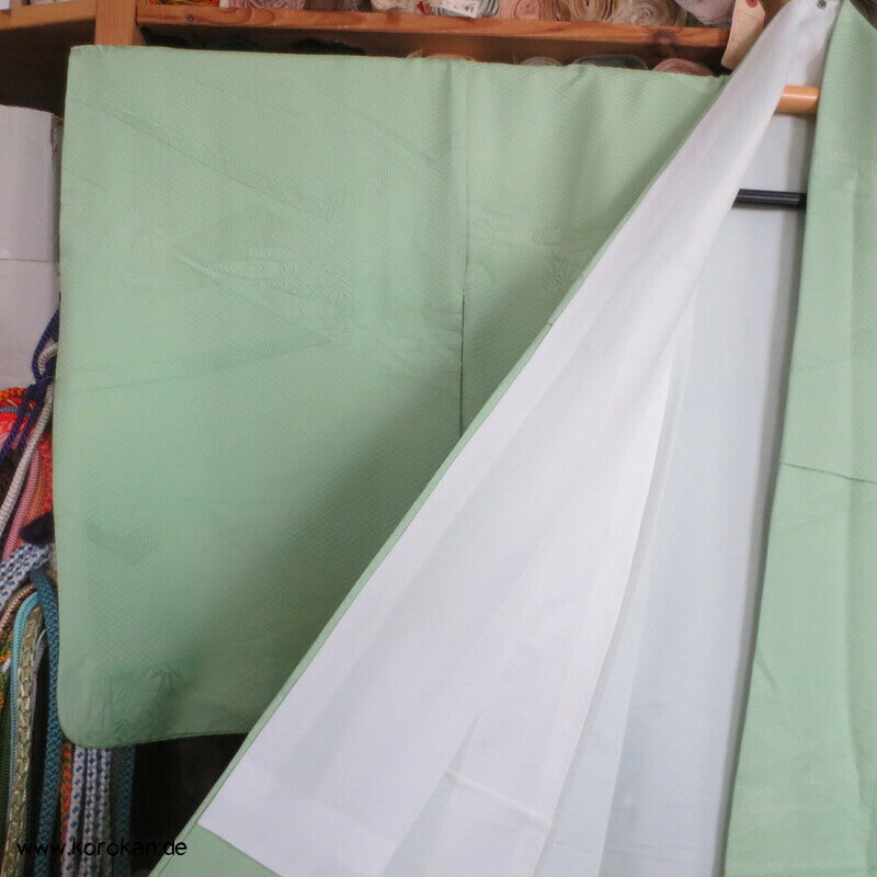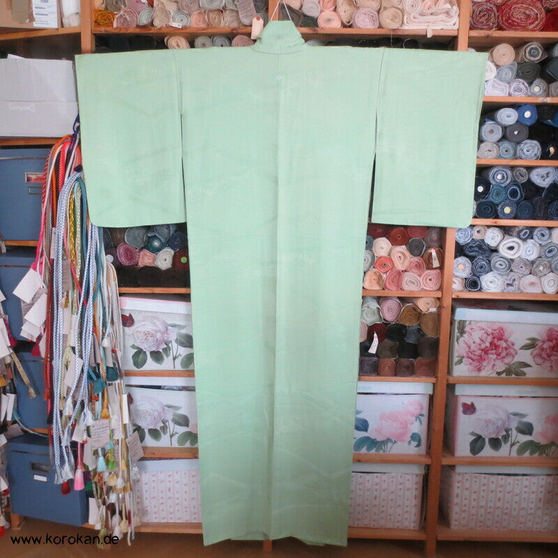 Vintage Seidendamast Iromuji Kimono jadegrün mit stark strukturierte Webung.