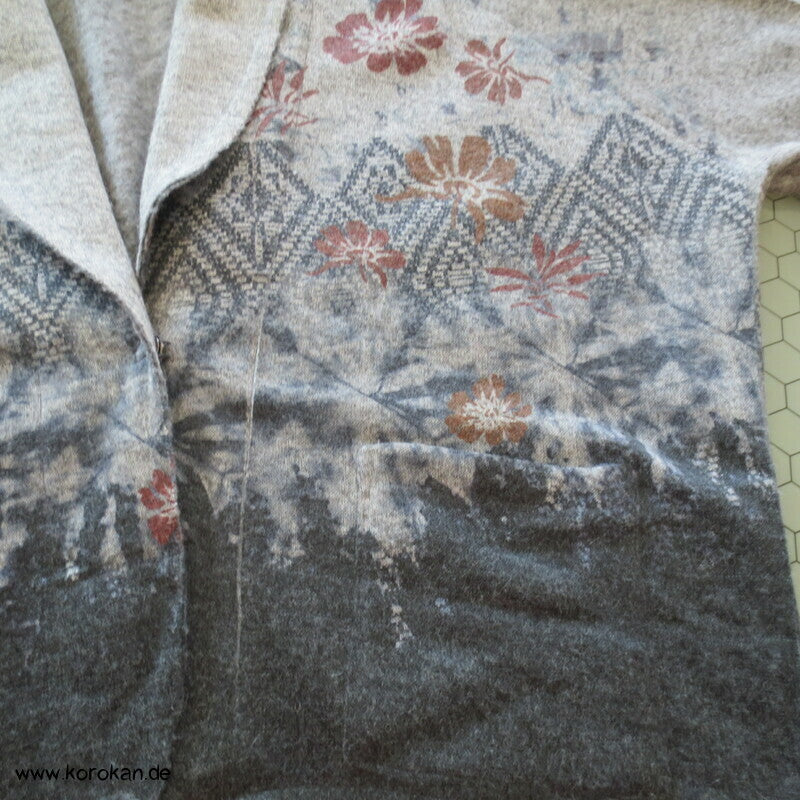 italienische Wollwalkjacke mit leicht japanischer Anmutung - Druckmuster auf feinem grauen 100 % Wollwalkstrickstoff - geschlossen auf Druckknöpfe, Taschen, weit und kastig