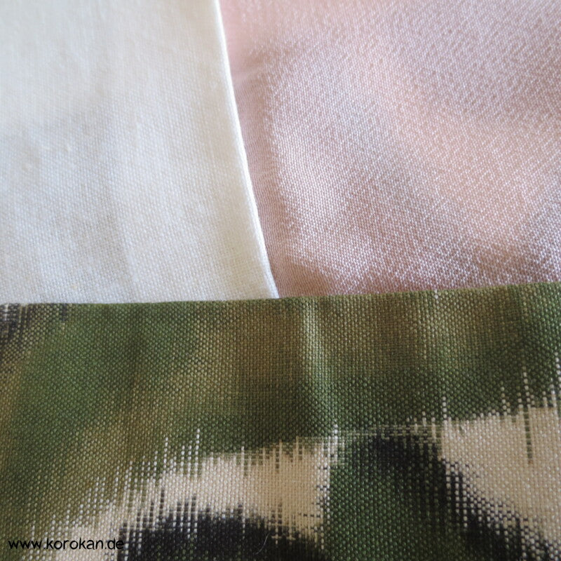 Vintage Meisen Seiden Komon Kimono abstrakte Blätter im Gitter auf kieselgrau, oberes Futter helle Baumwolle, unteres Futter rosa Seide
