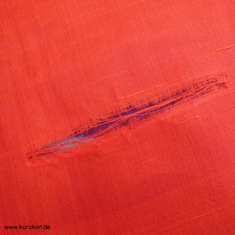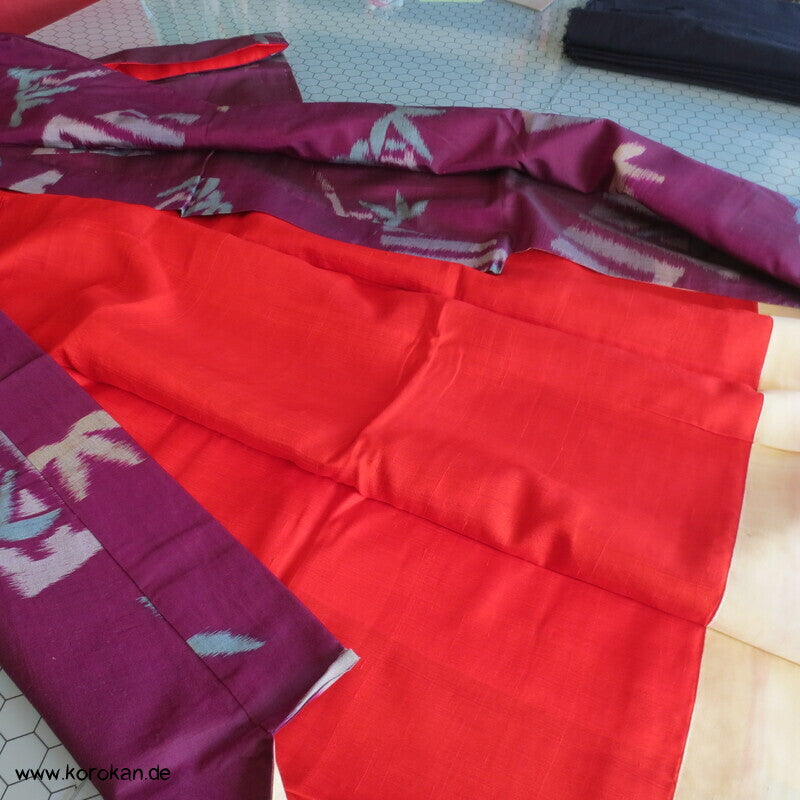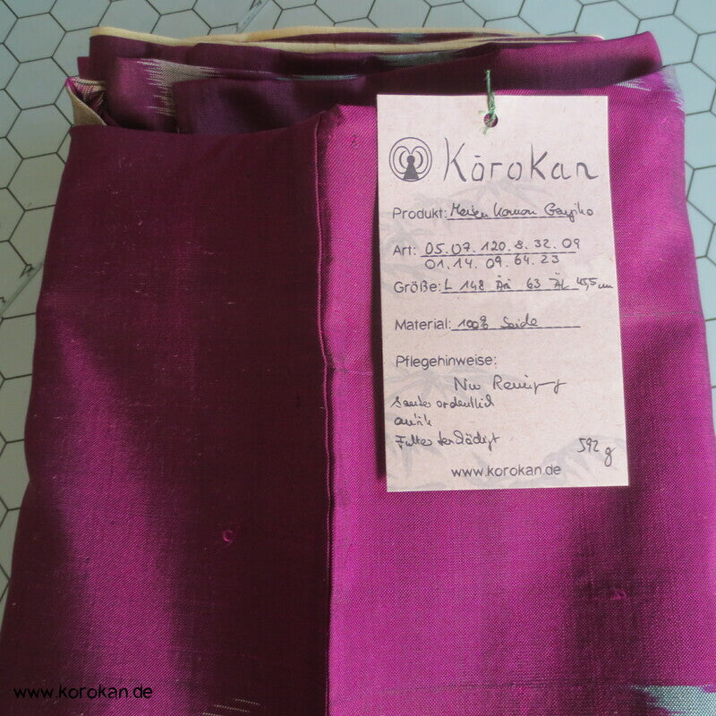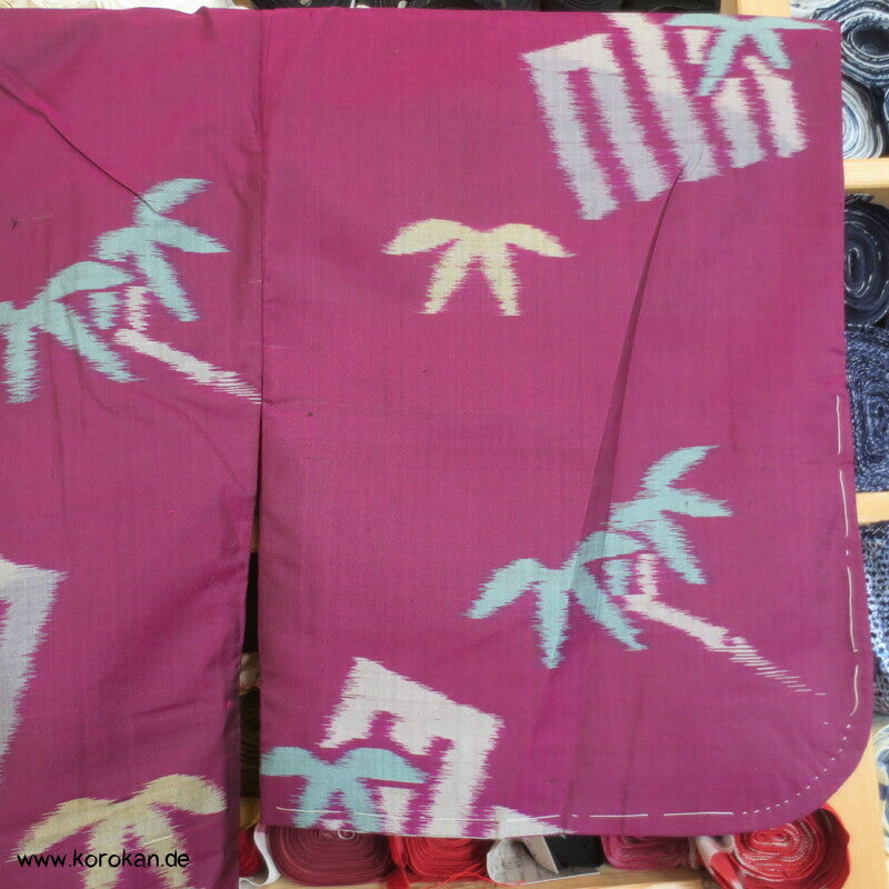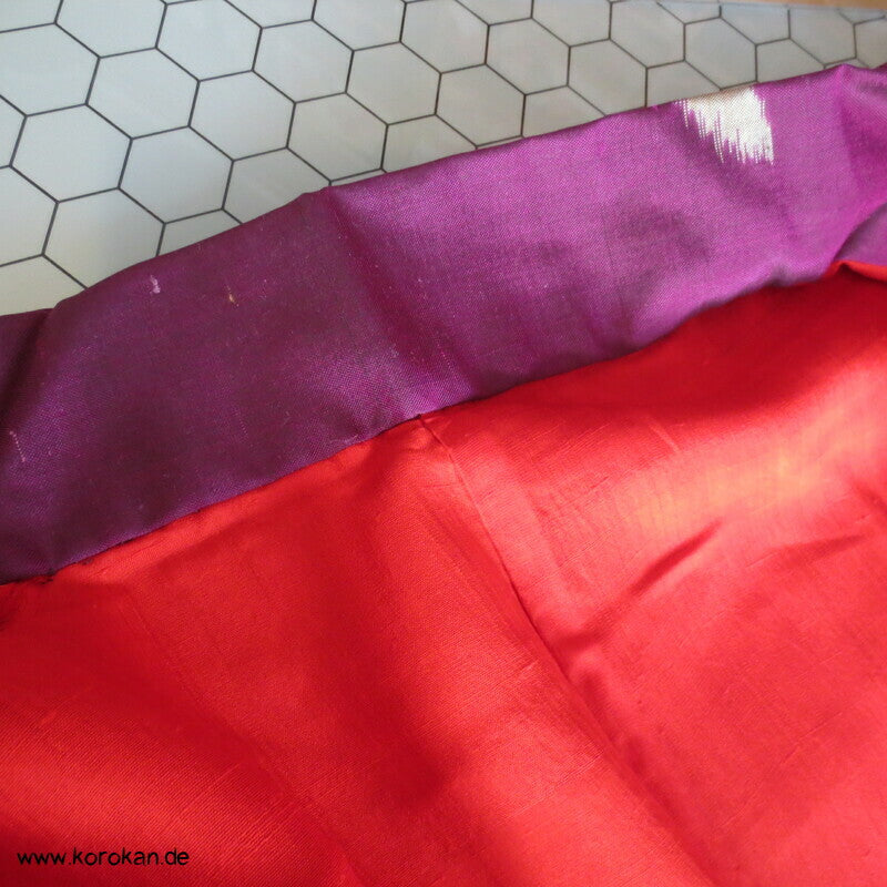 Art Deco 1920 /1930'er Meisen Seiden Komon Kimono mit Bambus und Genjiko in pflaume, oberes Futter rote Seide mit Riss, unteres Futter hellgelbe Seide