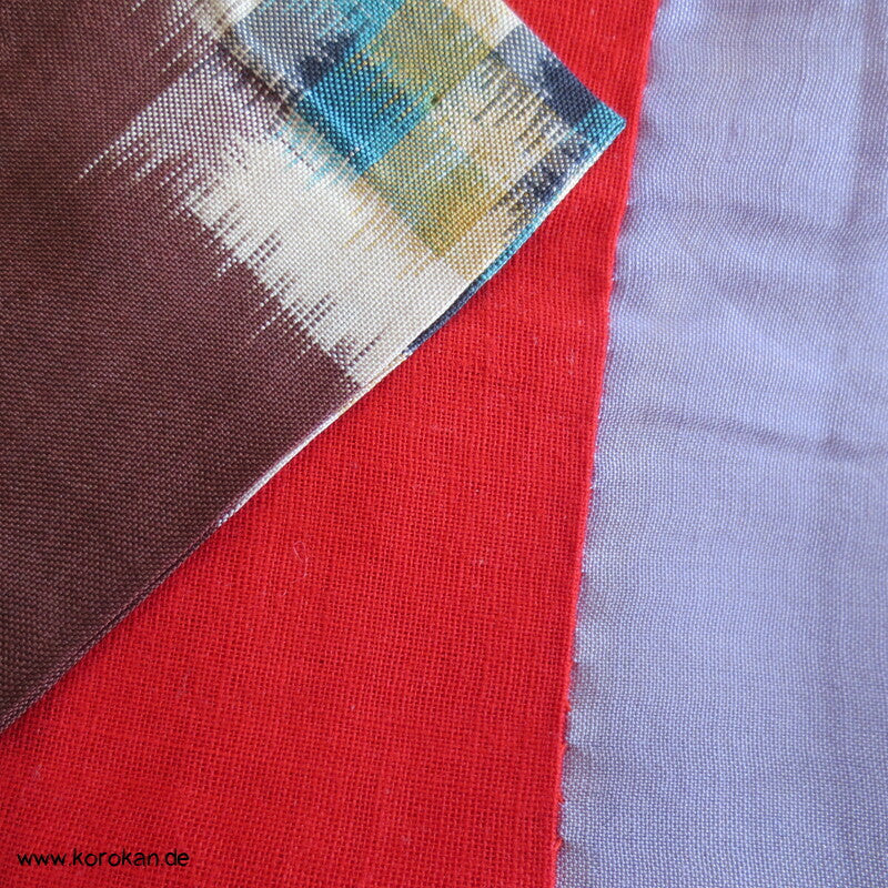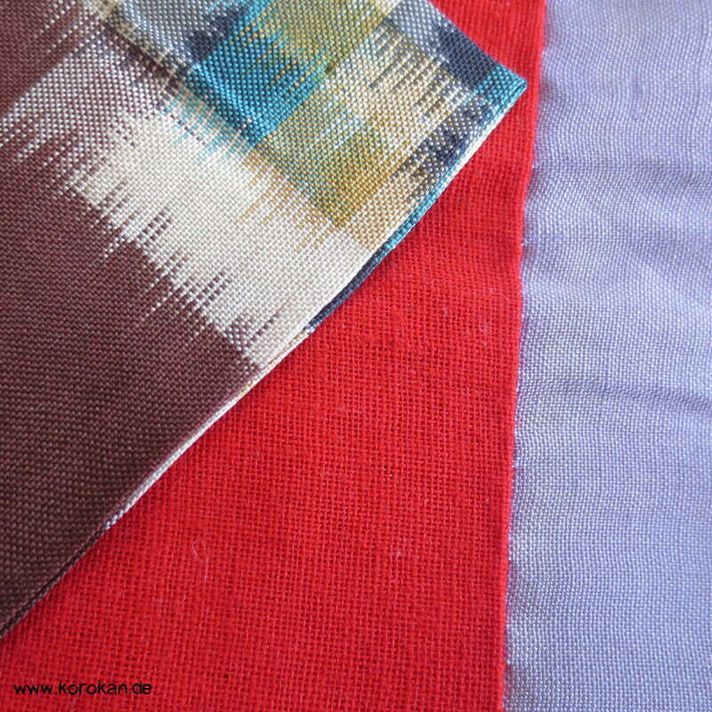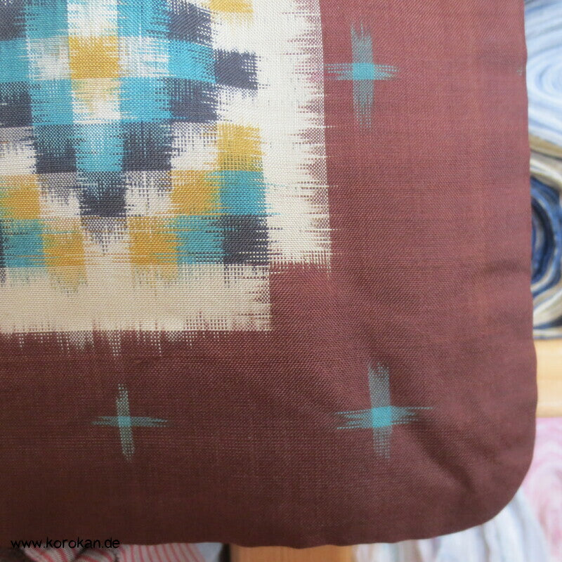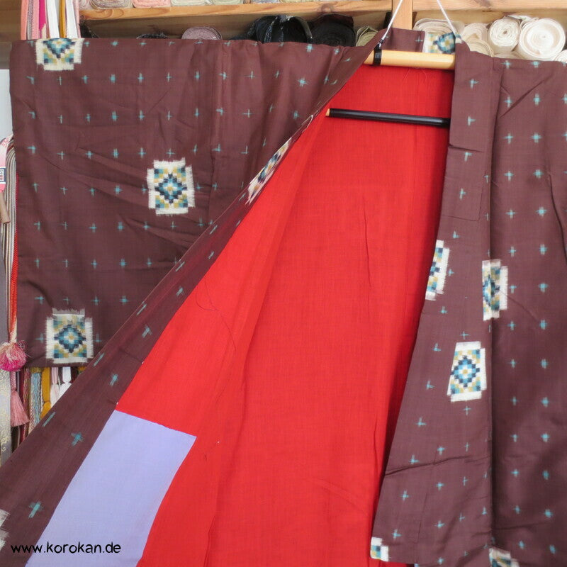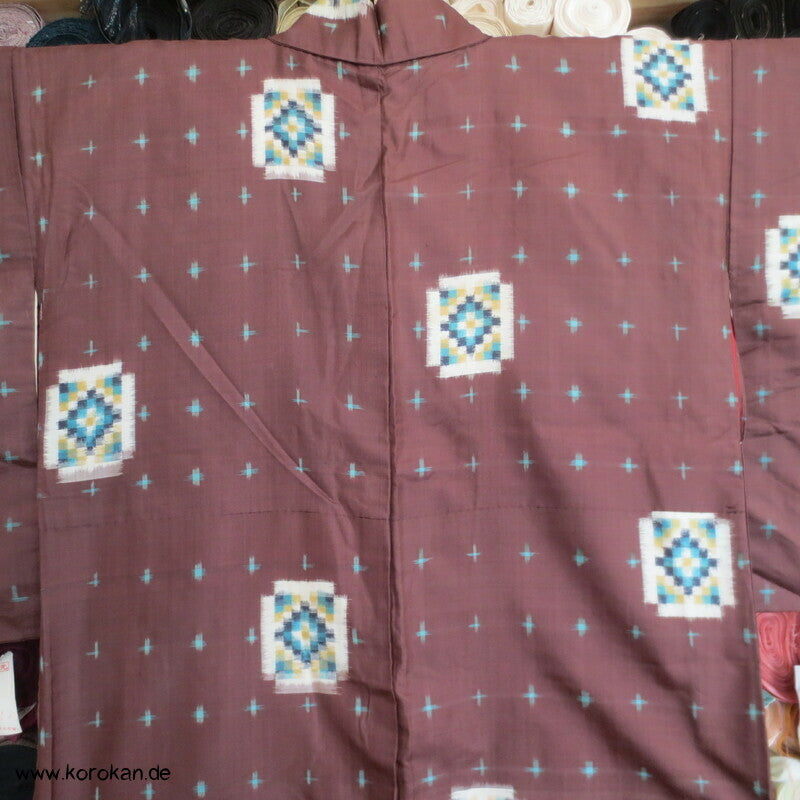 antiker japanischer Art Deco Meisen Seiden Komon Kimono Karo Ornamente in türkis gelb natur auf braunem Grund, oberes Futter rote Baumwolle, unteres Futter flieder Wollmuslin