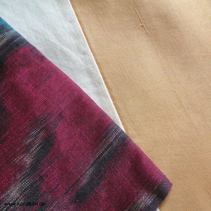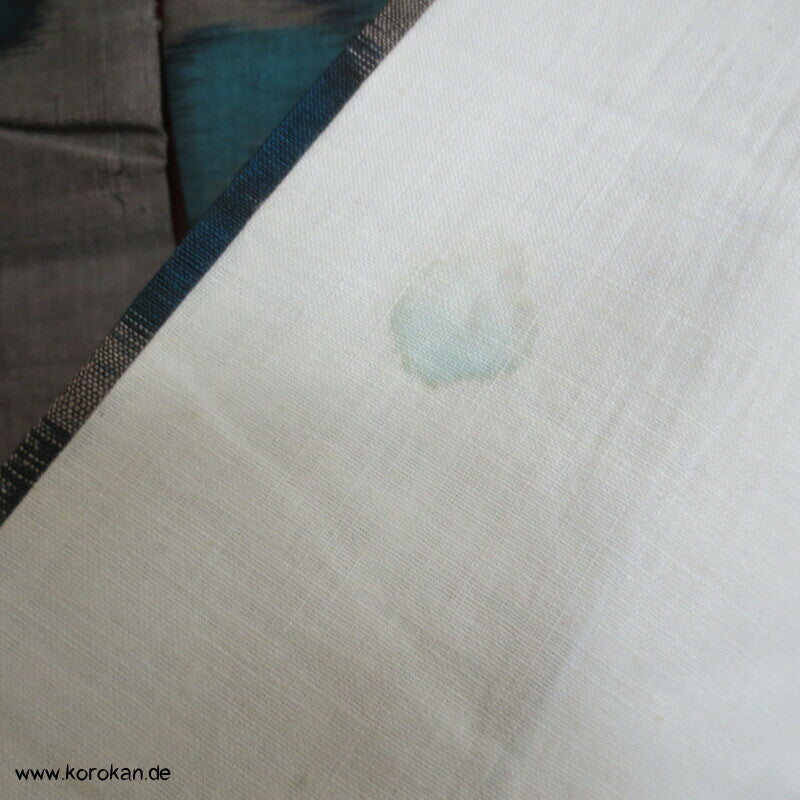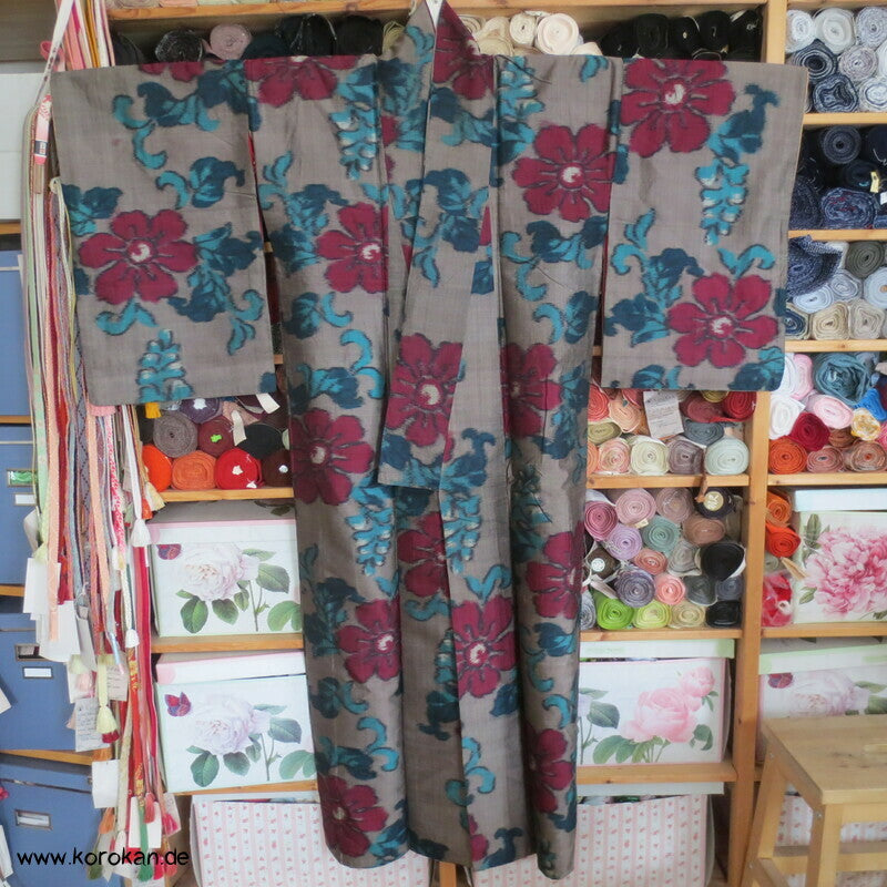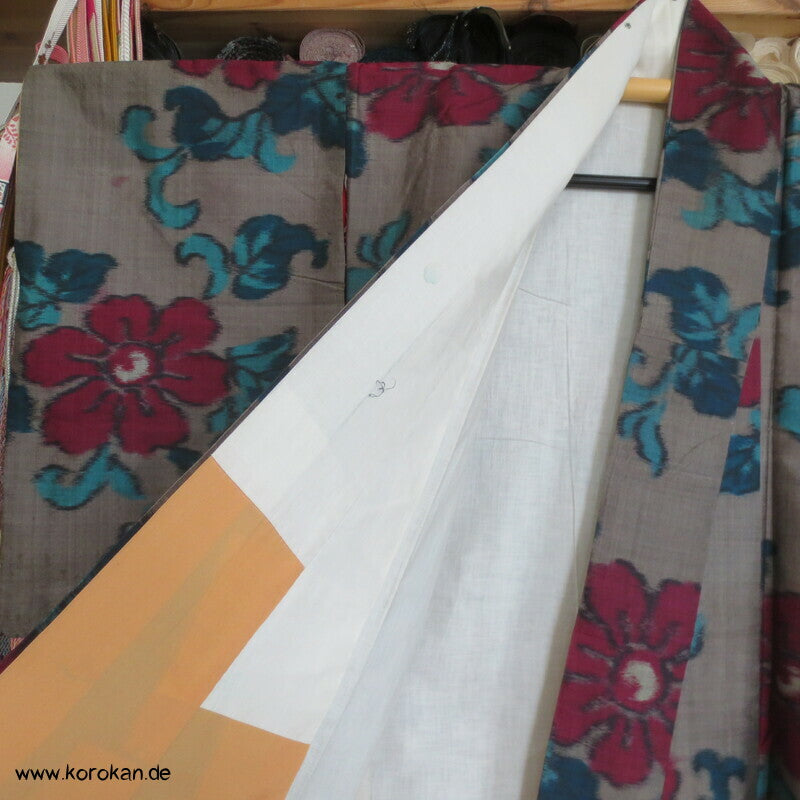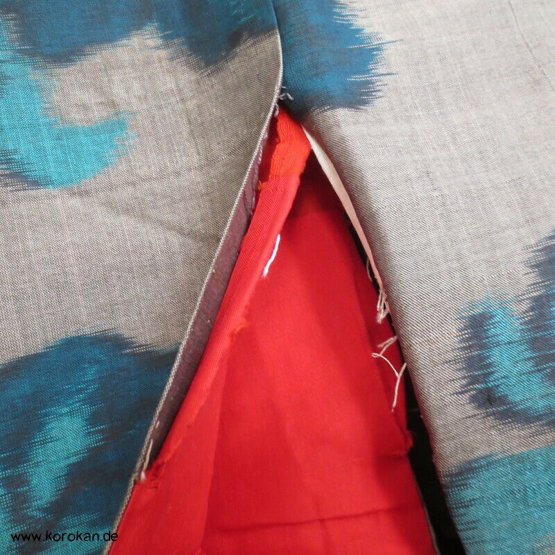 Vintage, eher antiker Kasuri Meisen Seiden Komon Kimono mit großem Karakusa Arabesken Muster - sehr schönes Motiv, oberes Futter helle, unteres Hakkake Futter apricotfarbene Seide, relativ lange Ärmel