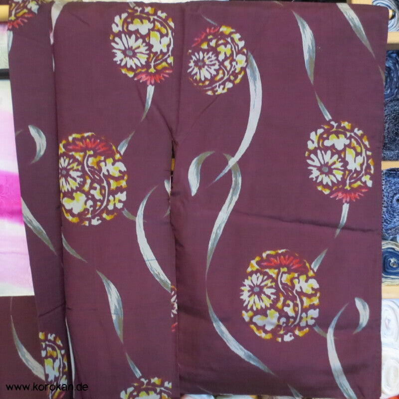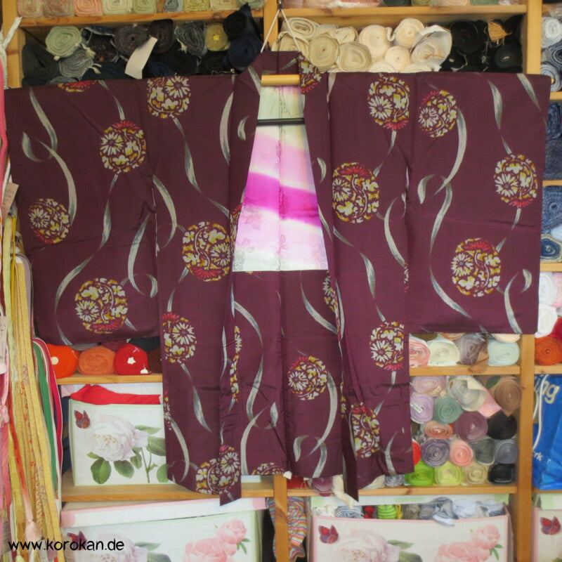Vintage, fast schon antike Haori Kimono Jacke aus Seide / Rayon frühe Kunstseide Kasuri Meisen gewebt, Kusudama Blumenkugeln zwischen Bändern auf weinrot mit knalligem Damast Futter