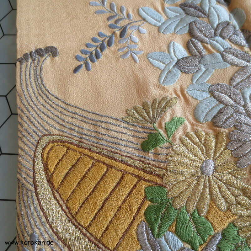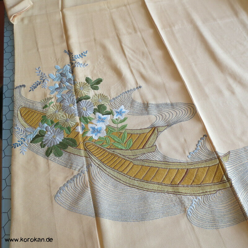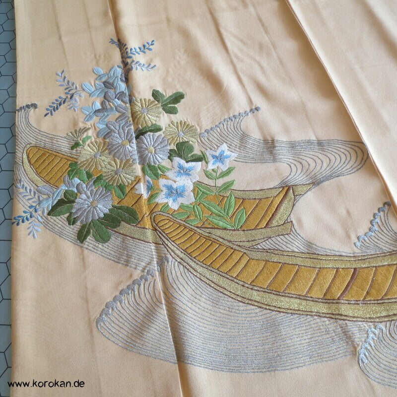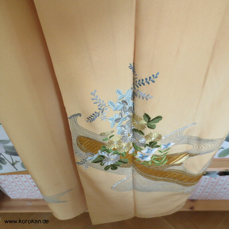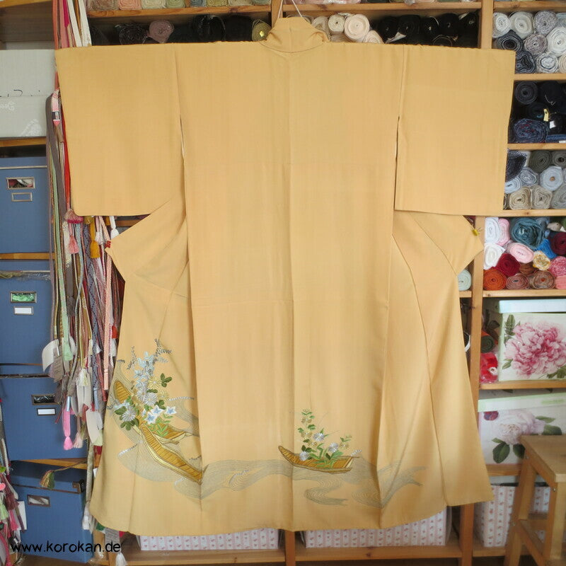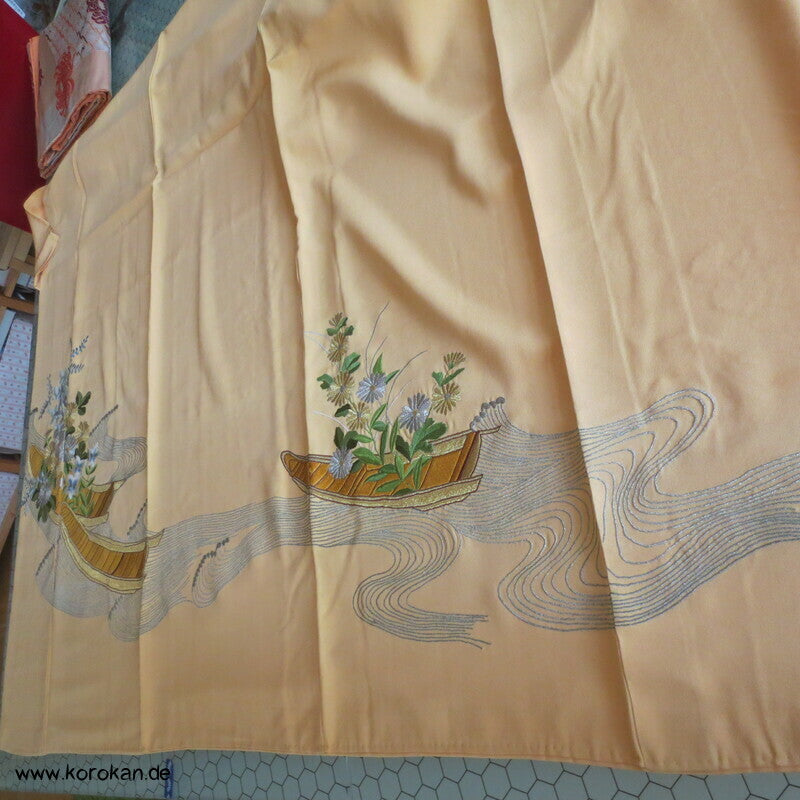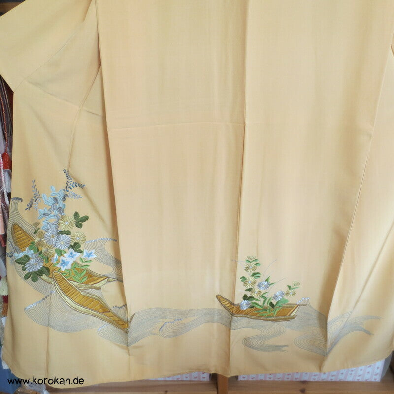 Vintage Irotomesode hellsonnengelber Seidencrepe bestickt mit Booten am See