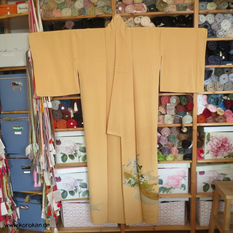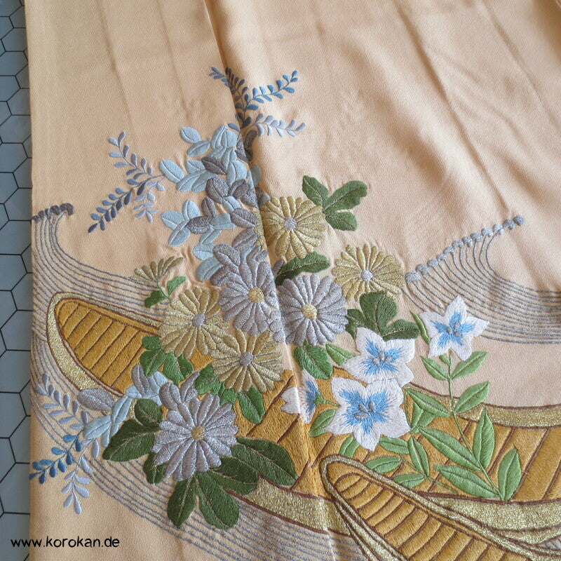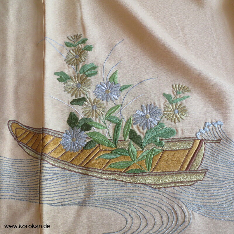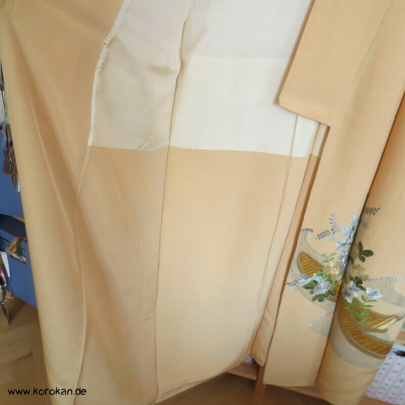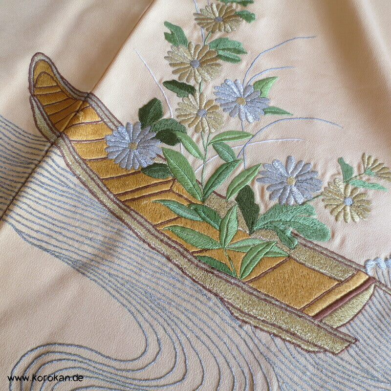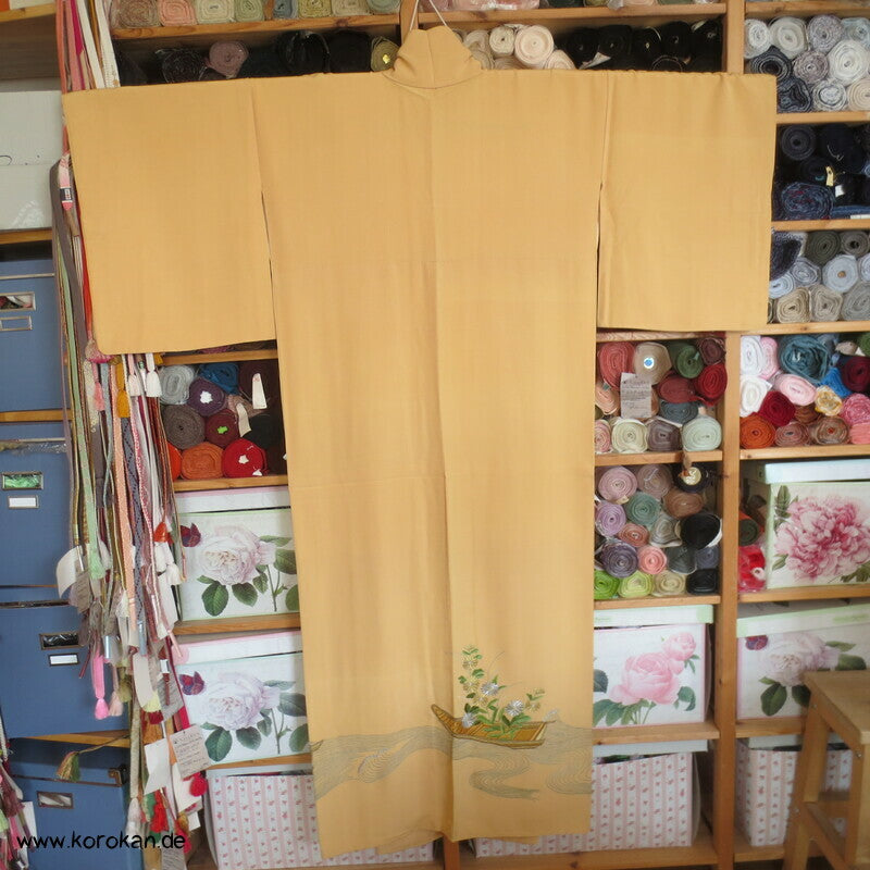 Vintage Irotomesode hellsonnengelber Seidencrepe bestickt mit Booten am See