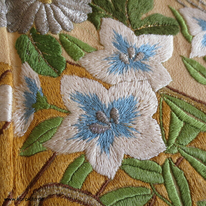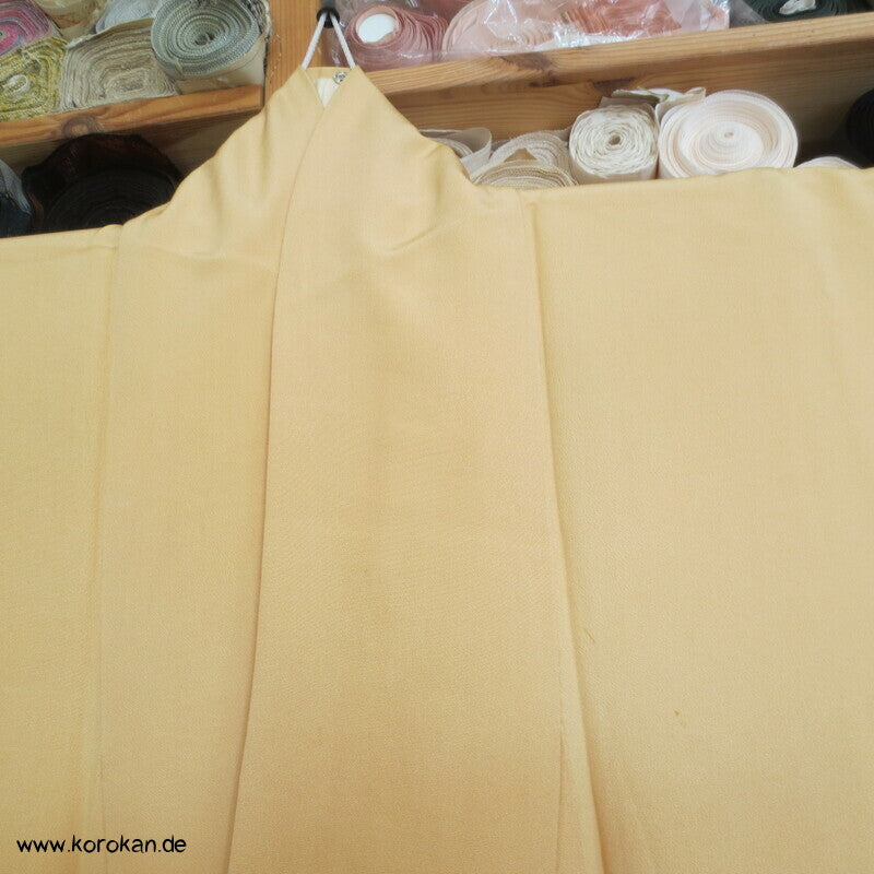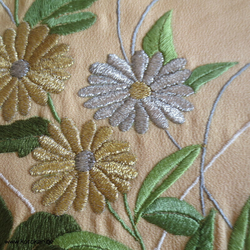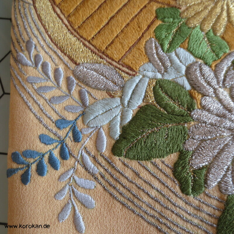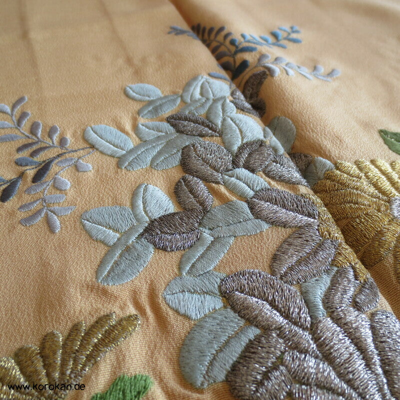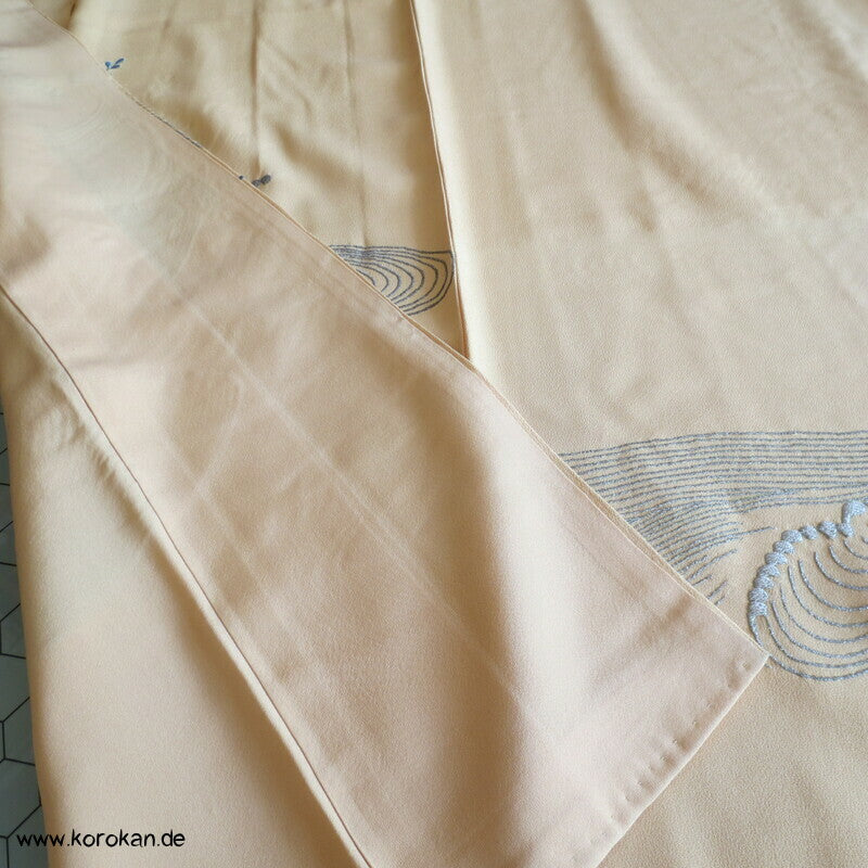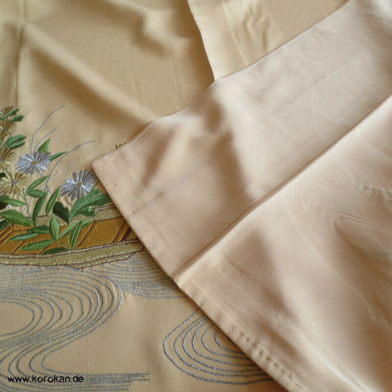 Vintage Irotomesode hellsonnengelber Seidencrepe bestickt mit Booten am See