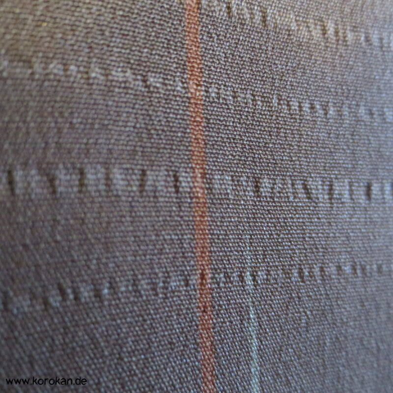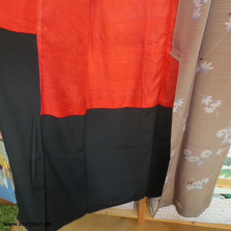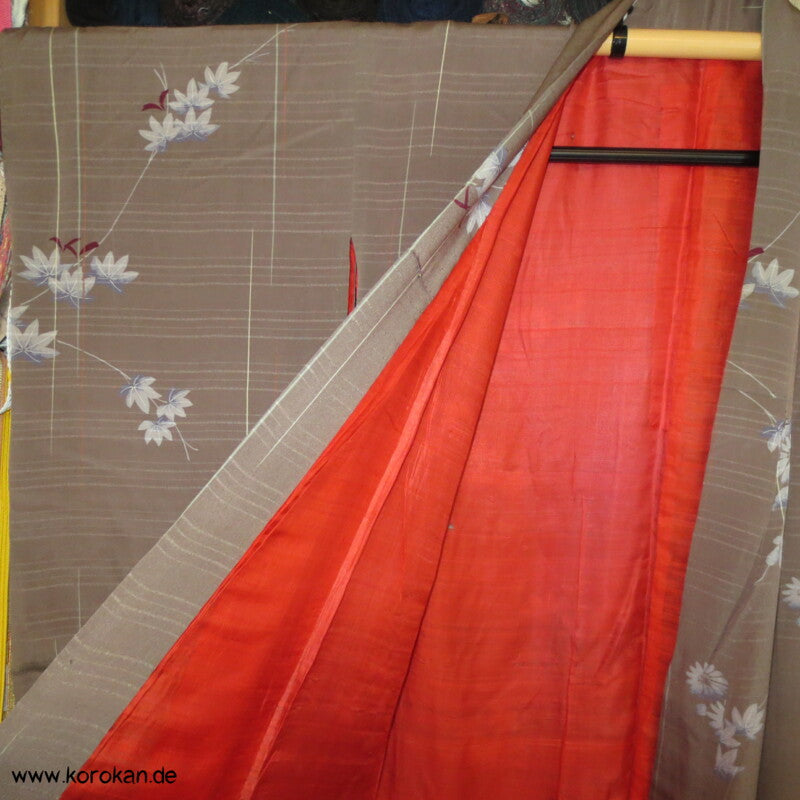 antiker Komon Kimono Seersucker Streifen Seidencrepe mit zartem Chrysanthemenzweigemuster, oberem rotem Seiden Futter und unterem Hakkake Futter Seidencrepe schwarz