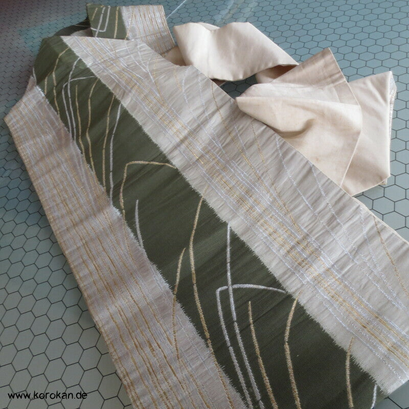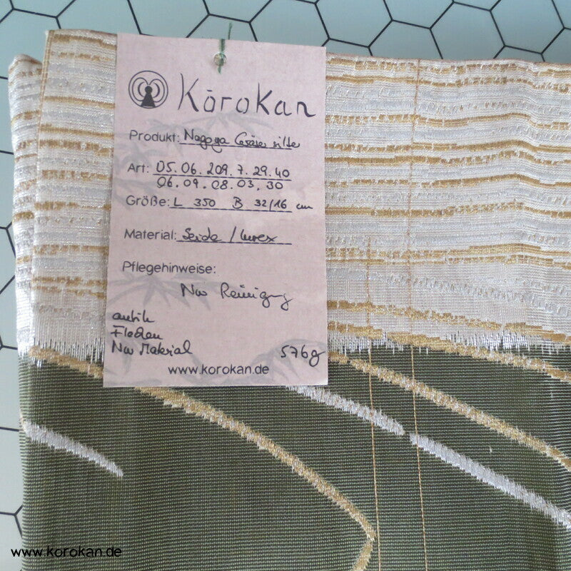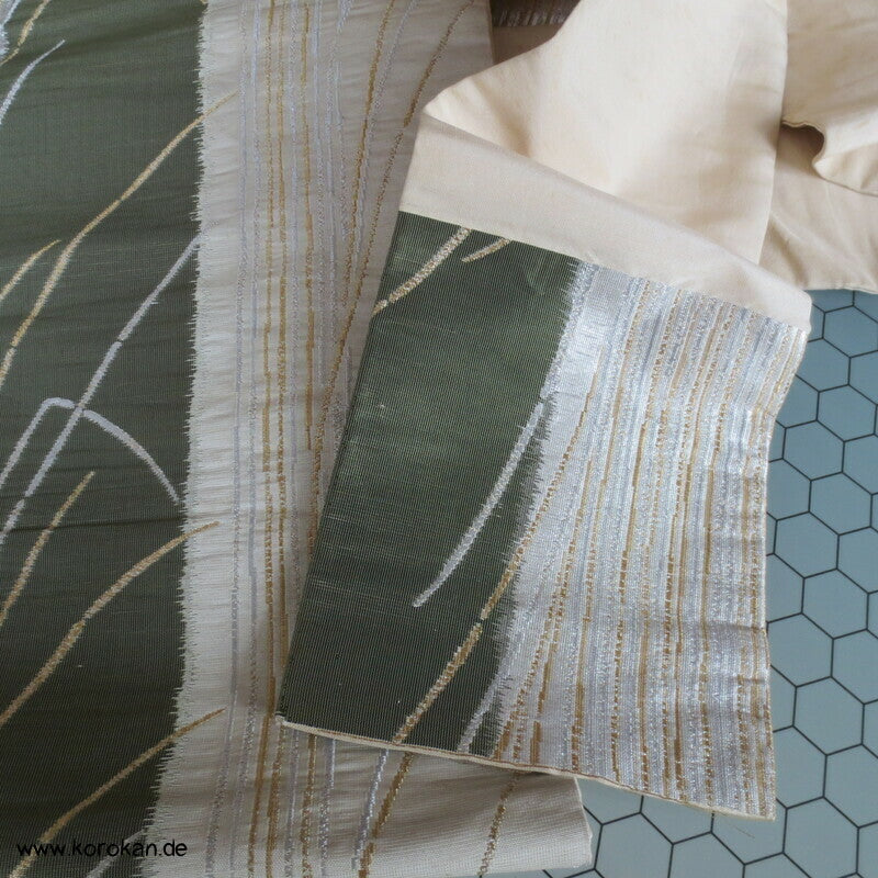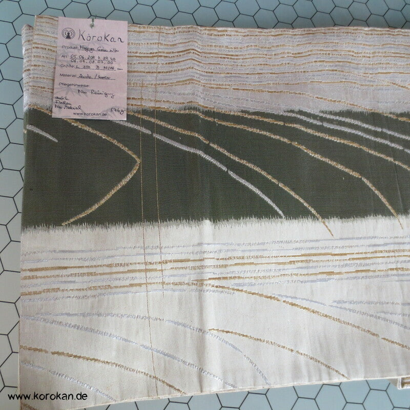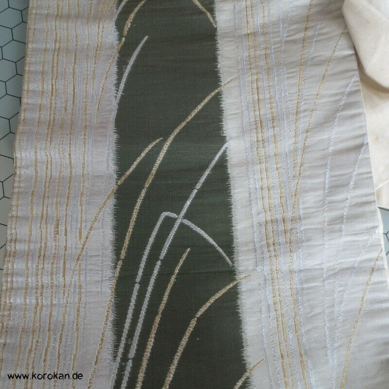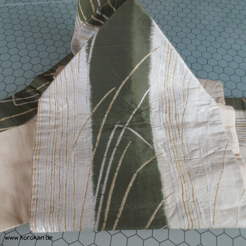 Japan Gräser gold, silber vor grün Nagoya Obi Seidenbrokat Kimonogürtel