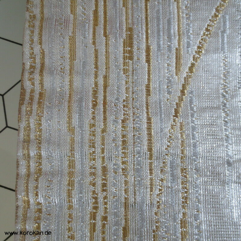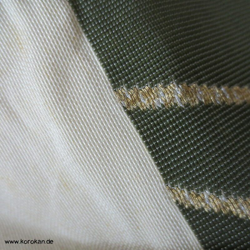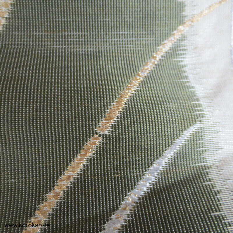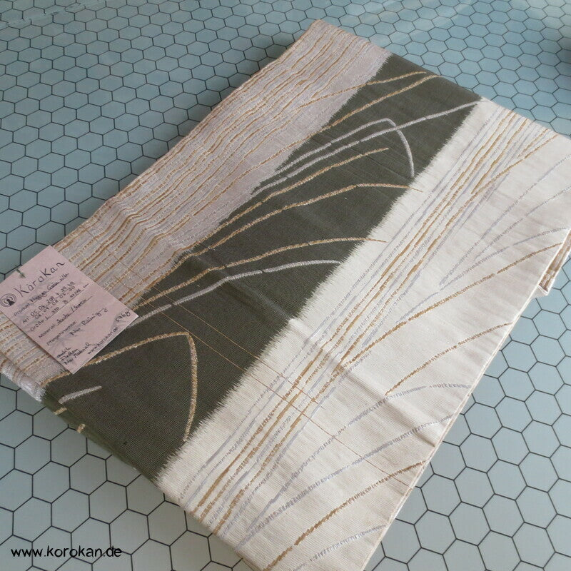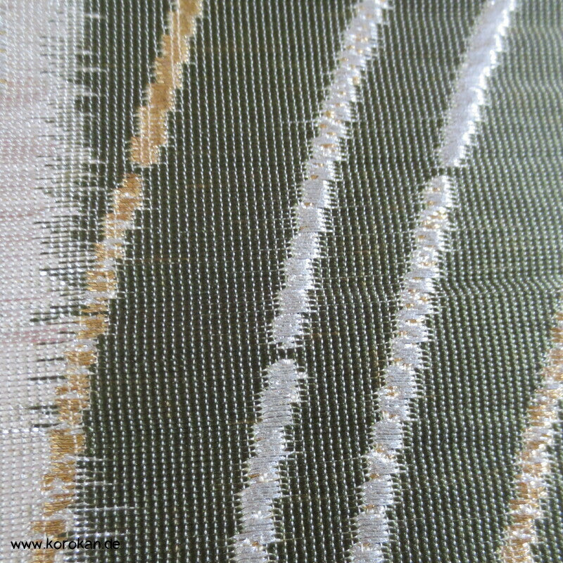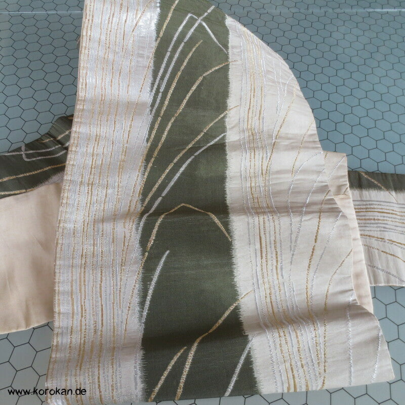 Vintage Seiden Nagoya Obi Seidenbrokat mit Gräsern in gold und silber auf gestreiften kiesel und oliv Grund