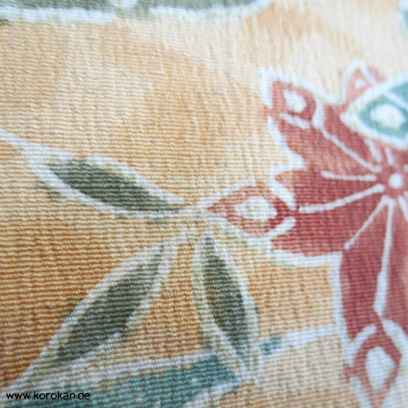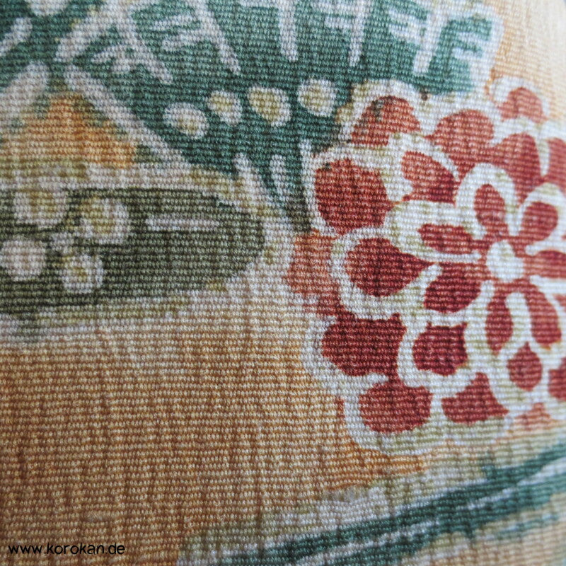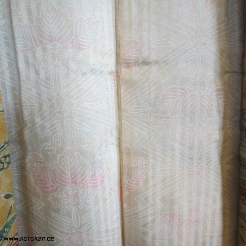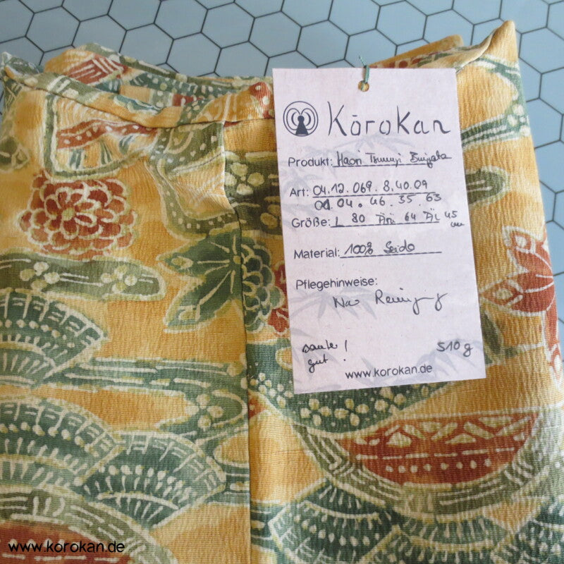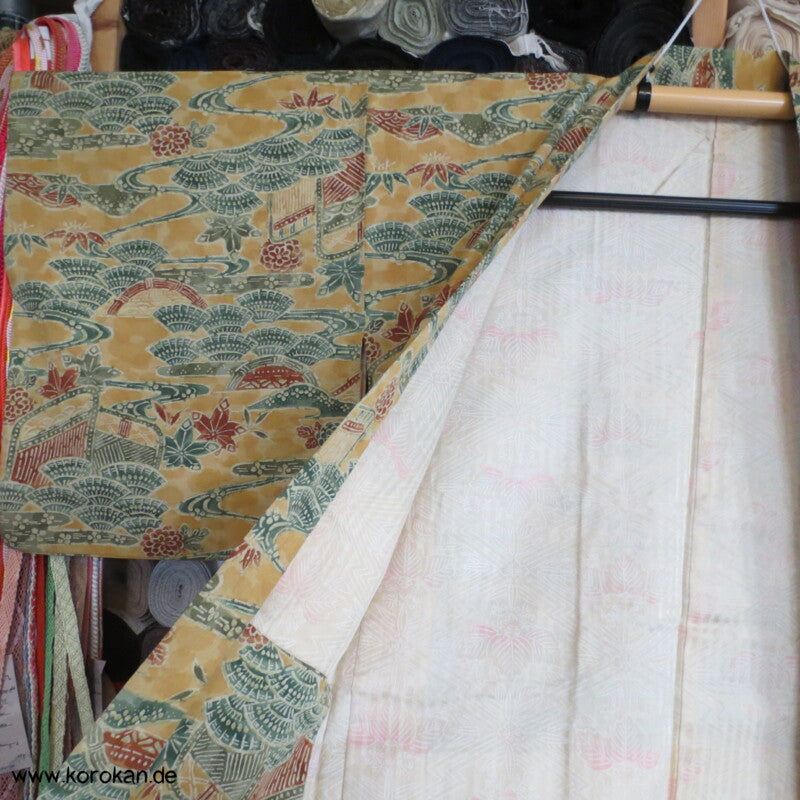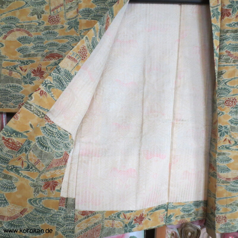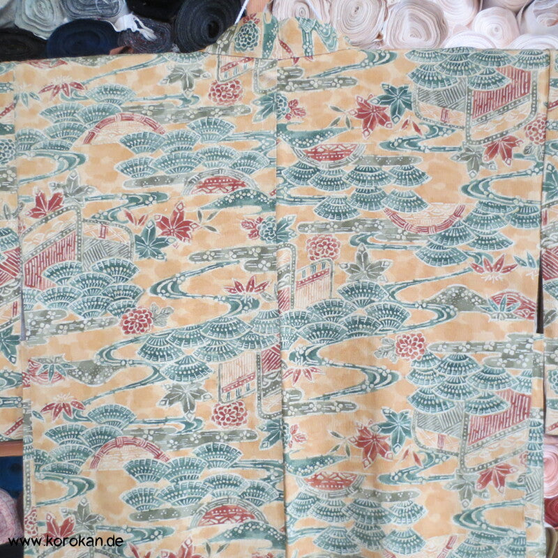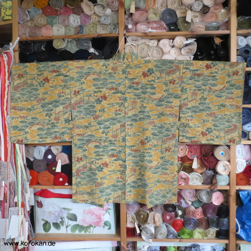 Vintage Haori Kimono Jacke grob gewebte Tsumugi Crepe Seide bedruckt mit klassischen japanischen Motiven auf sonnengelb, oberem Seidendamast mit hellen Druck