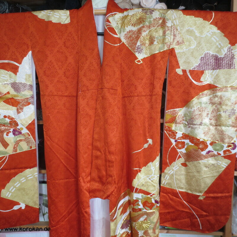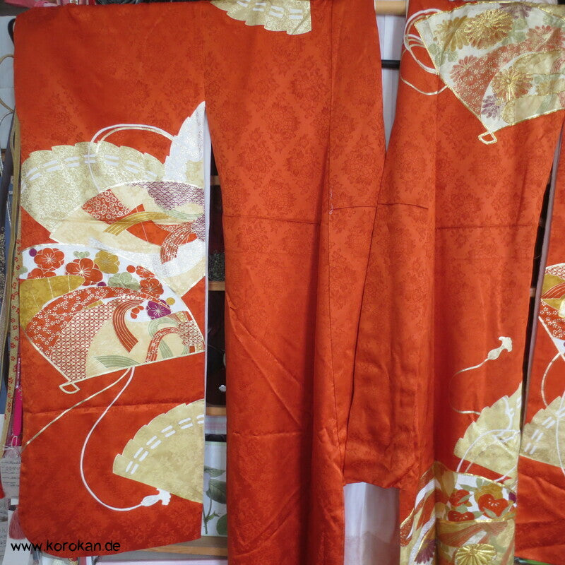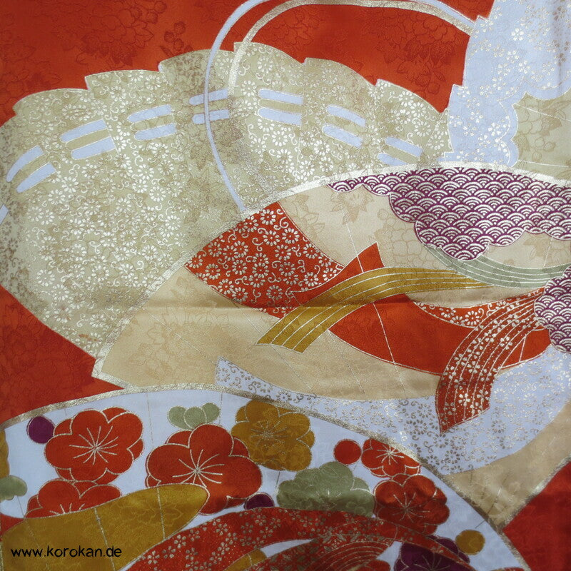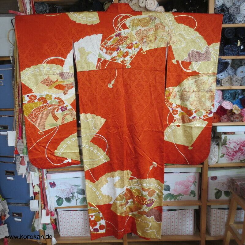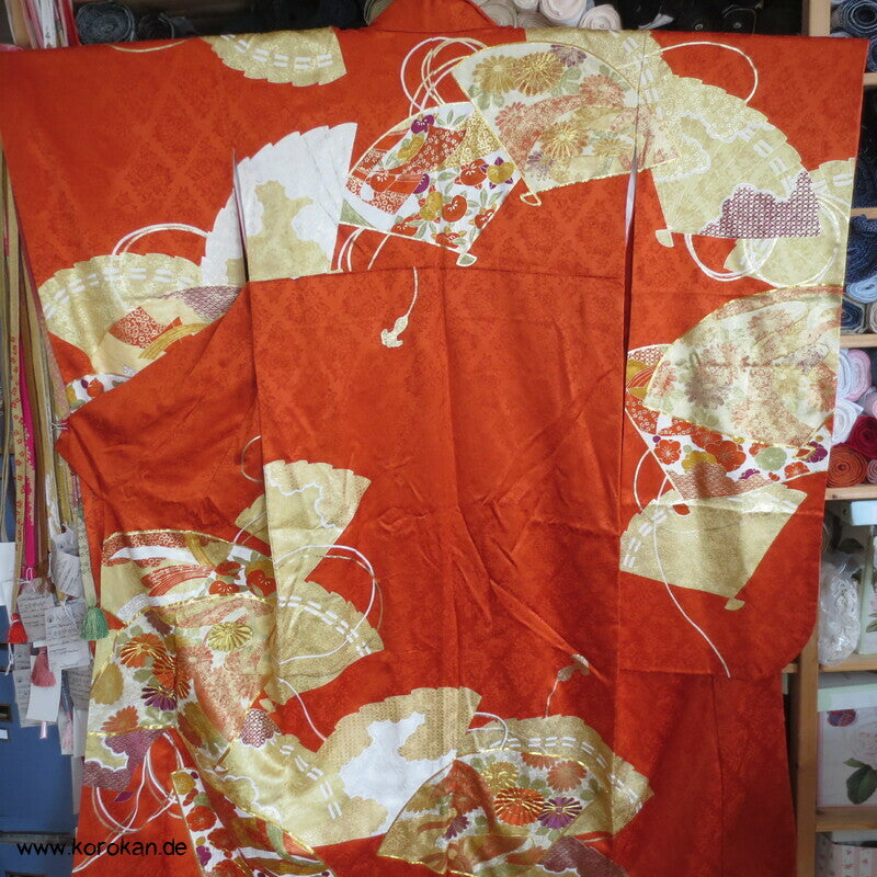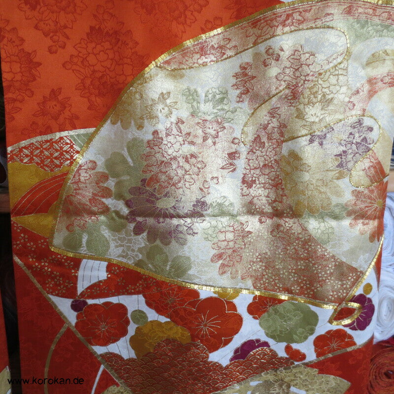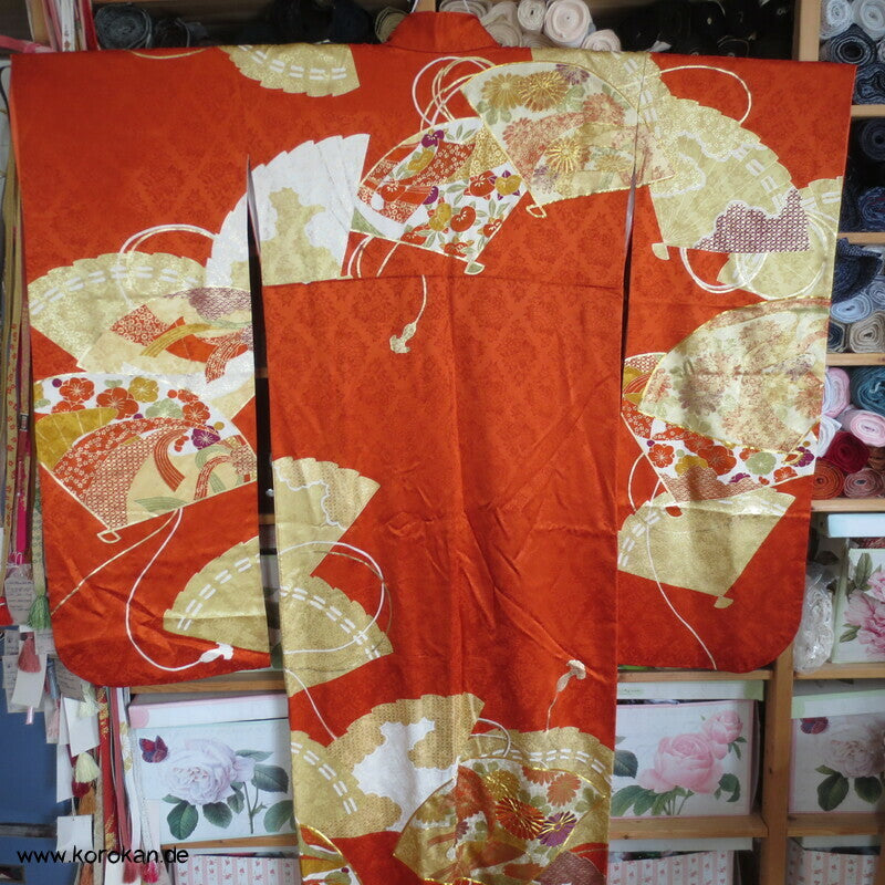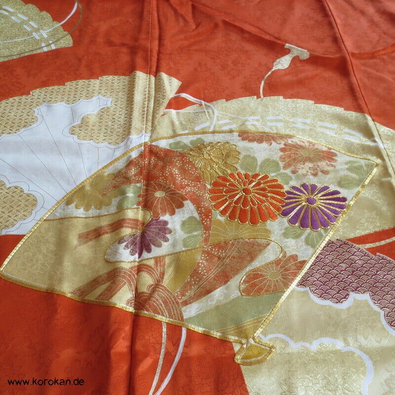 Furisode Kimono japanischer Fächer Golddruck - und stickerei Seidendamast