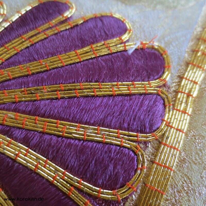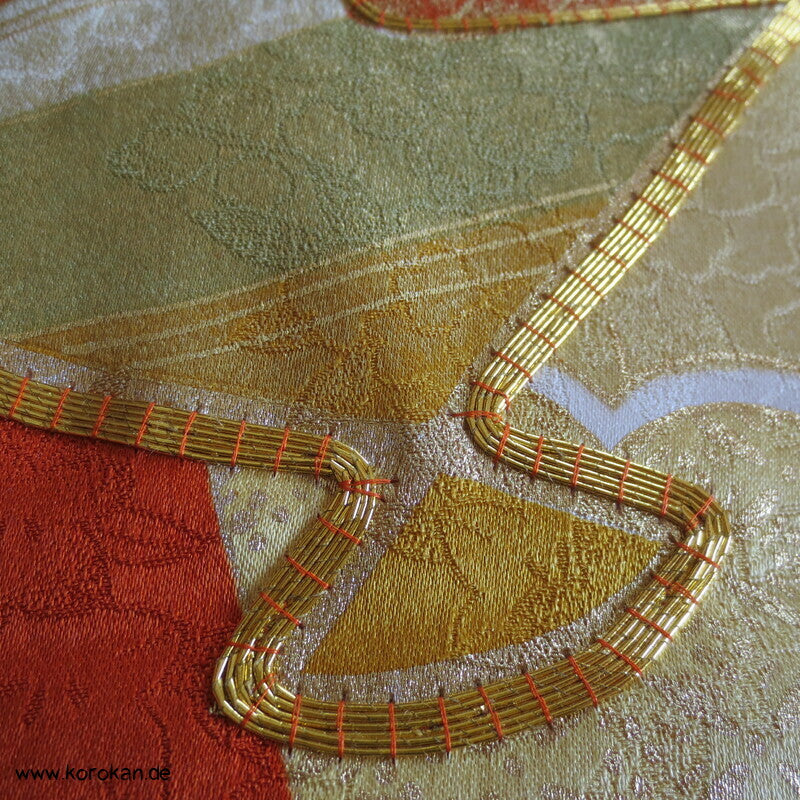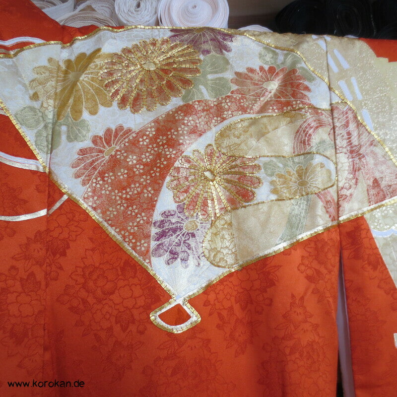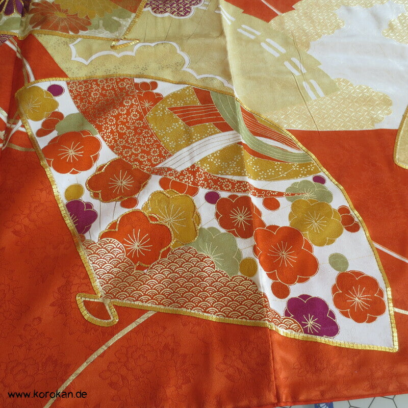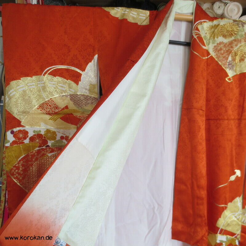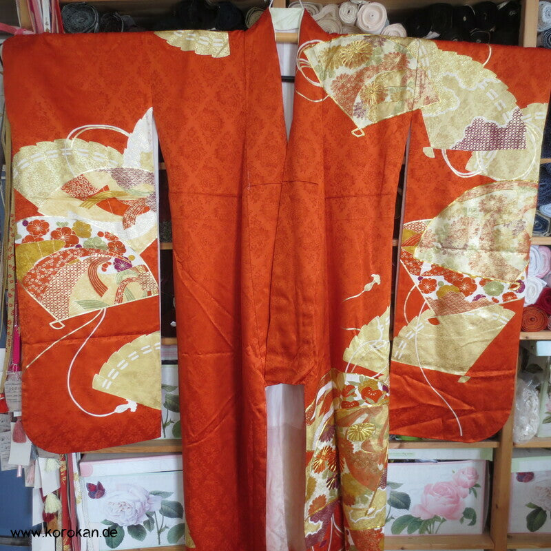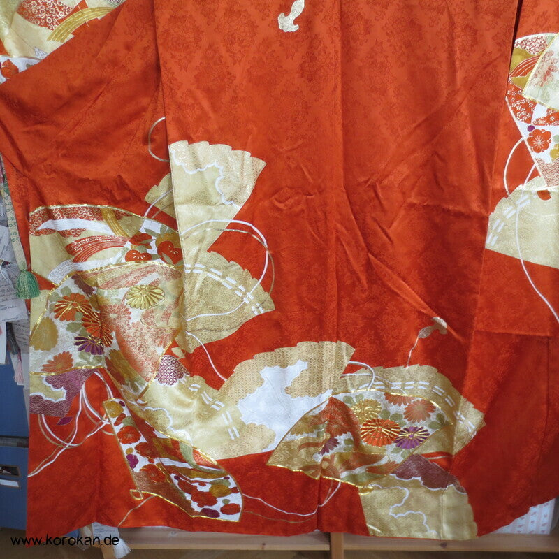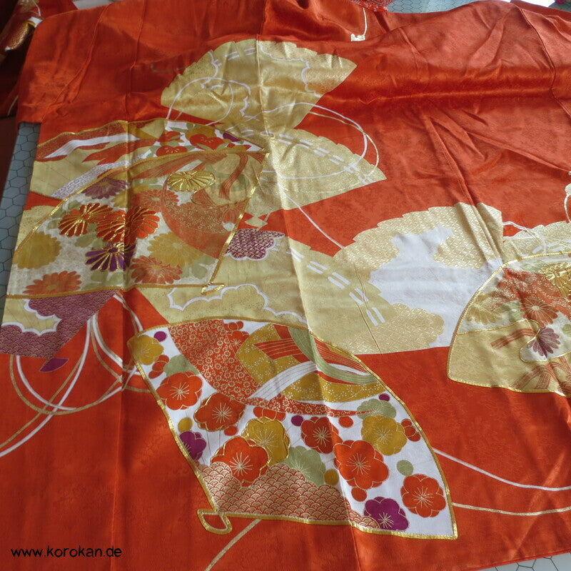 Furisode Kimono japanischer Fächer Golddruck - und stickerei Seidendamast