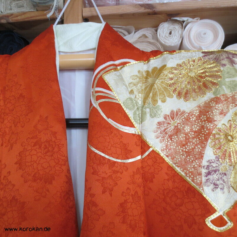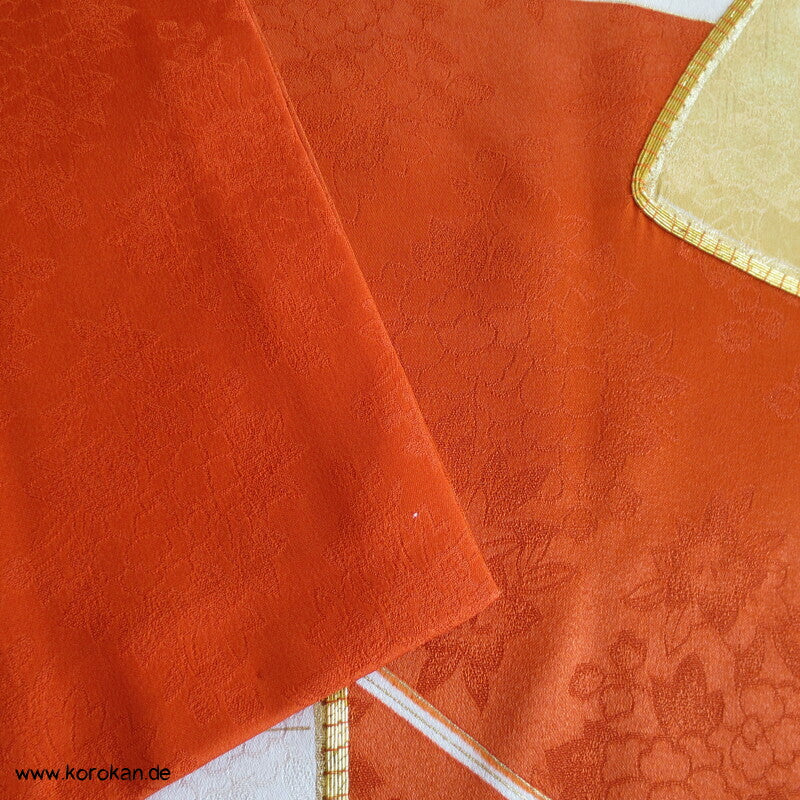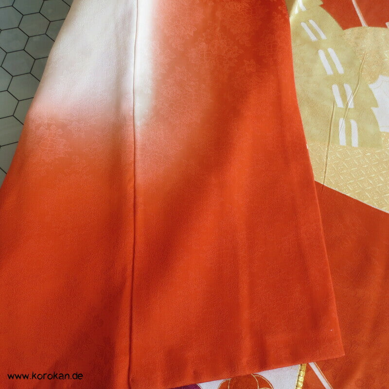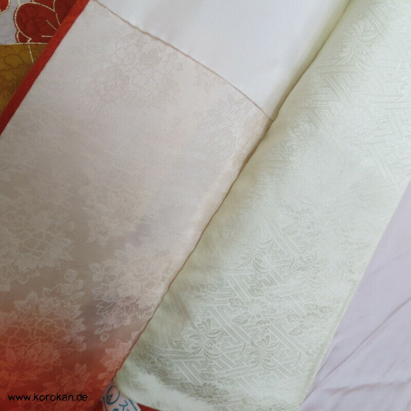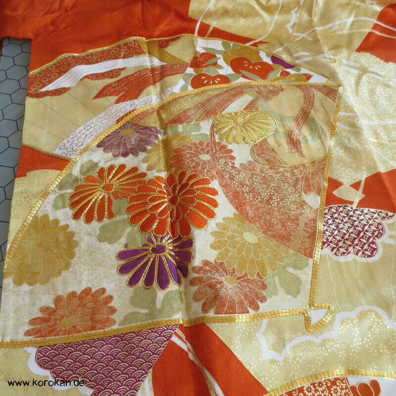 Vintage Furisode Blütendiamantrauten Seidendamast Kimono mit riesigen Fächern, viel Gold und silber Druck, goldbestickt, oberes Futter helle Seide, unteres Hakkake Seidenfutter mit Bokashi Farbverlaufsrand in orange auf Damast.