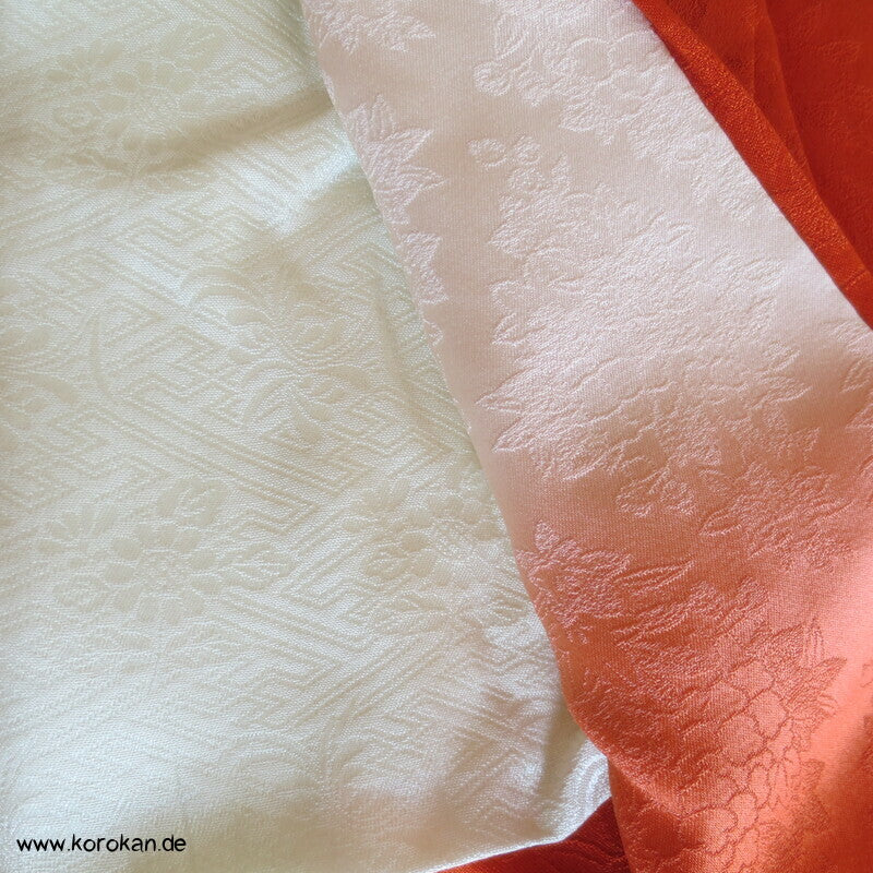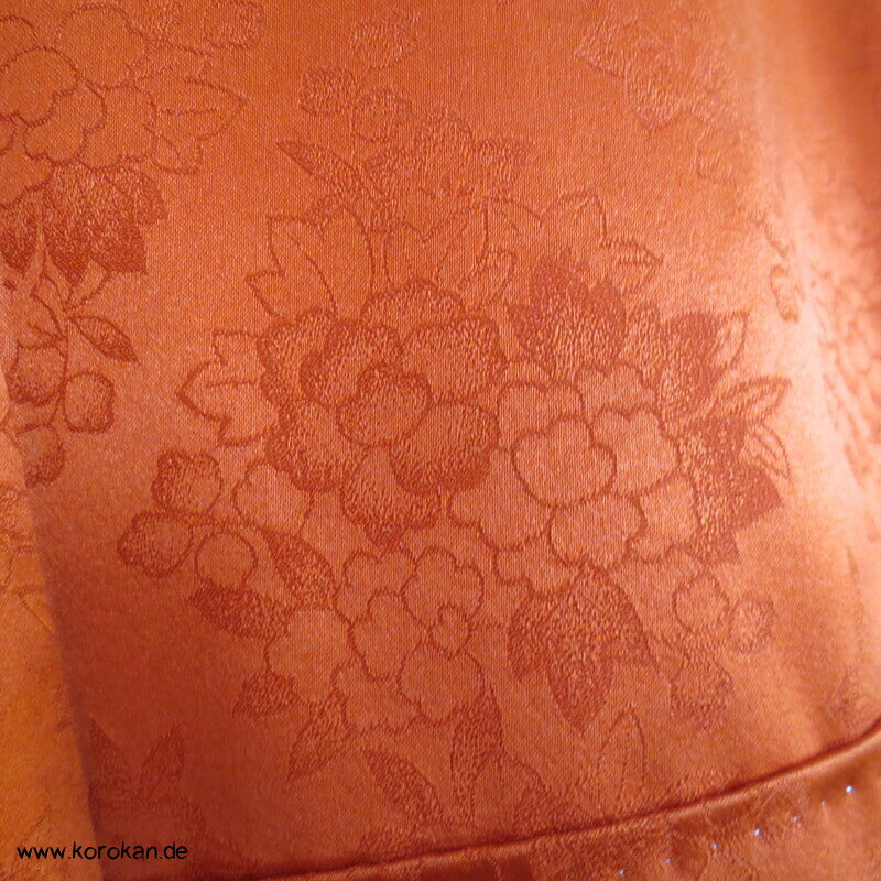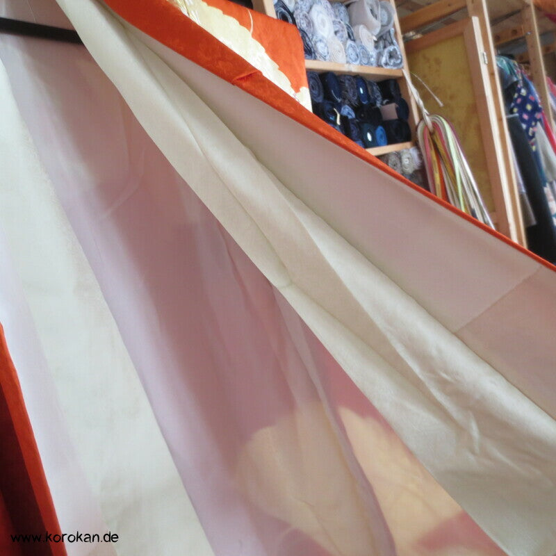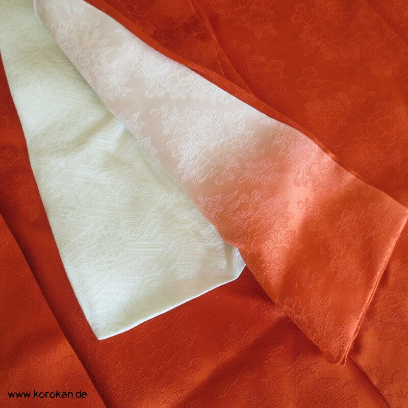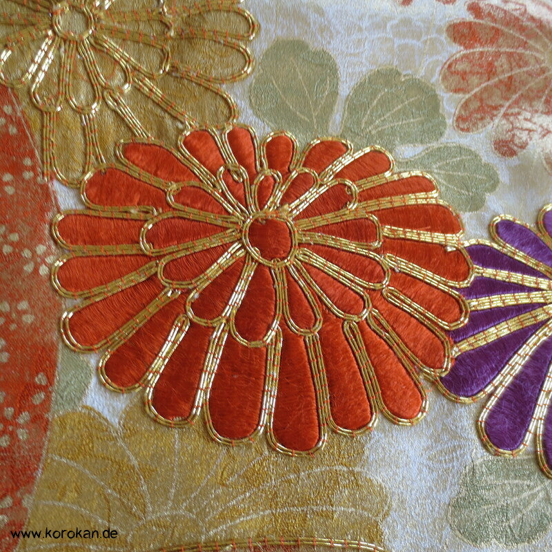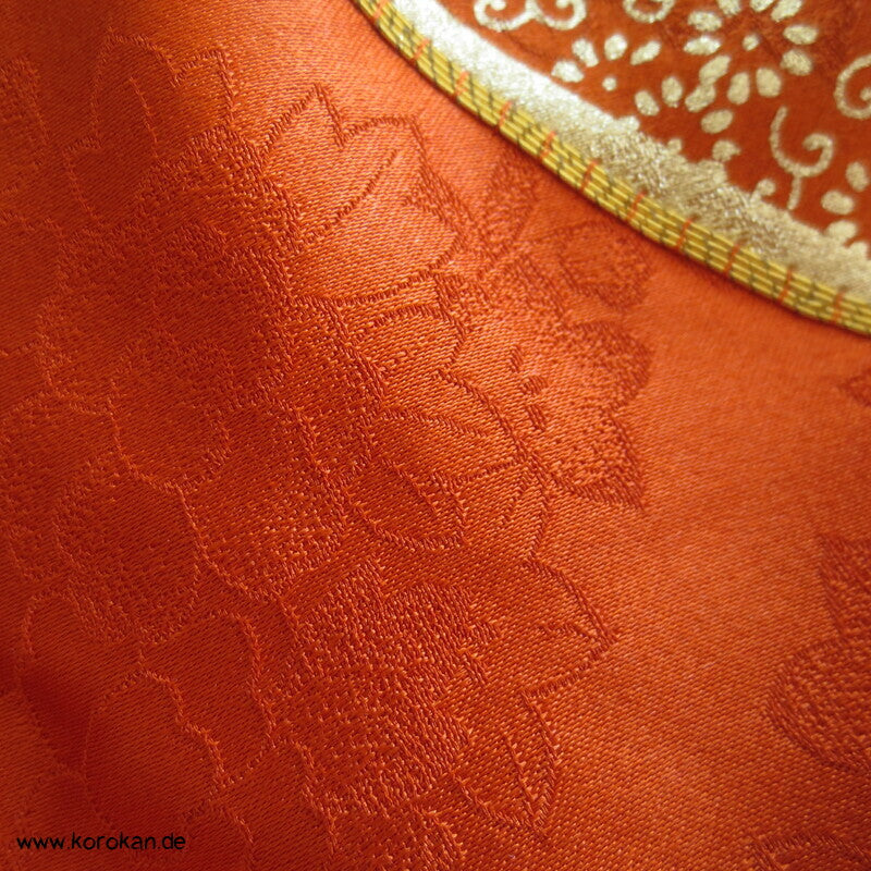 Vintage Furisode Blütendiamantrauten Seidendamast Kimono mit riesigen Fächern, viel Gold und silber Druck, goldbestickt, oberes Futter helle Seide, unteres Hakkake Seidenfutter mit Bokashi Farbverlaufsrand in orange auf Damast.