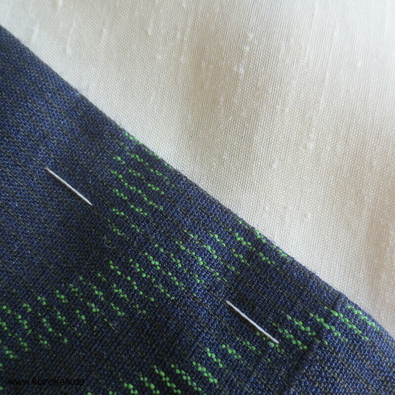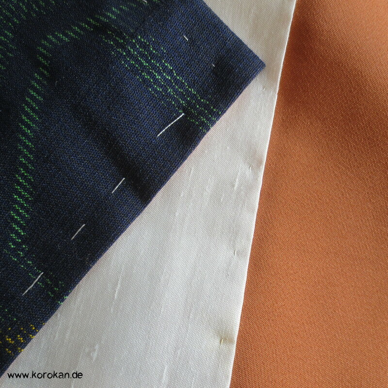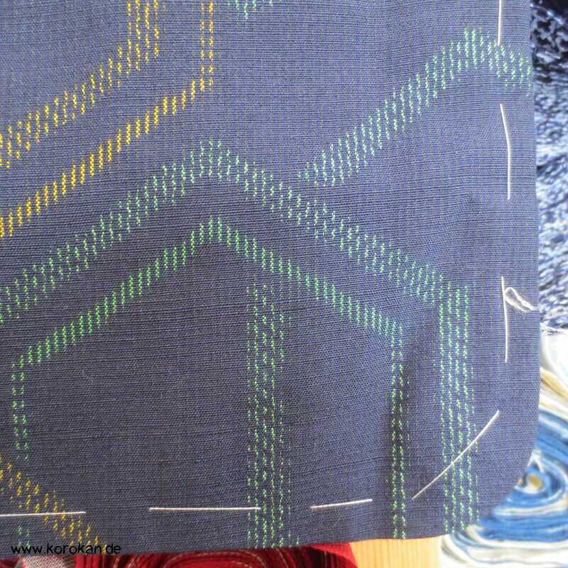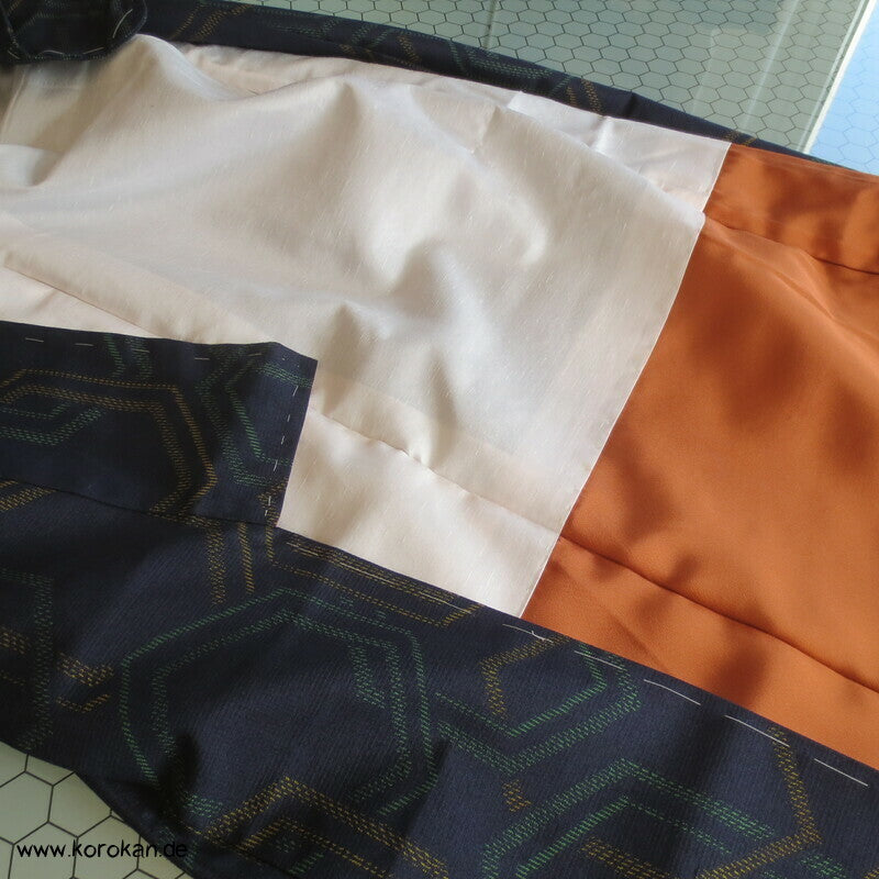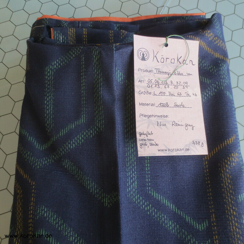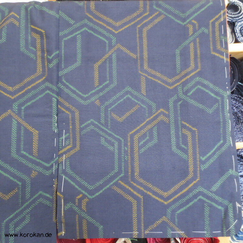 japanischer Vintage Tsumugi Seide Komon Kasuri sich überlagernde Kikko Motive auf dunkelblau, oberes Futter helle Seide, unteres Hakkake Futter Seide rost