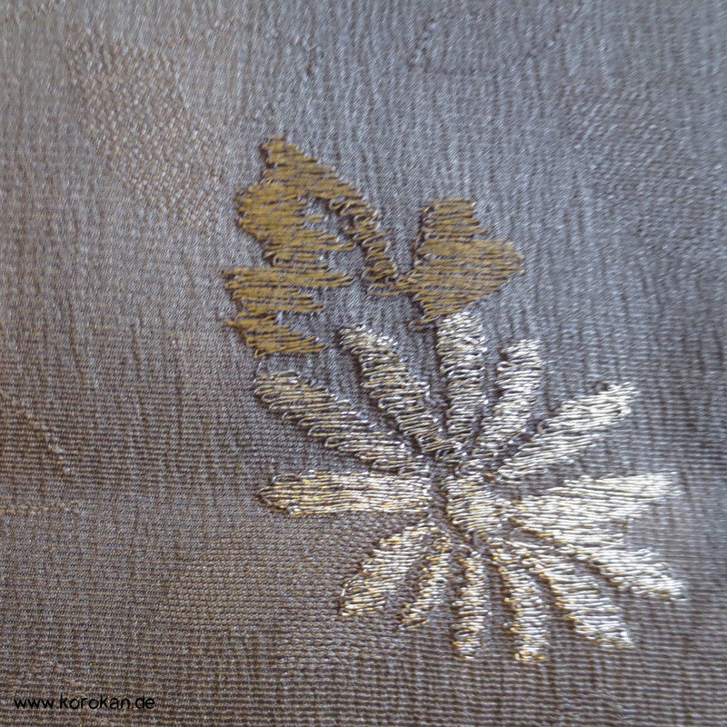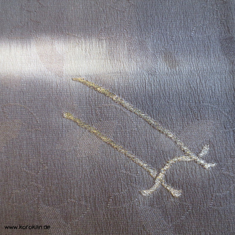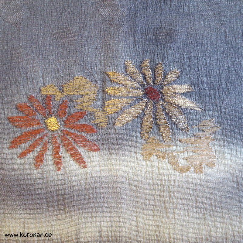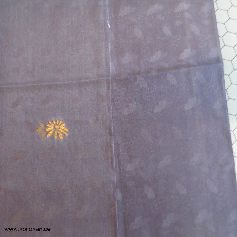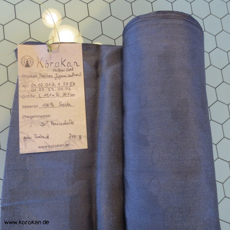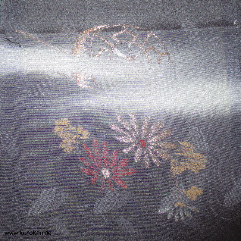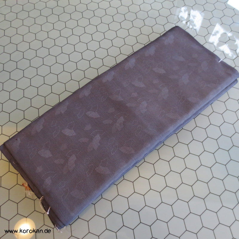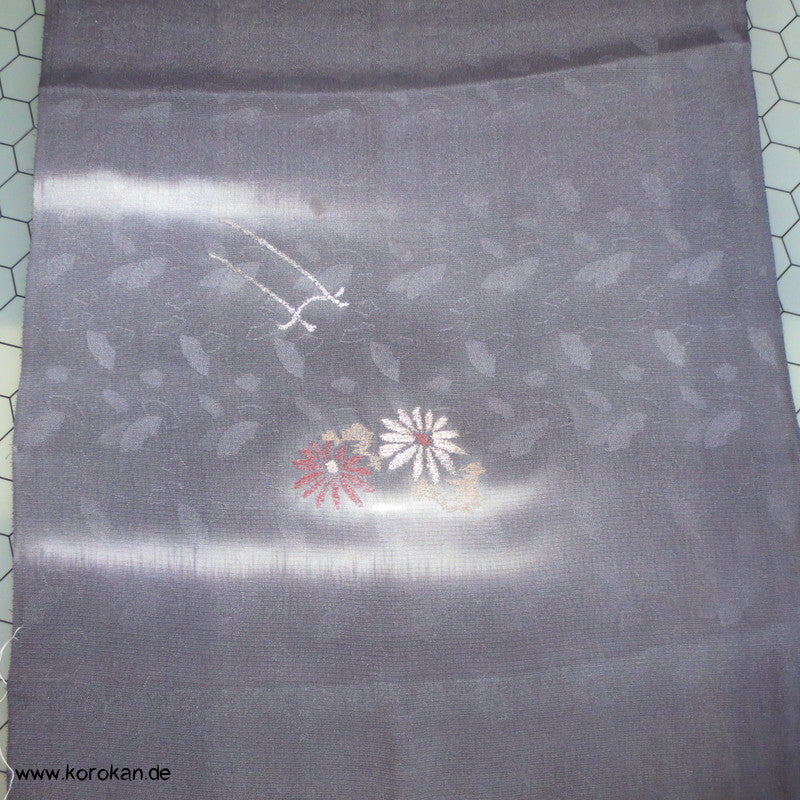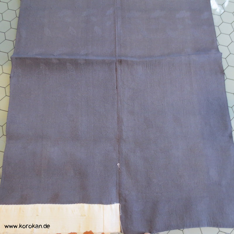Antiker aufgetrennter Kimono, zum Waschen wieder als Stoffrolle zusammengenäht. Seidendamast gewebte kleine Fächer in blauanthrazit mit Farbverlauf teilweise mit Blüten bestickt