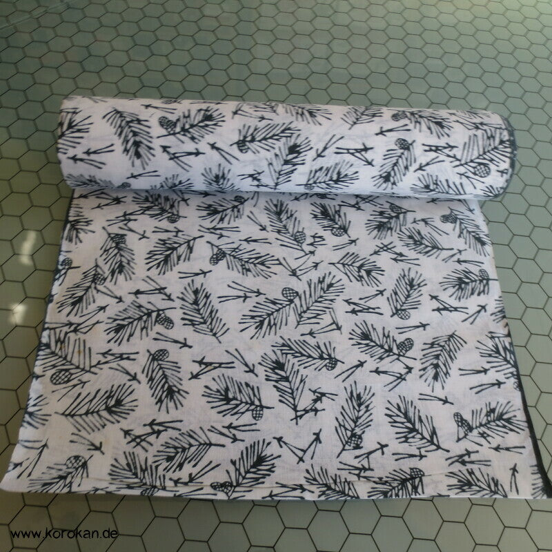 Vintage unbenutzter originalgehefteter Yukata Leinwand Baumwoll Stoff für Sommerkimono mit einem junge Kieferntriebe in dunkelblaugrün auf weiß