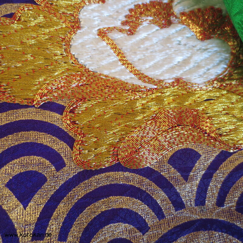 japanischer Vintage Furisode Seidendamast mit gewebten Kranichdiamantrauten Kakeshita langer Hochzeits Kimono, teilbestickt mit viel Goldauflage und Goldfäden. Da der Kimono auch im mittleren Bereich gemustert ist kann man ihn auch als Uchikake Hochzeitsmantel tragen.