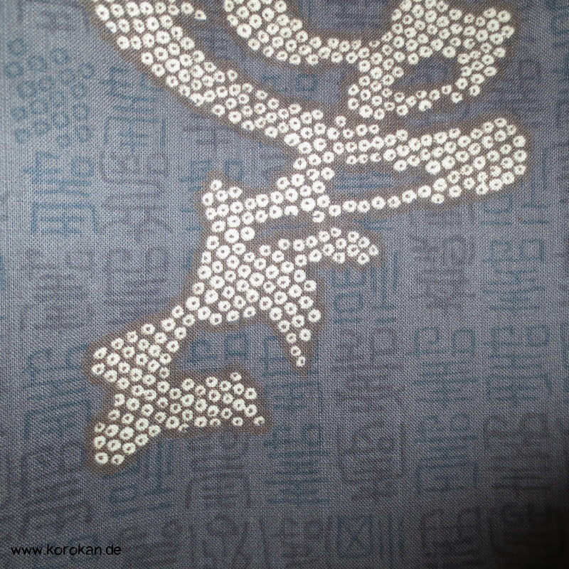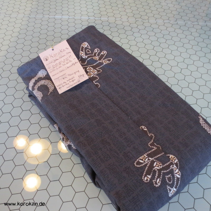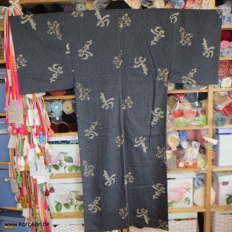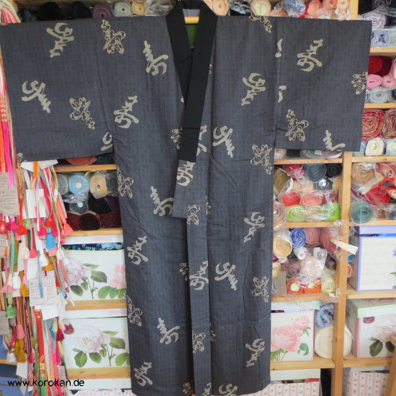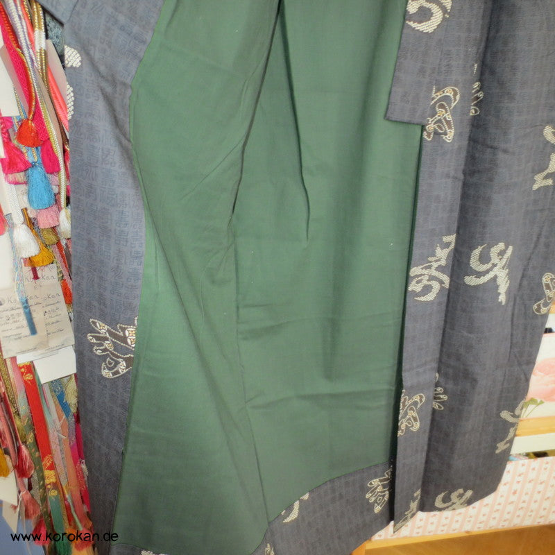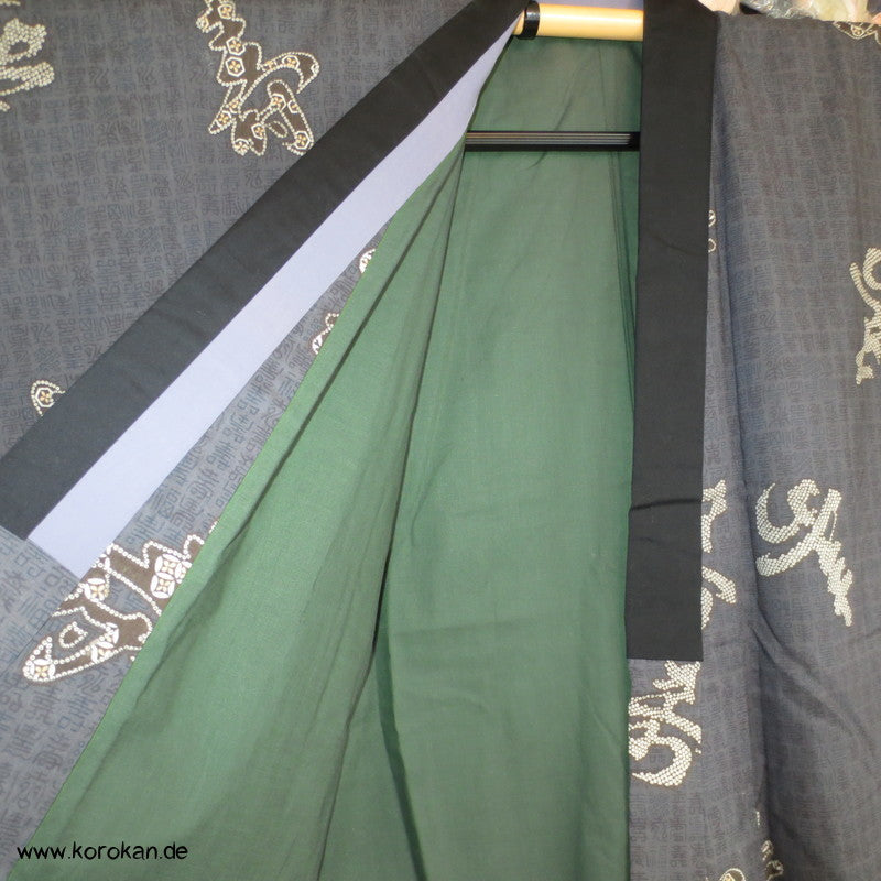 Vintage Männer Juban Unter-/ Kimono aus feinem weichen Woll Musselin bedruckt mit Kanji in groß und klein und grünem Baumwollfutter, schwarzem Satinkragen. Geschnitten wie ein Kimono mit vollem Übertritt und heruntergezogenem Kragen, kann so auch als Hausmantel, Kimono gut getragen werden.