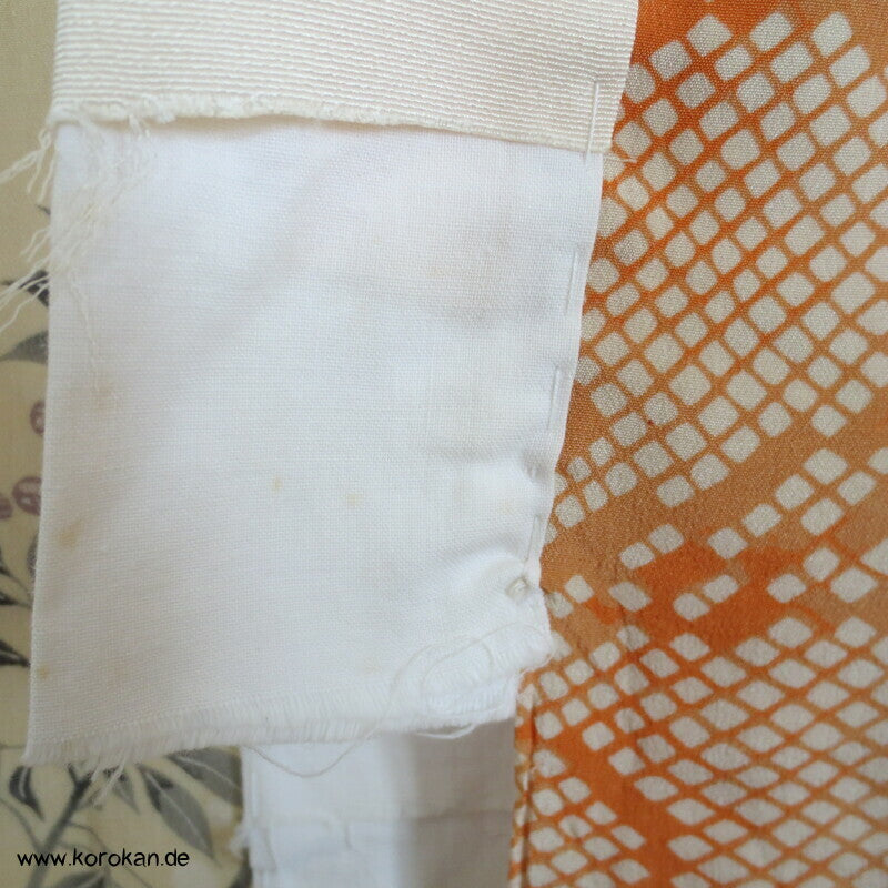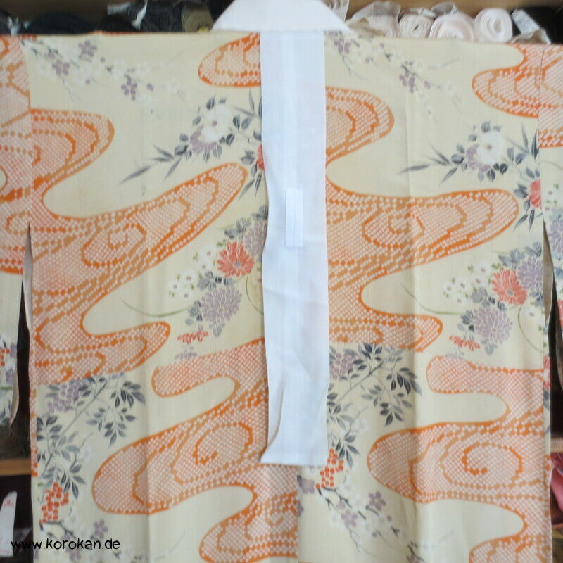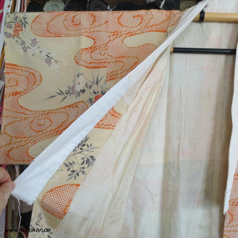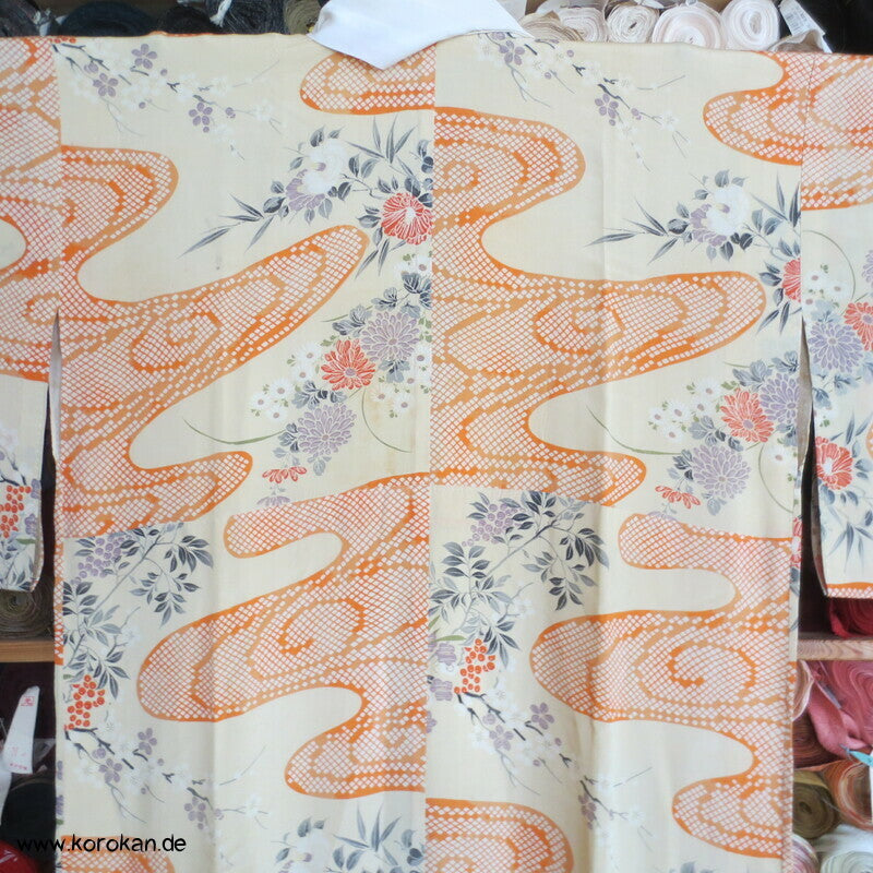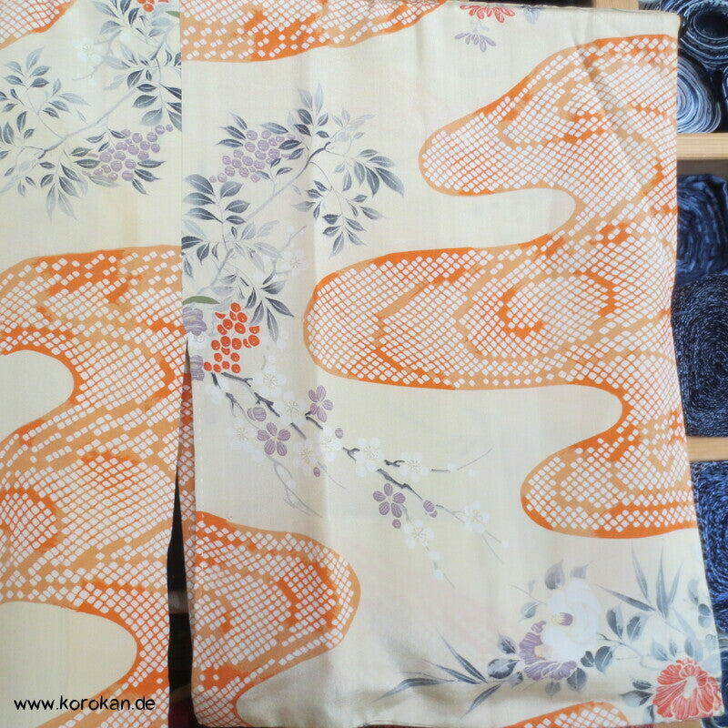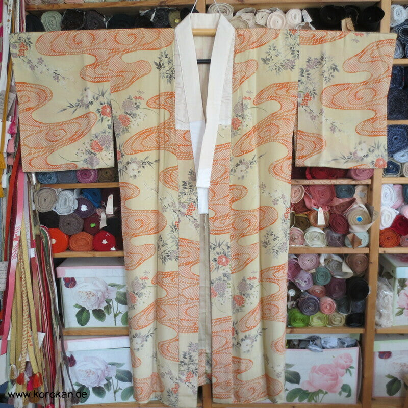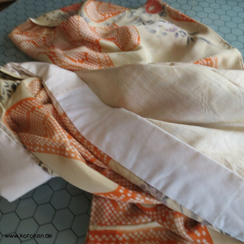 antiker japanischer handgemachter Juban Unter Kimono Seidencrepe mit Kanoko Dot Wasserlauf in mandarine dazwischen lauter unterschiedliche Blumen und Gräser helles Seidenfutter, heller Baumwoll Han Eri
