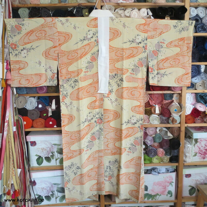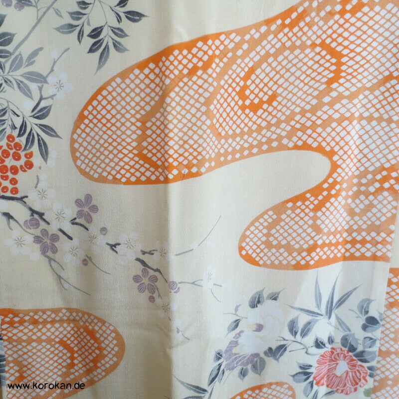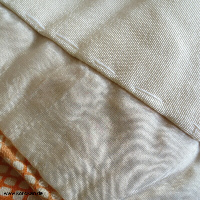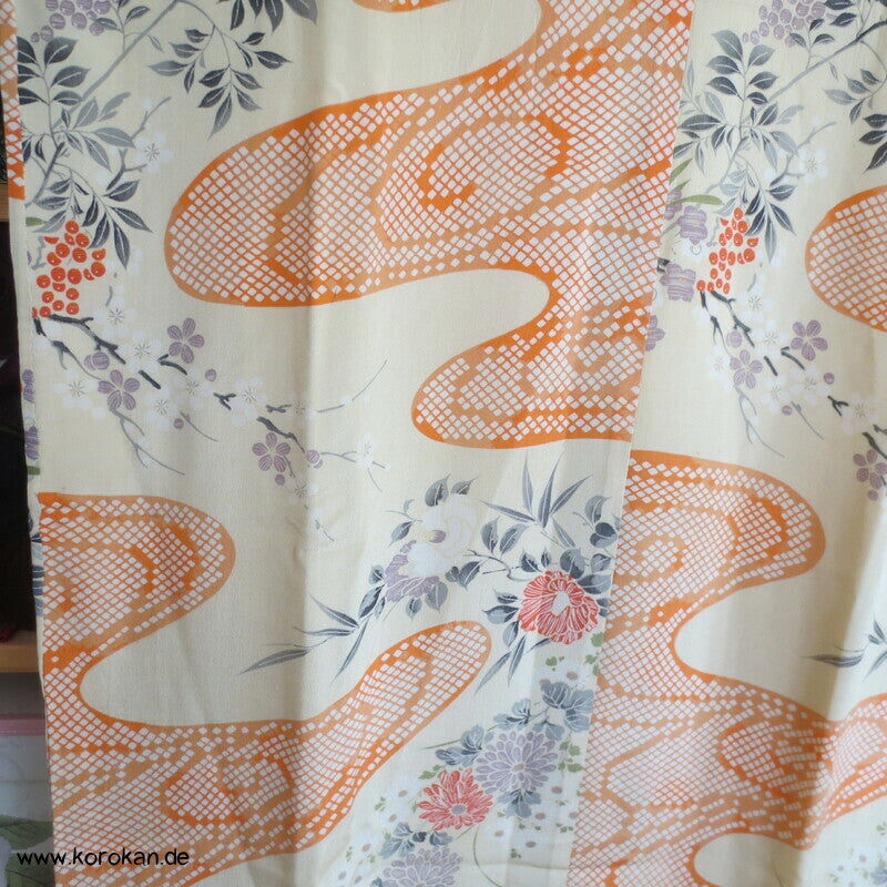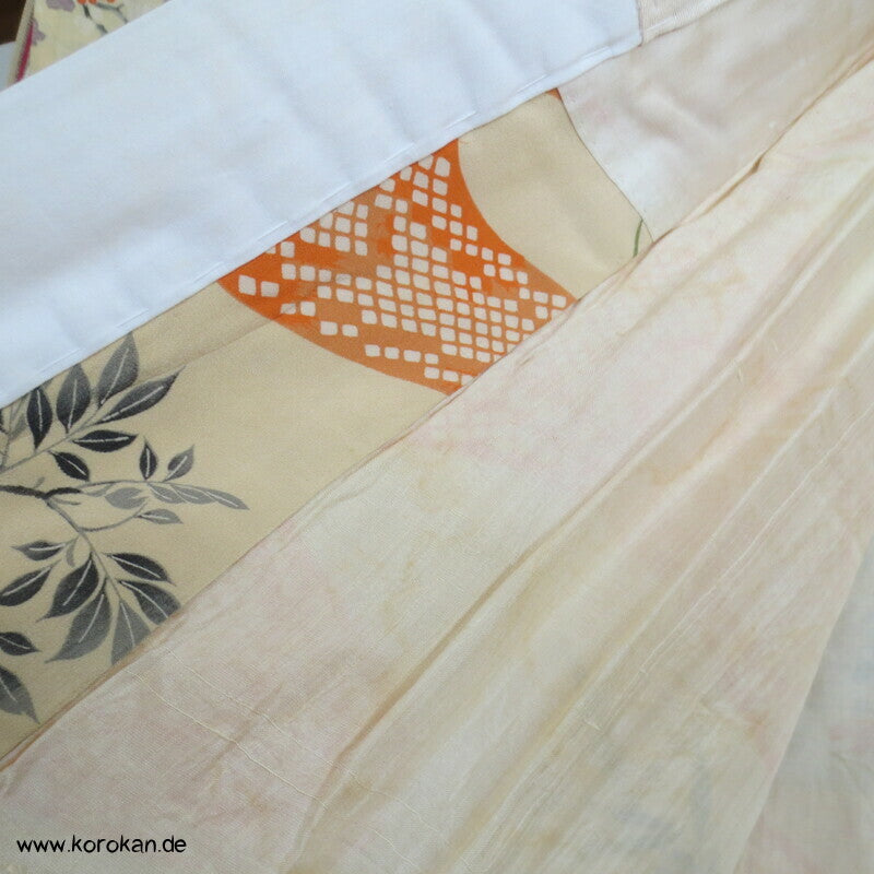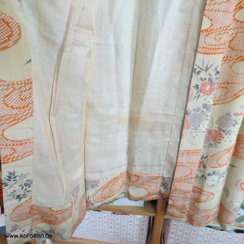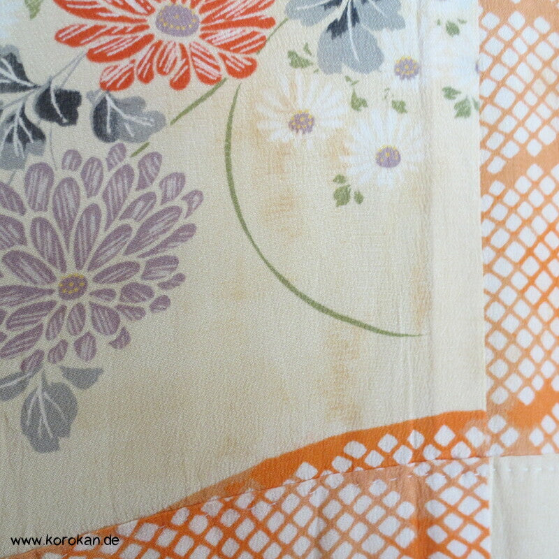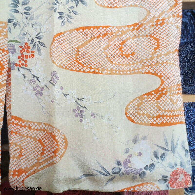 antiker japanischer handgemachter Juban Unter Kimono Seidencrepe mit Kanoko Dot Wasserlauf in mandarine dazwischen lauter unterschiedliche Blumen und Gräser helles Seidenfutter, heller Baumwoll Han Eri