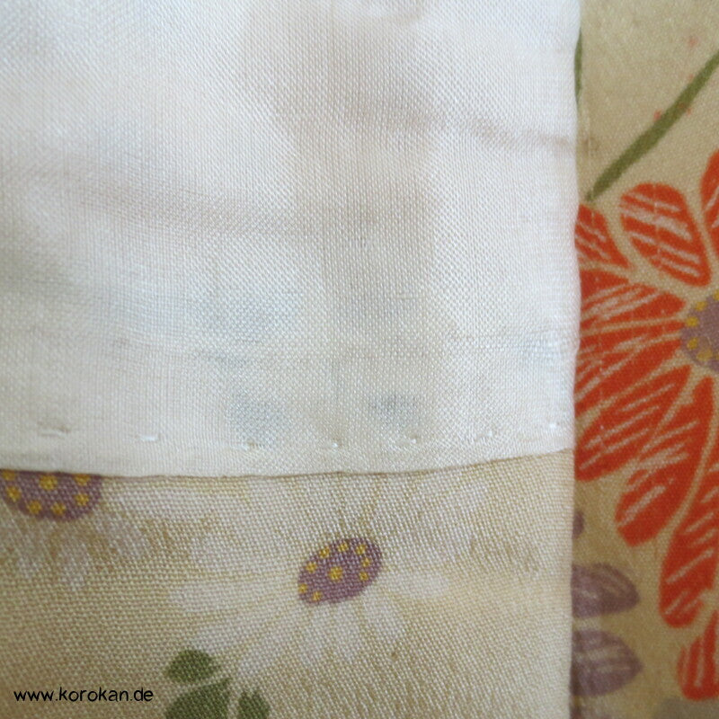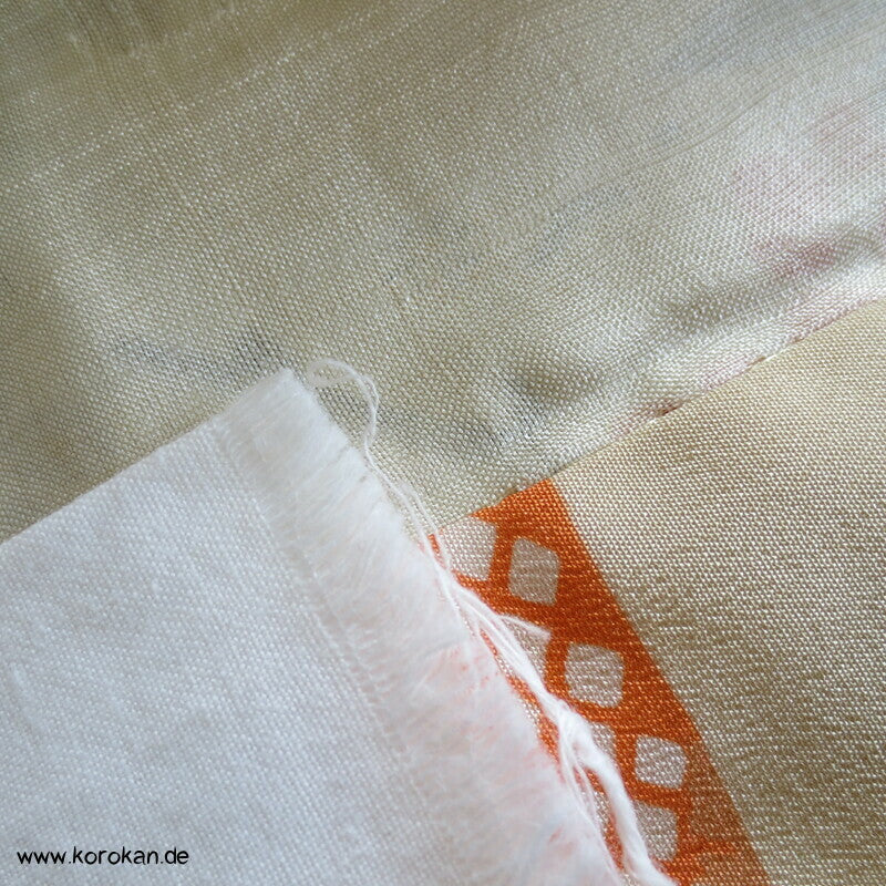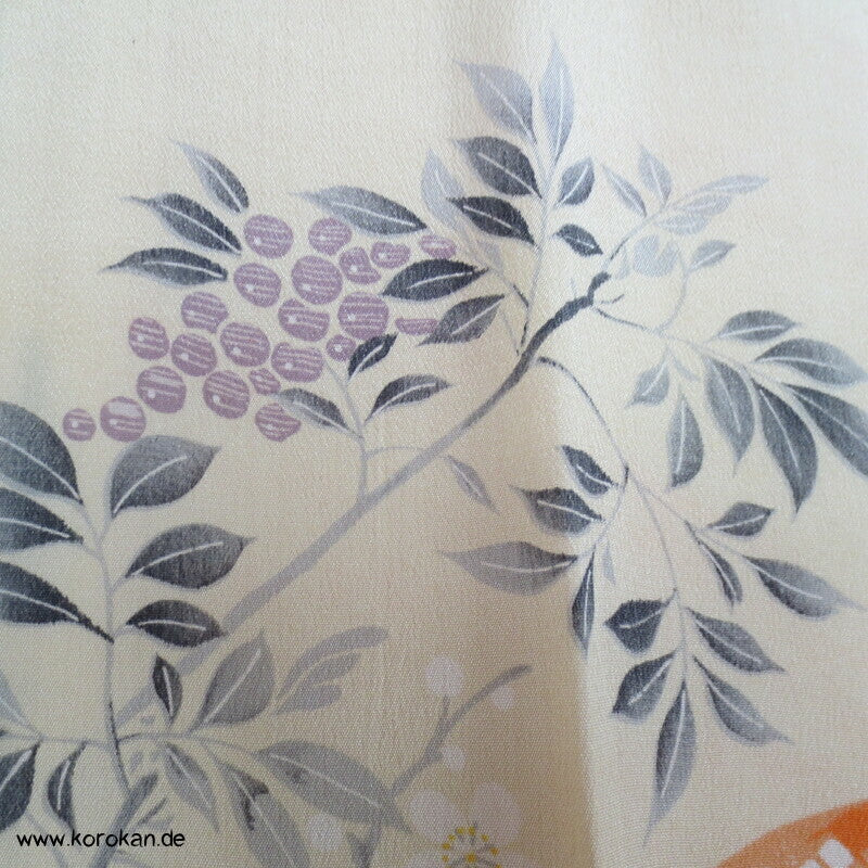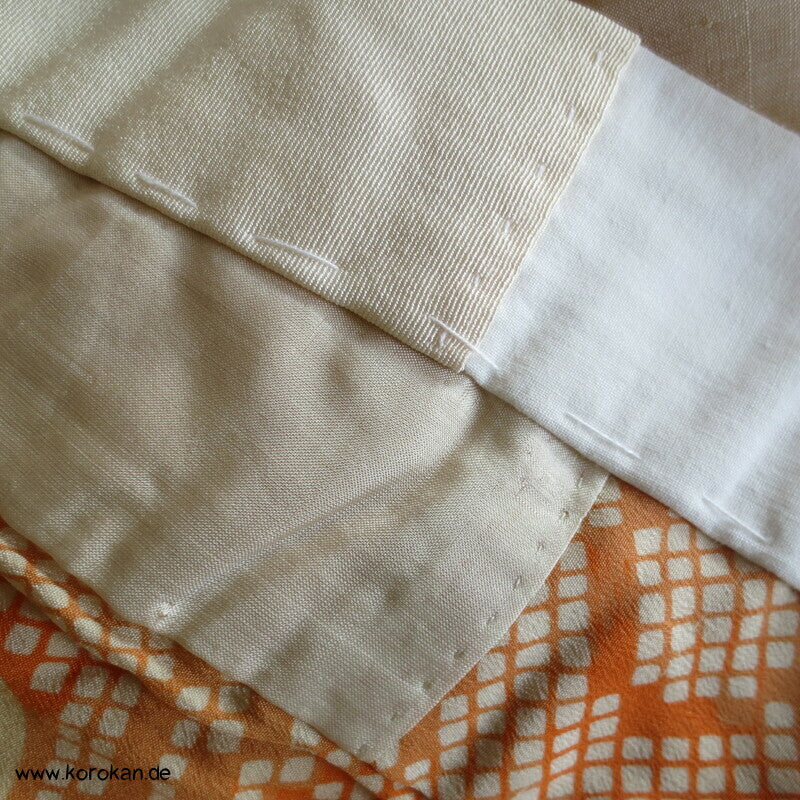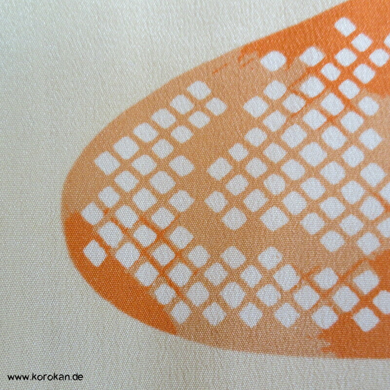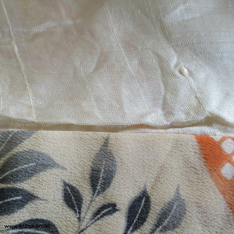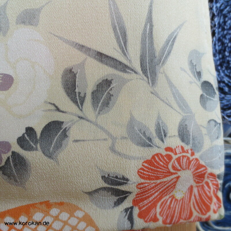 antiker japanischer handgemachter Juban Unter Kimono Seidencrepe mit Kanoko Dot Wasserlauf in mandarine dazwischen lauter unterschiedliche Blumen und Gräser helles Seidenfutter, heller Baumwoll Han Eri