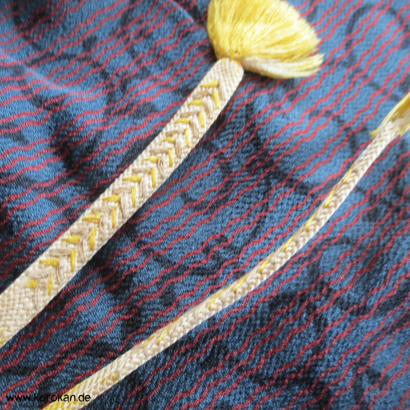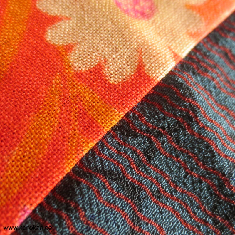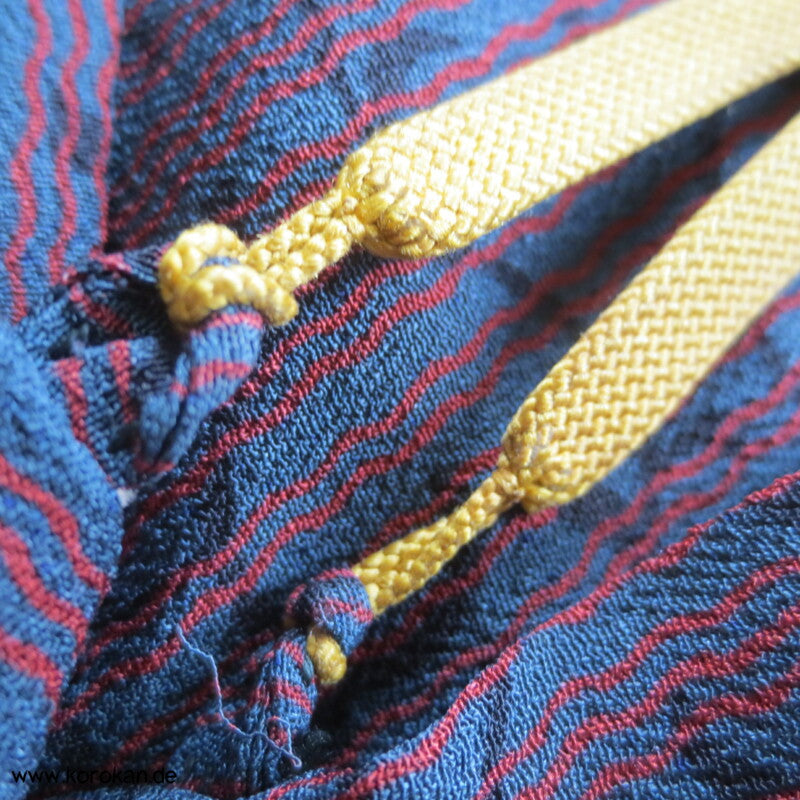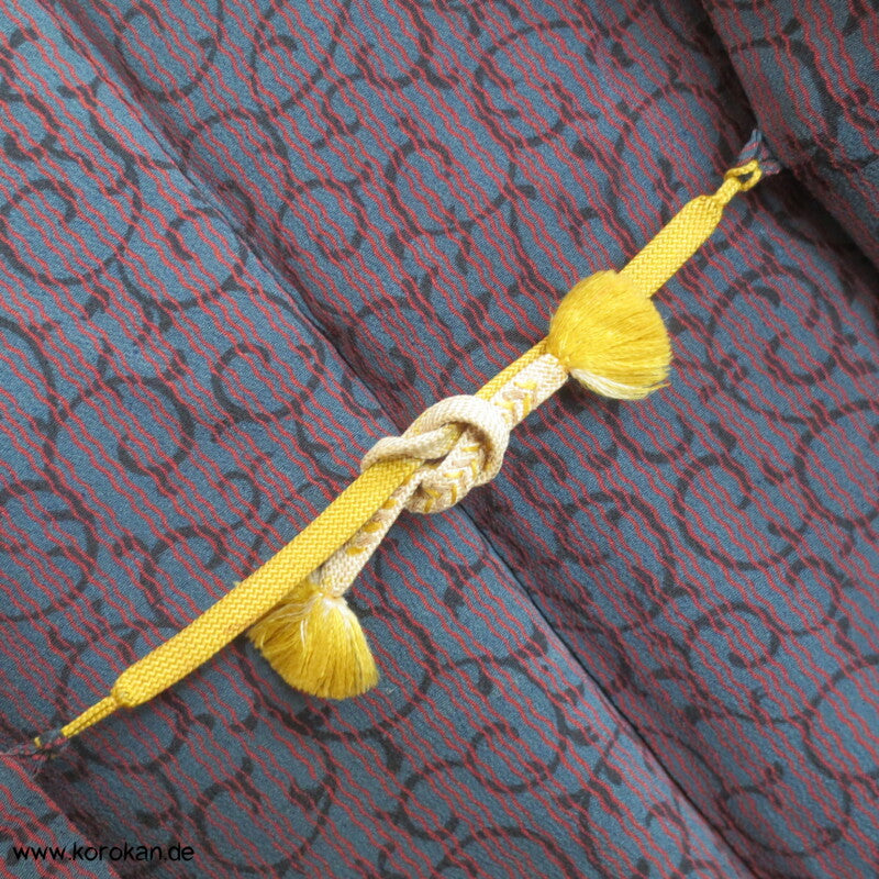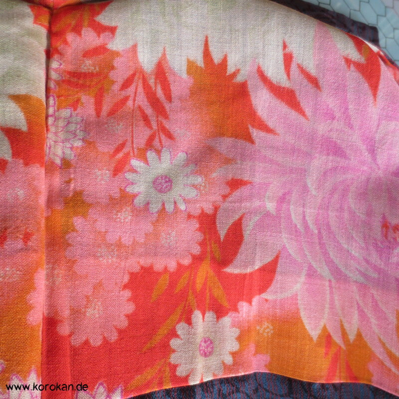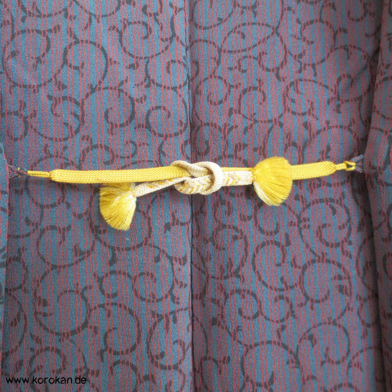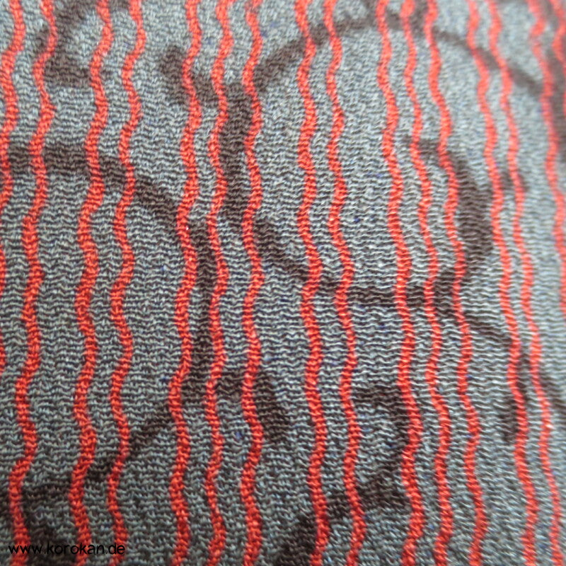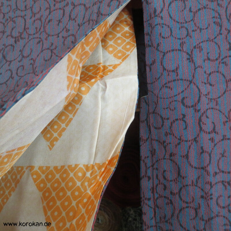 japanische Vintage 1950'er hausgemachte Haori Kimono Jacke Seidencrepe mit Karakusa Arabesken über roten Wellenstreifen auf petrol Grund, oberem qietschbuntem Schulterfutter und bestickten Haori Himo