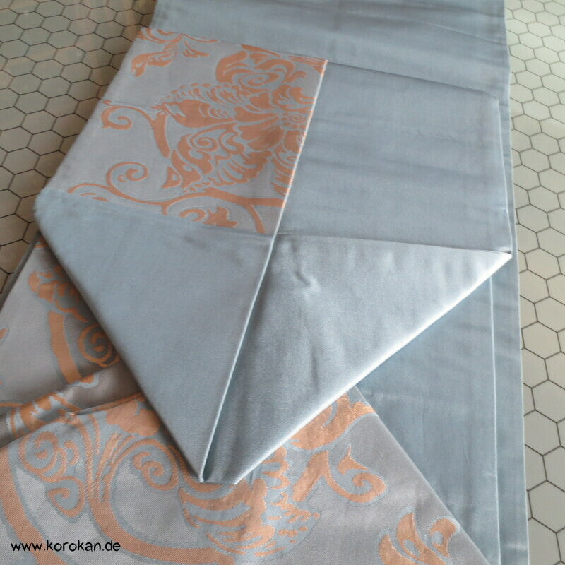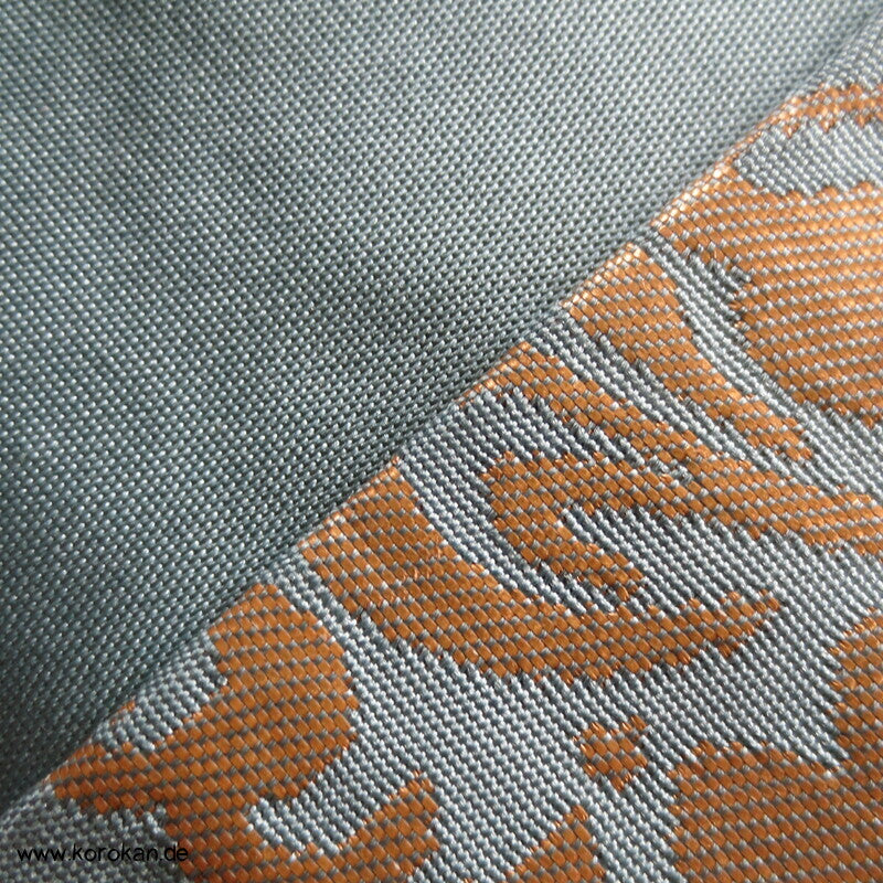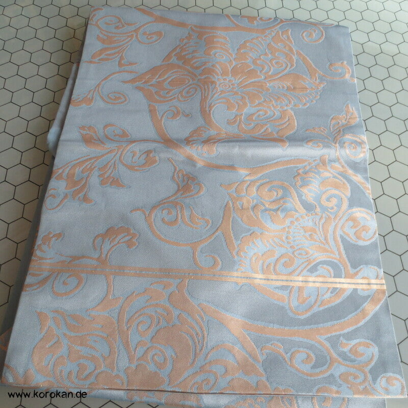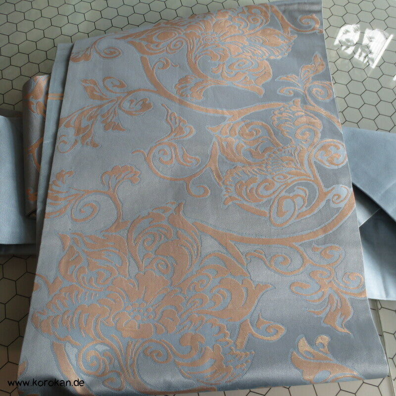 Karakusa Arabesken Nagoya Obi, blassgolden auf hellblau