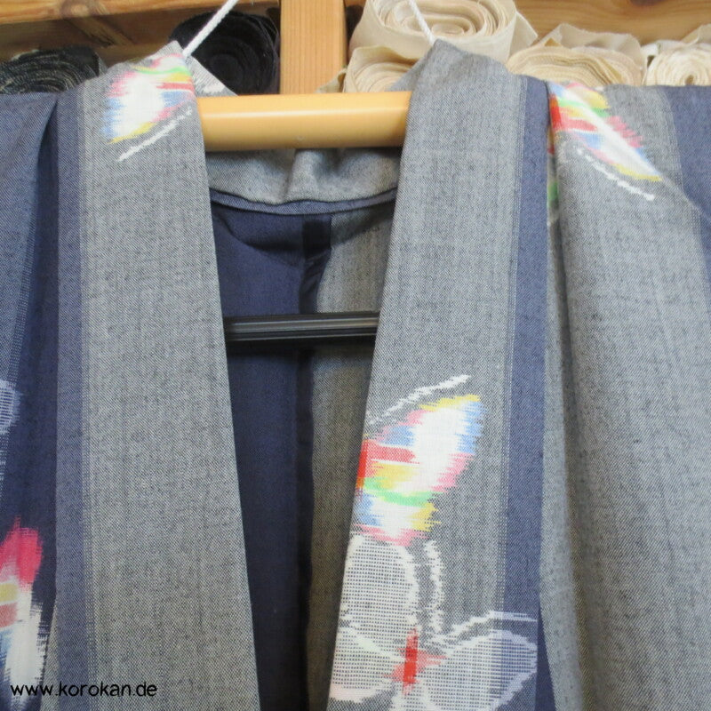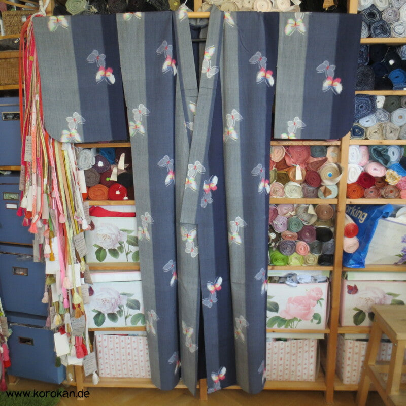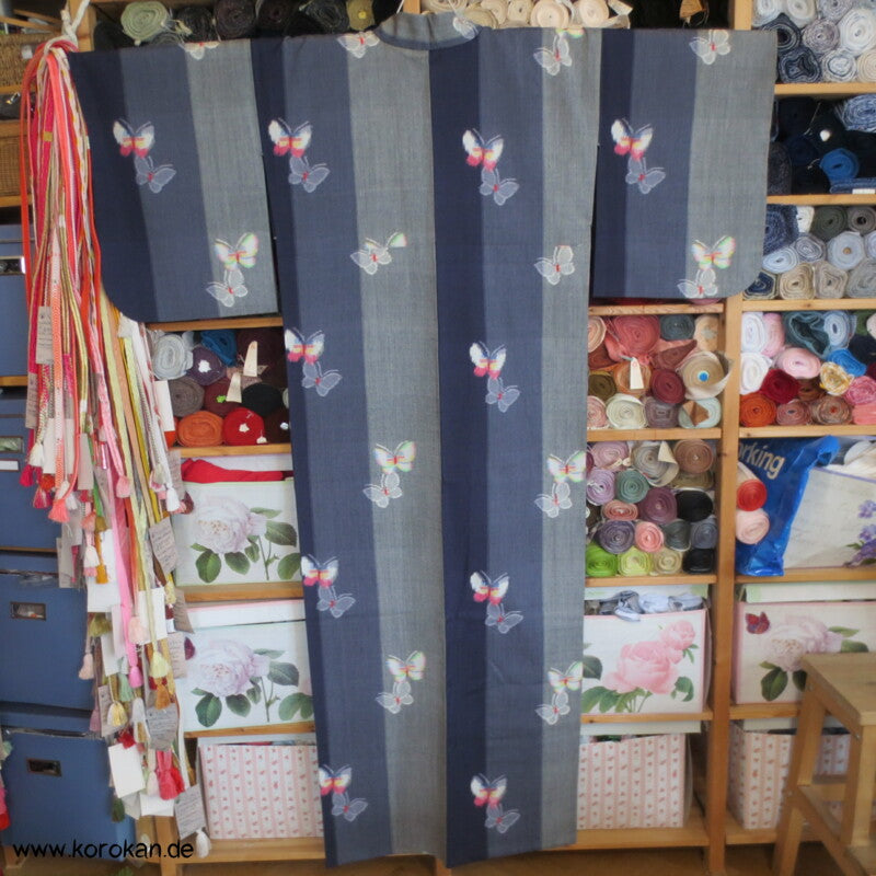 Kasuri Schmetterlinge auf blaugrauen Streifen Woll Hitoe Kimono