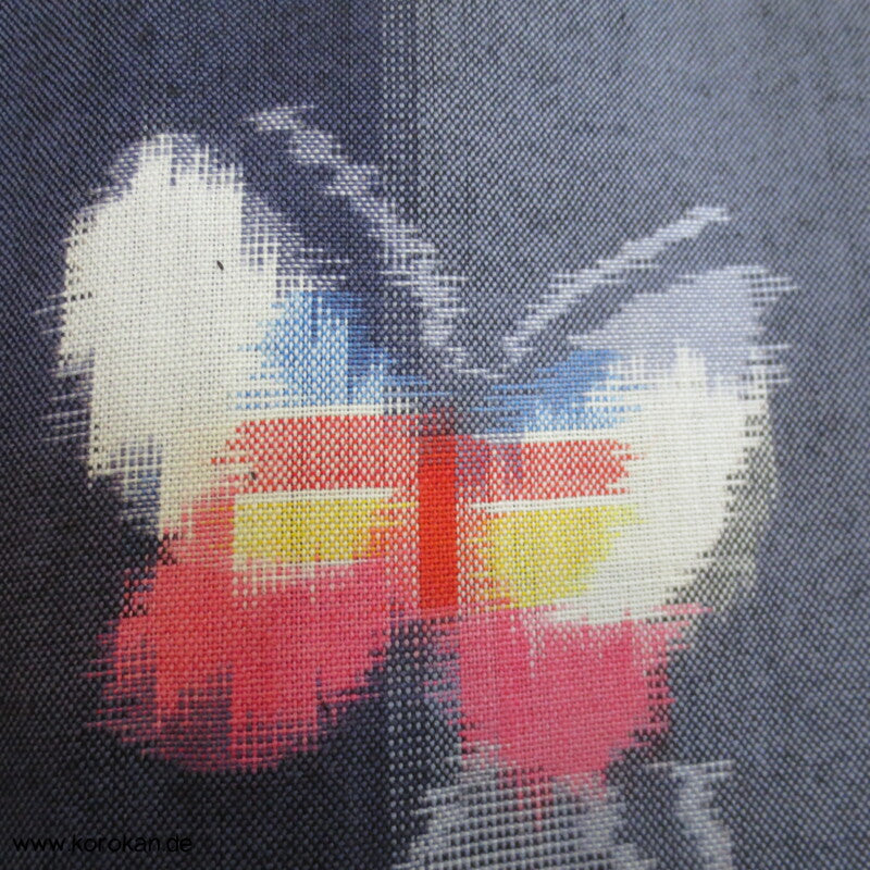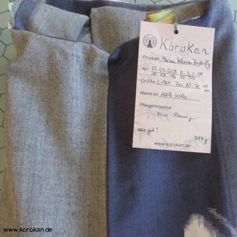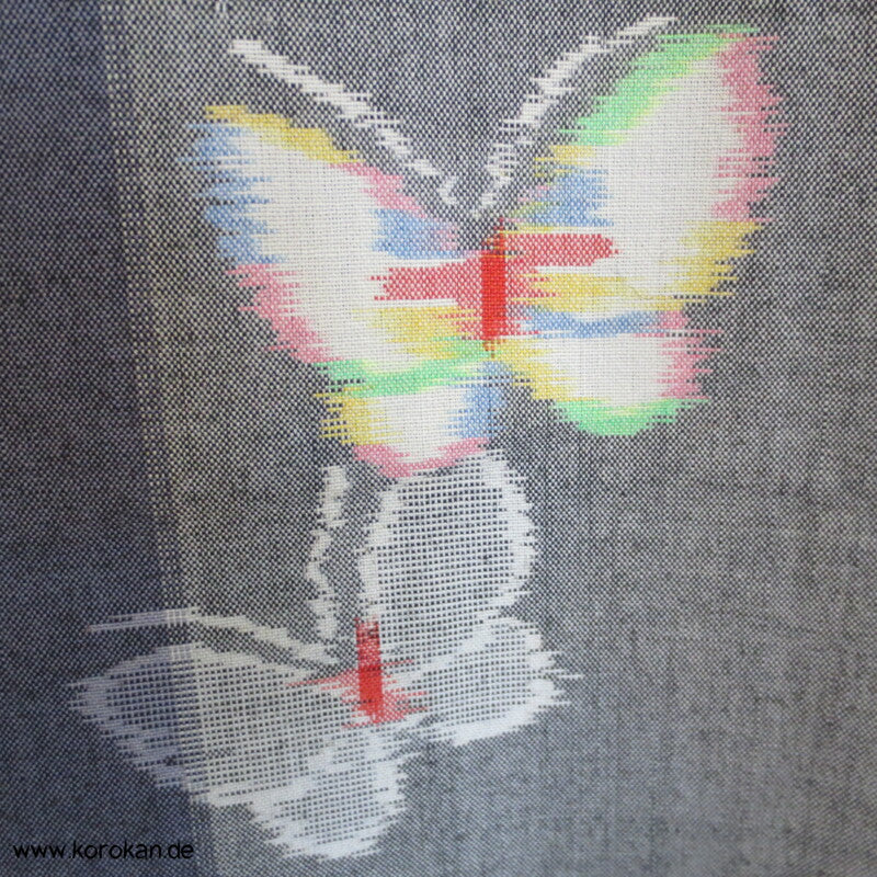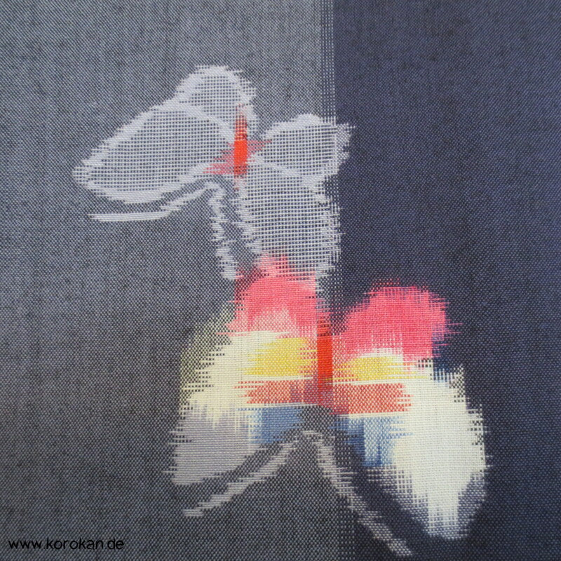 Vintage Hitoe Kasuri Woll Kimono, bunte Schmetterlinge auf blaugrau, garngefärbtes Muster.