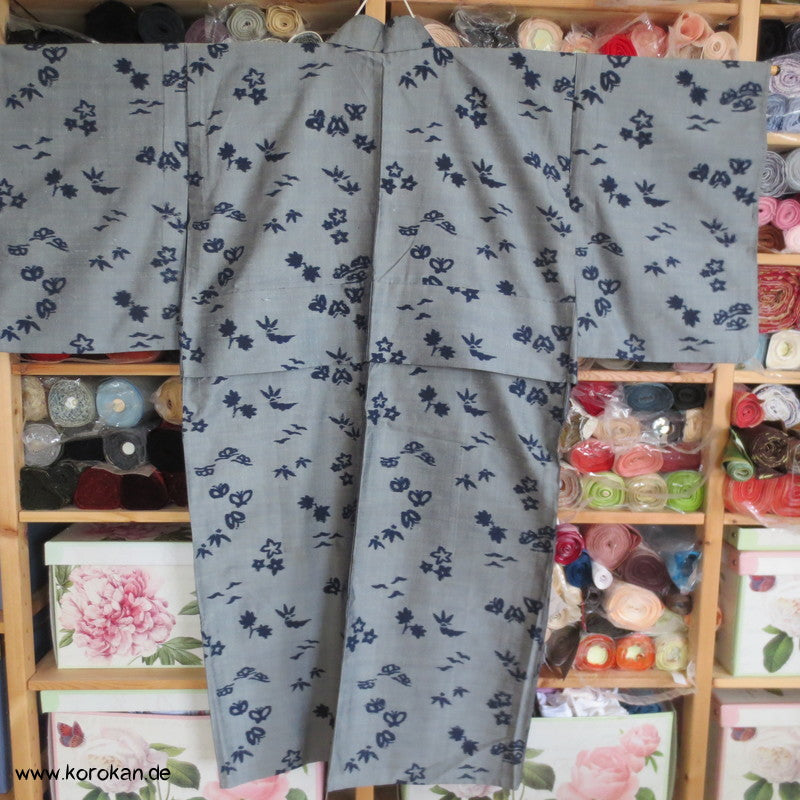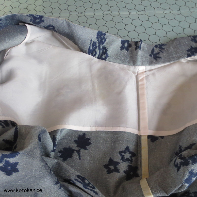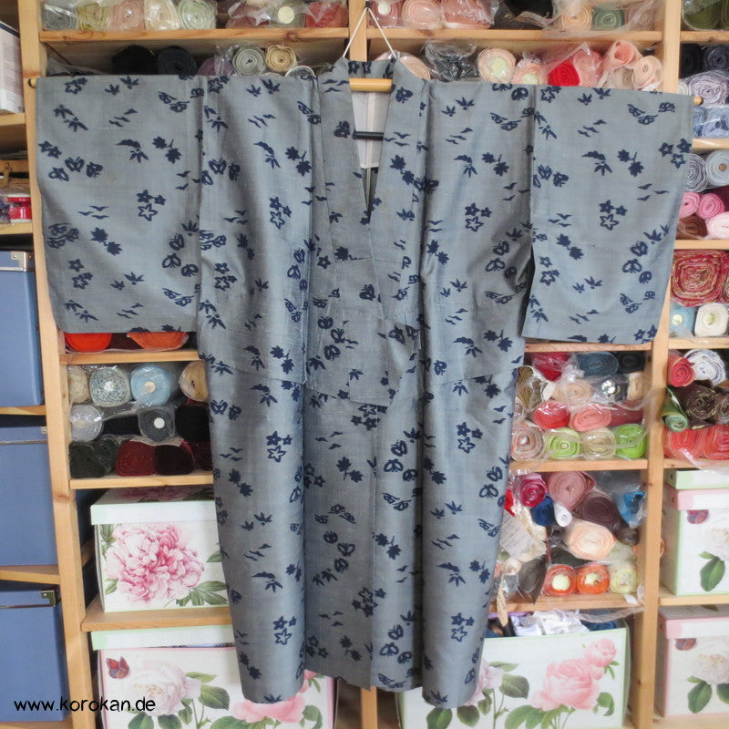 Vintage Hitoe ungefütterter Tsumugi Seiden Kimono mit Kasuri Schmetterlings und Blütenmuster eingewebt - mit tiefer Taillenfalte - so kurz, dass er als Morgenmantel getragen werden kann.