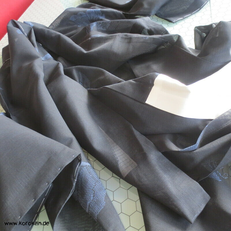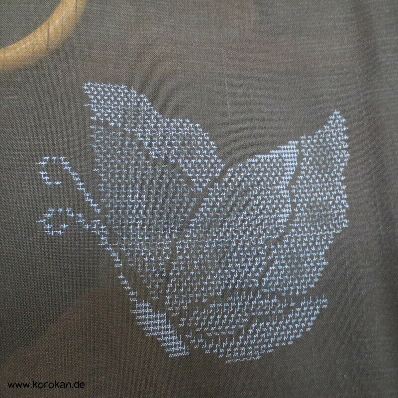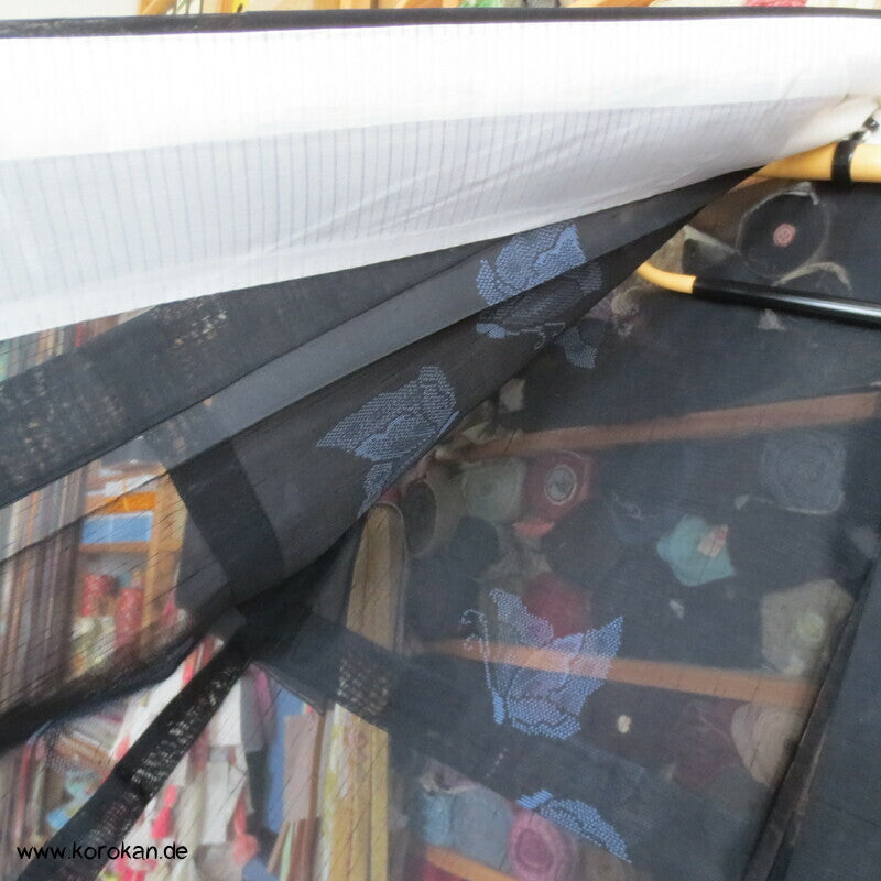 Vintage Sha Muster Drehergewebe Seide Kimono mit Kasuri garngefärbte Schmetterlings Motiven, für den Sommer oder als Negligée, teilgefüttert im unteren Rücken mit weißer Rho Seide