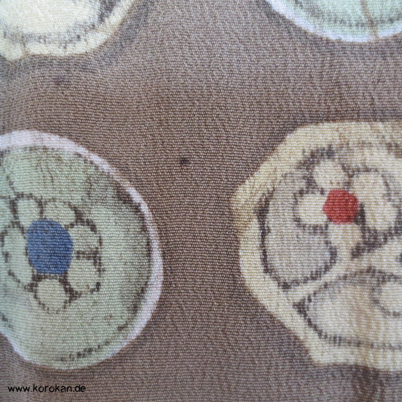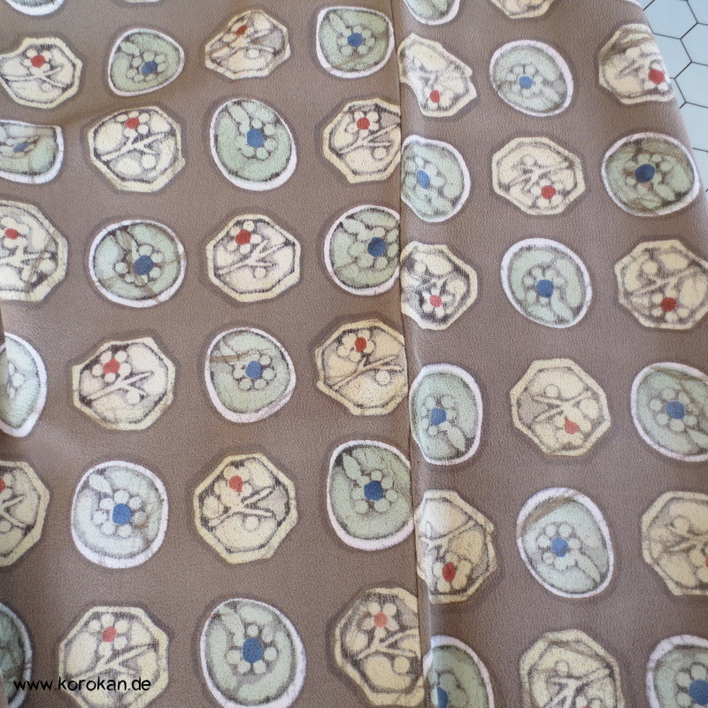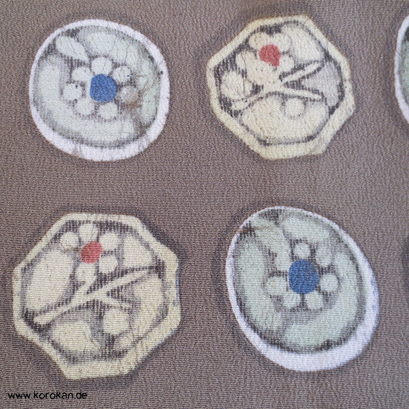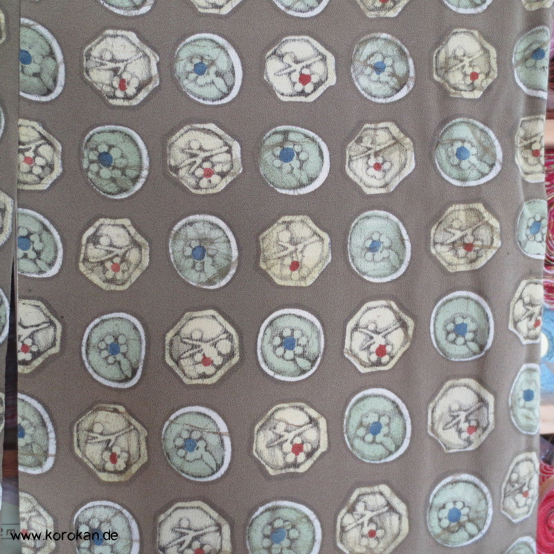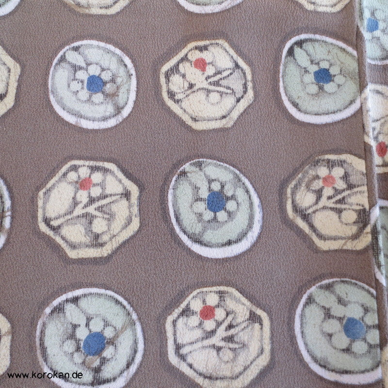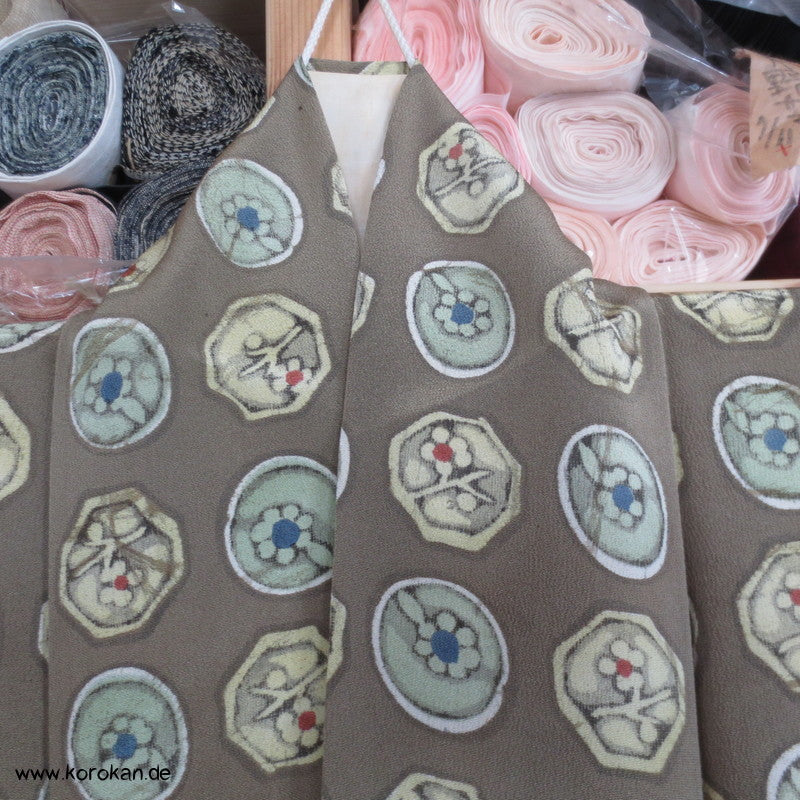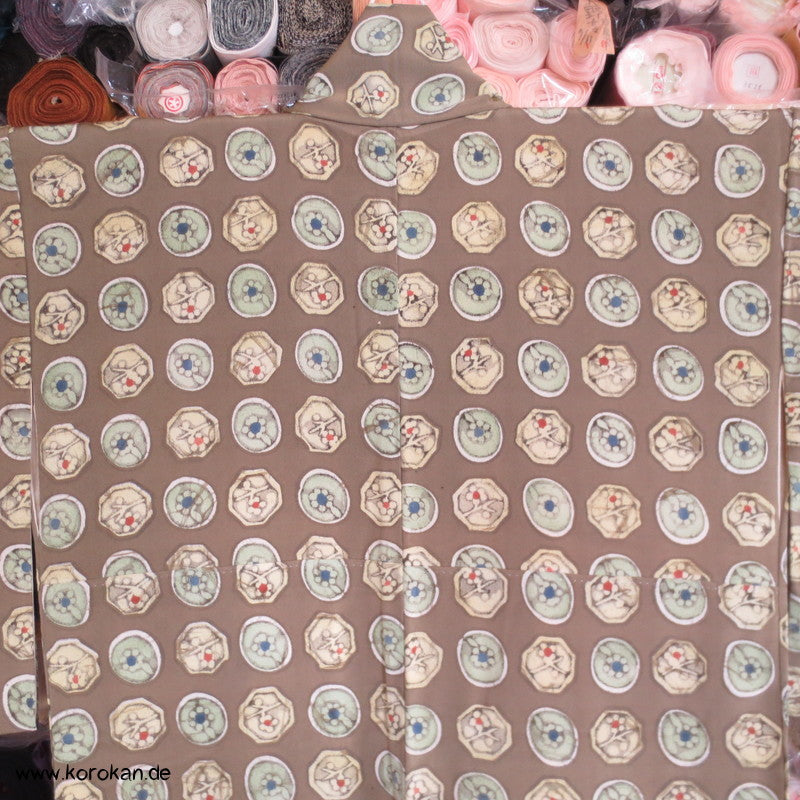 Vintage Komon Kimono Wachsbatik Rondelle mit Mustern auf taupe Chirimen Seidencrepe, oberen hellen stark nachgedunkelten wolkigen Seiden Futter und unterem Hakkake Futter jadegraue Seide