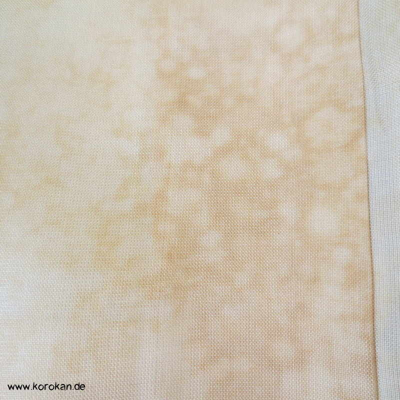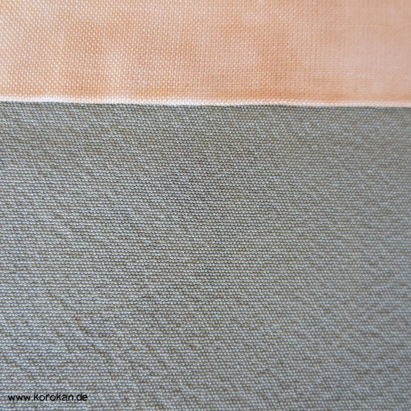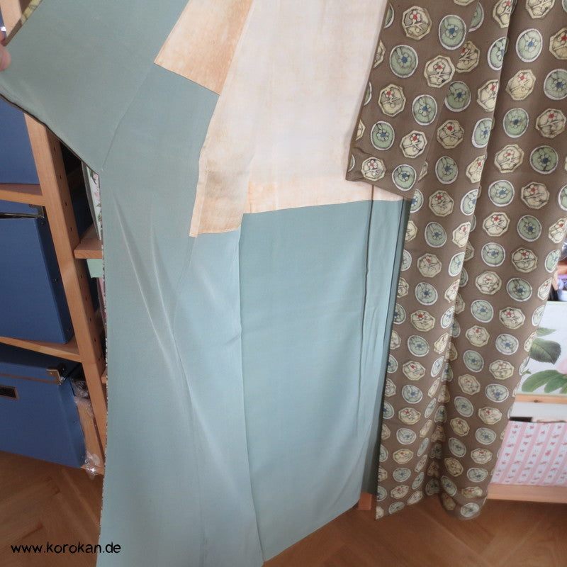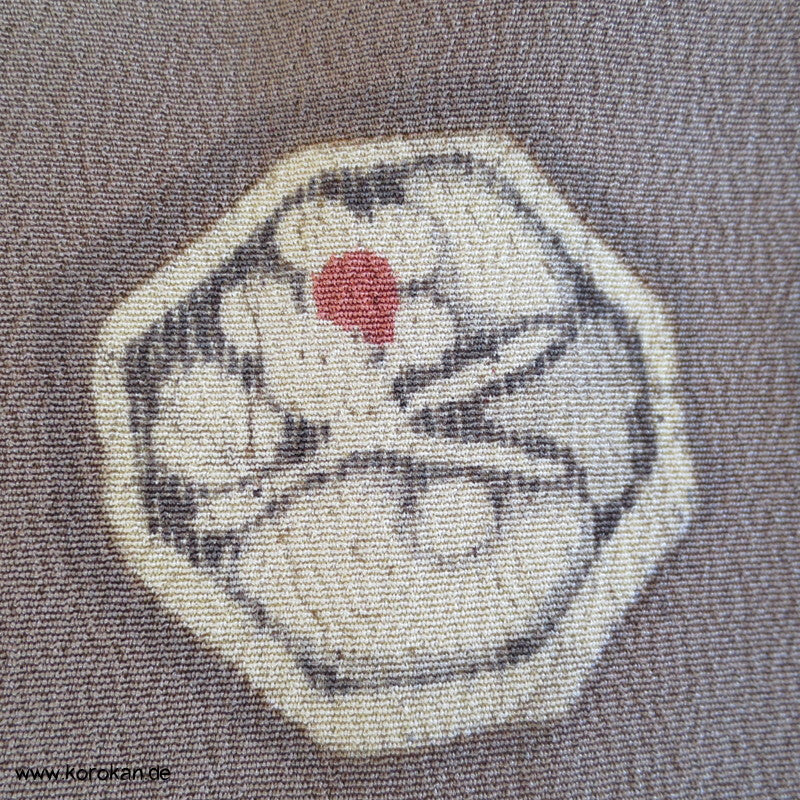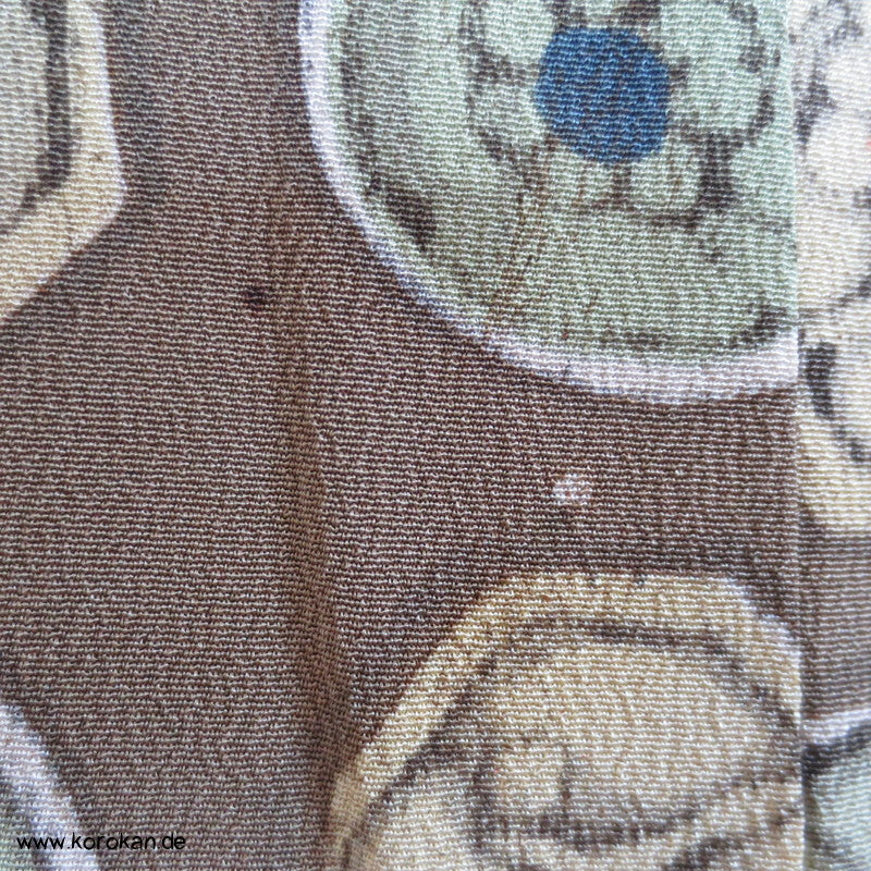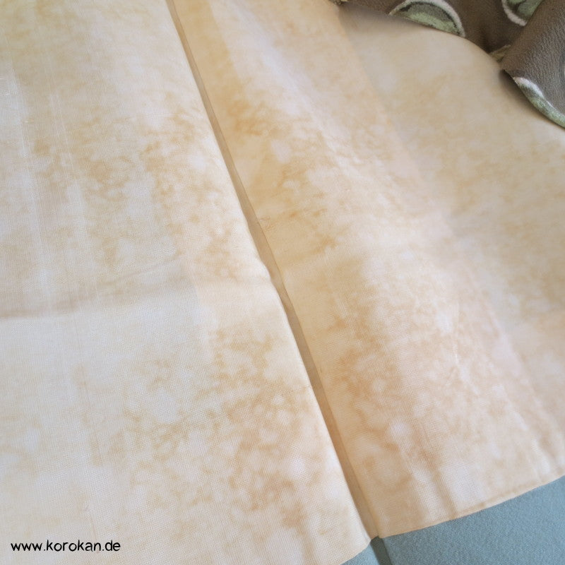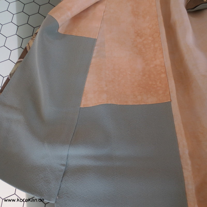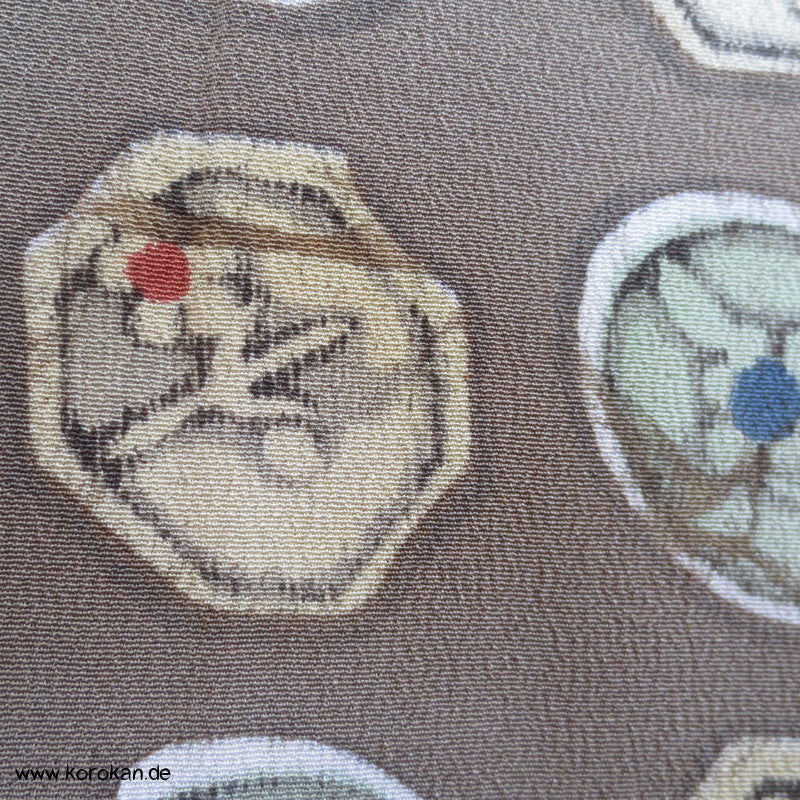 Vintage Komon Kimono Wachsbatik Rondelle mit Mustern auf taupe Chirimen Seidencrepe, oberen hellen stark nachgedunkelten wolkigen Seiden Futter und unterem Hakkake Futter jadegraue Seide