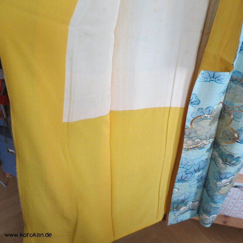 Vintage Homongi Kimono hellblauer Seidendamast mit azurblauen Kiefern in Shibori Technik, teils goldbestickt, feinem oberen hellen Seidenfutter und unterem Hakkake Seidenfutter gelb.